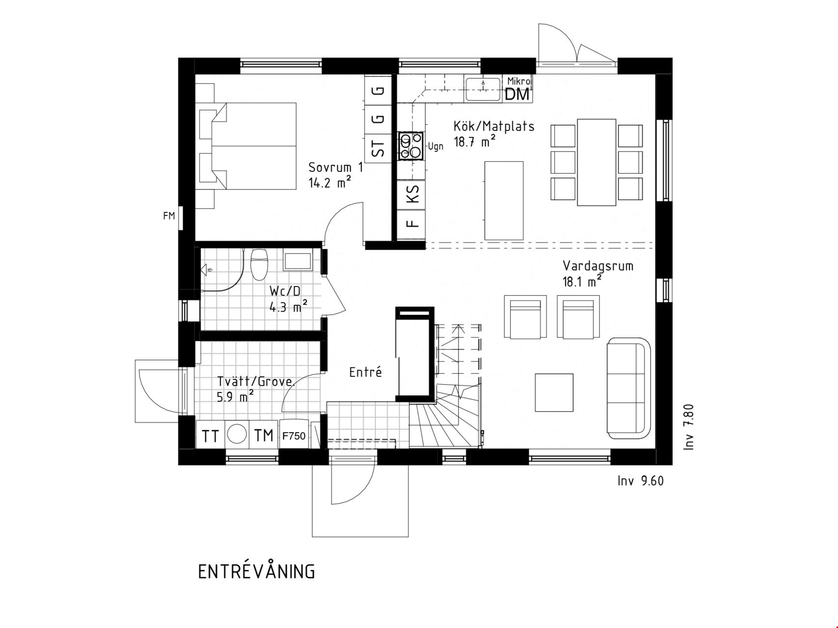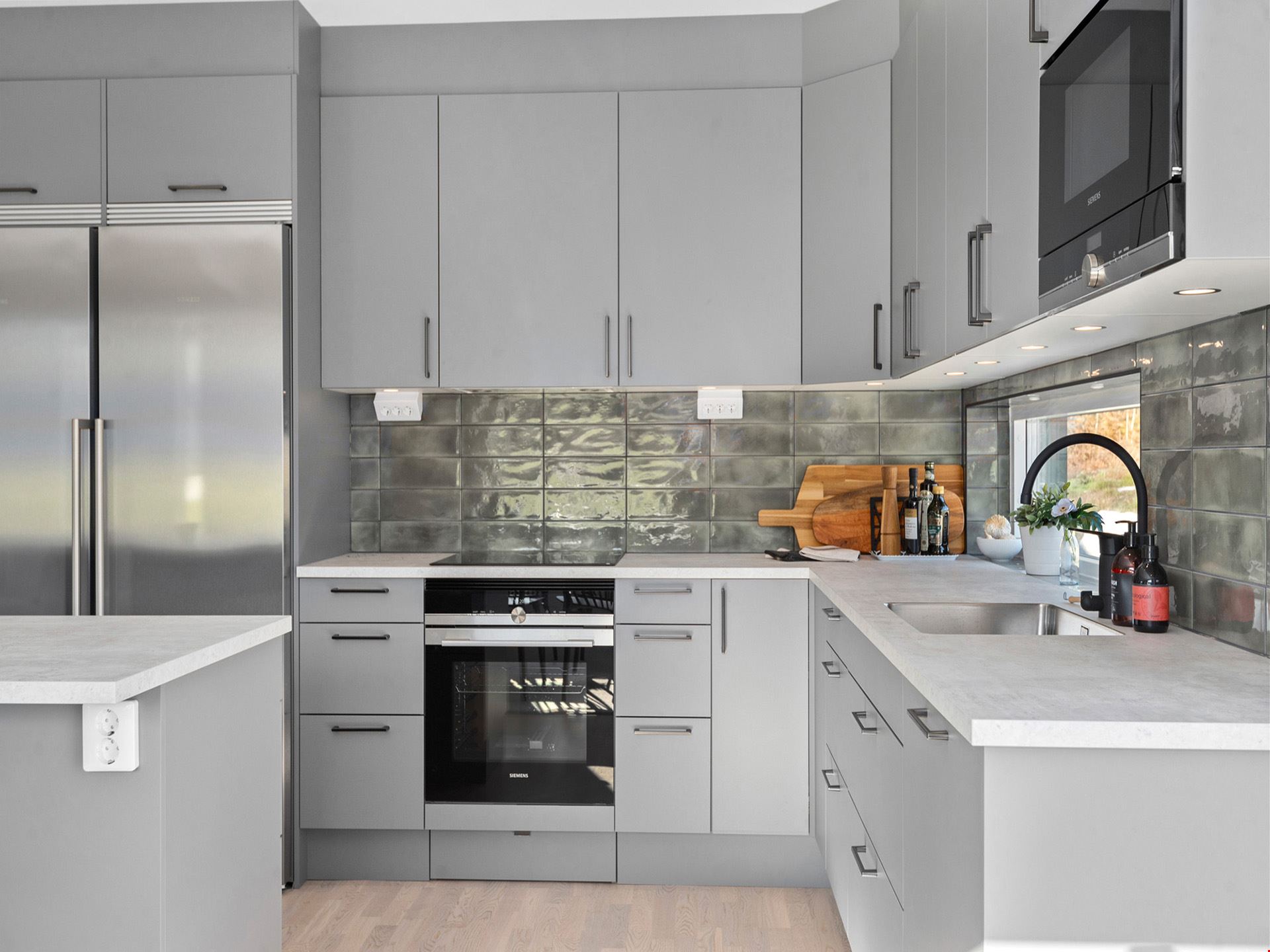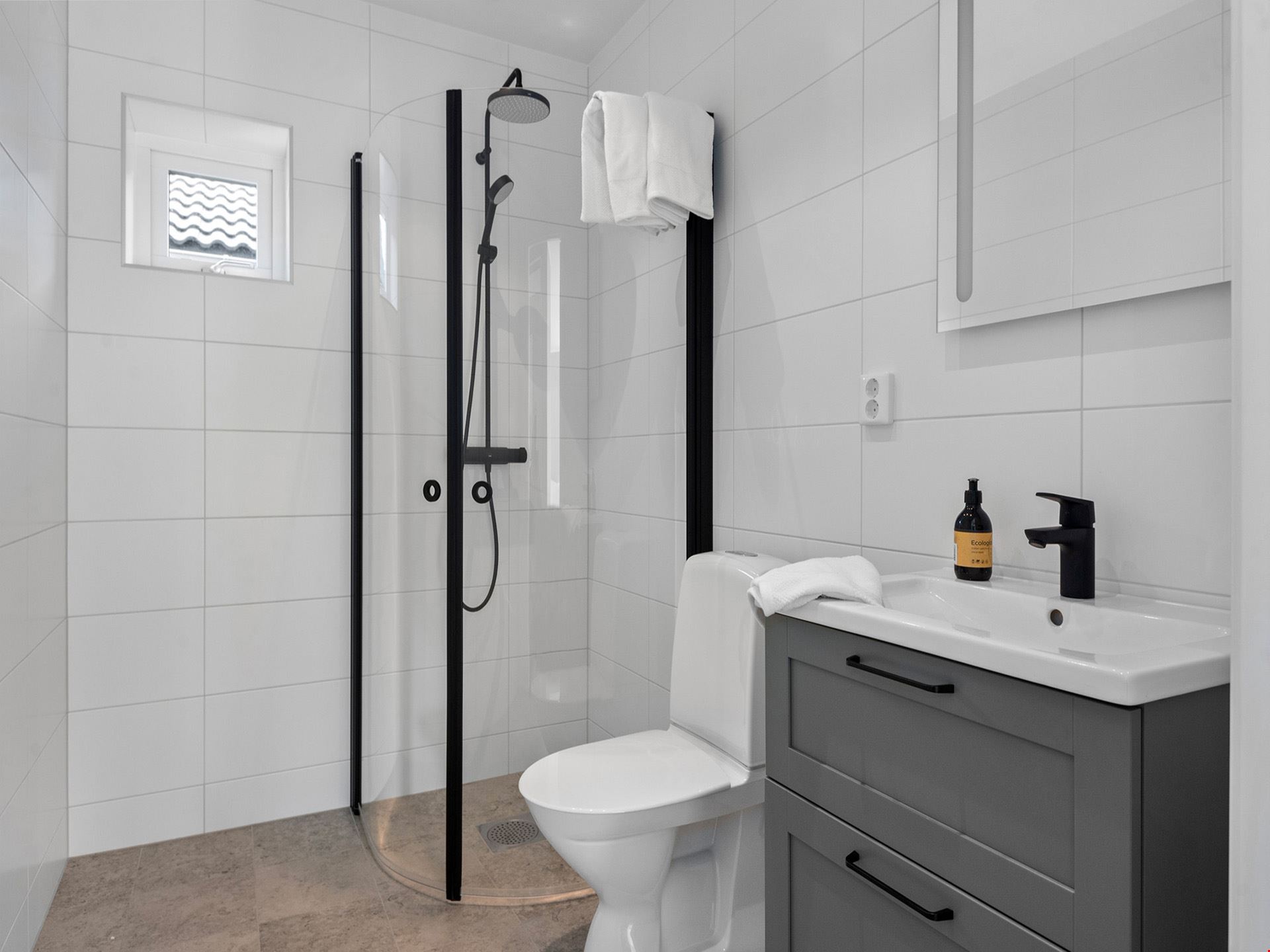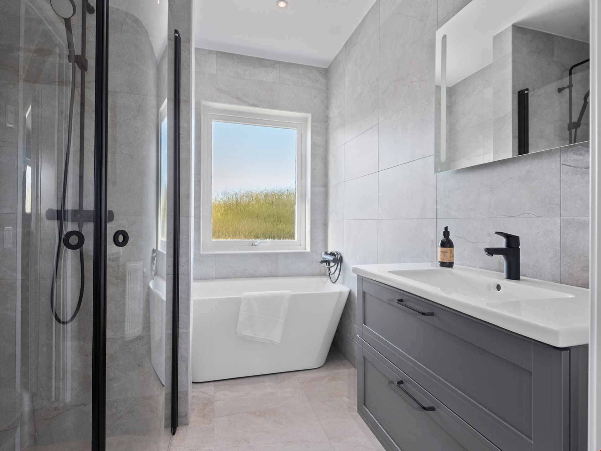 Köket kommer vara utrustad med en hög standard och inrett med en köksö. Köket kommer bestå av grå luckor med en bänkskiva gjord av laminat i stil av ljus betong samt rostfria vitvaror. Där ingår alla hushållsapparater som du behöver som inbyggnadsugn, mikro, kyl, frys, spishäll, frihängande rostfri fläkt, diskmaskin, dämpade fullutdragslådor och mjukstängande luckor. Badrummen är inredda med kakel och klinker, duschväggar och gråa kommoder.