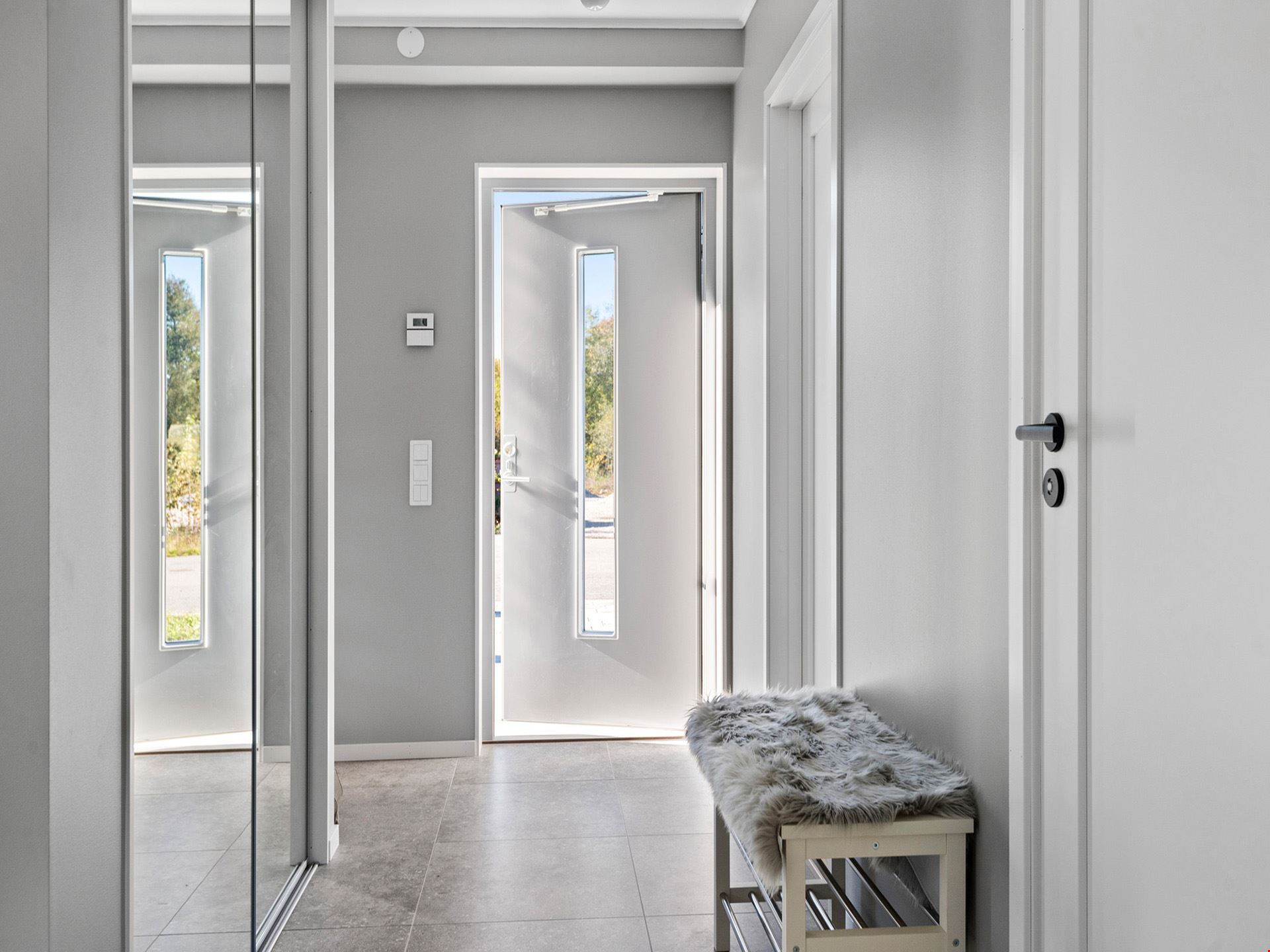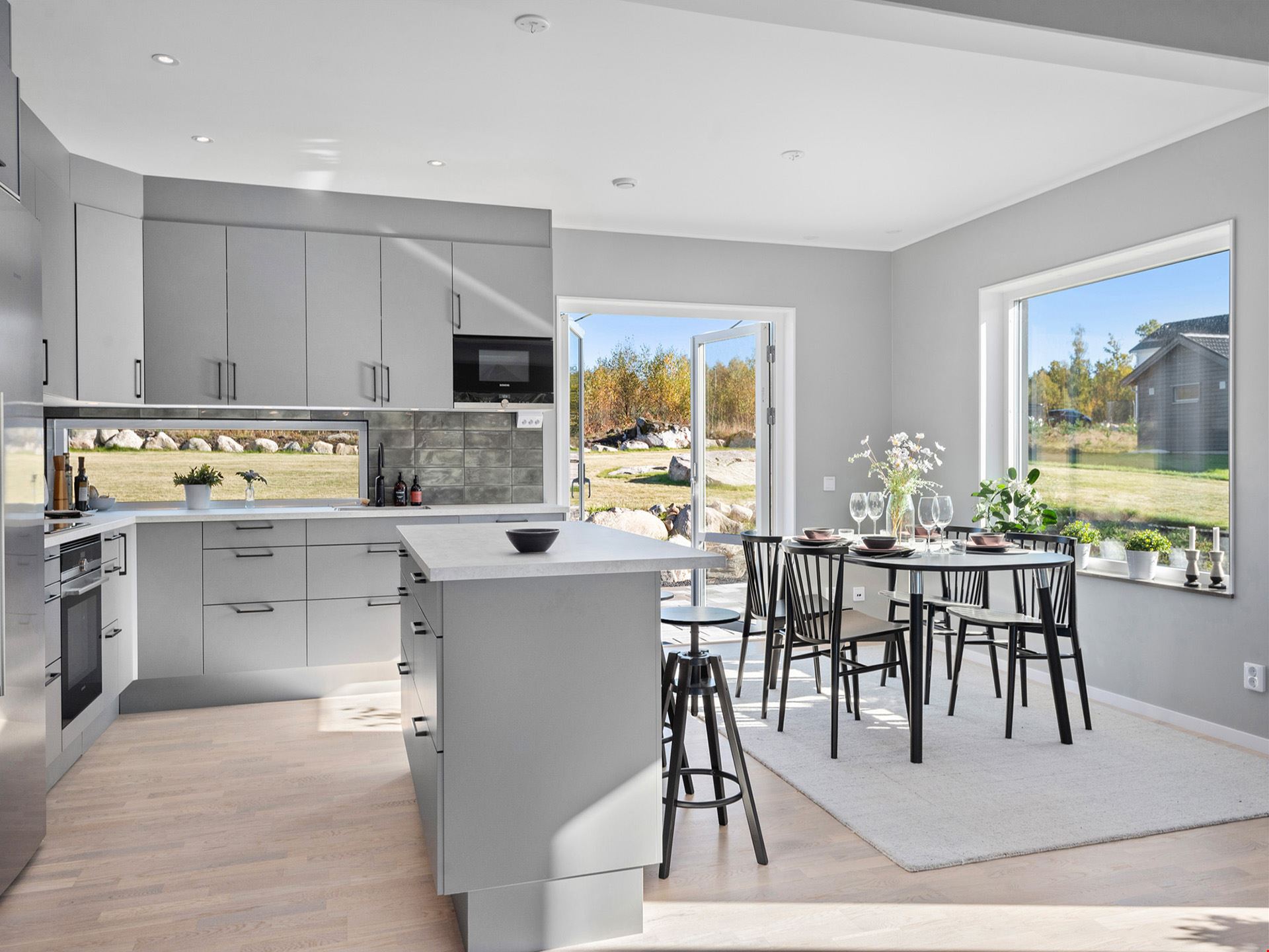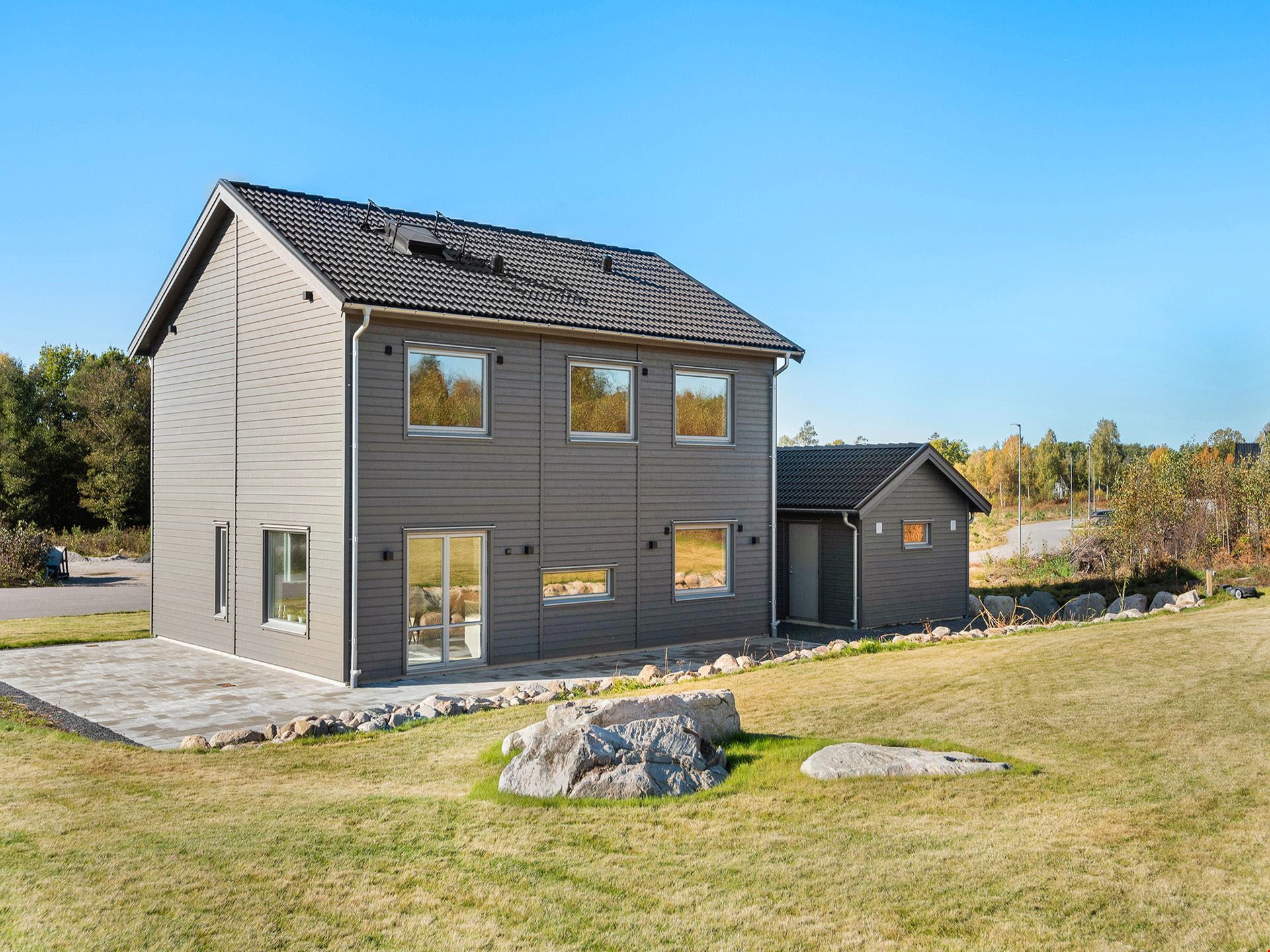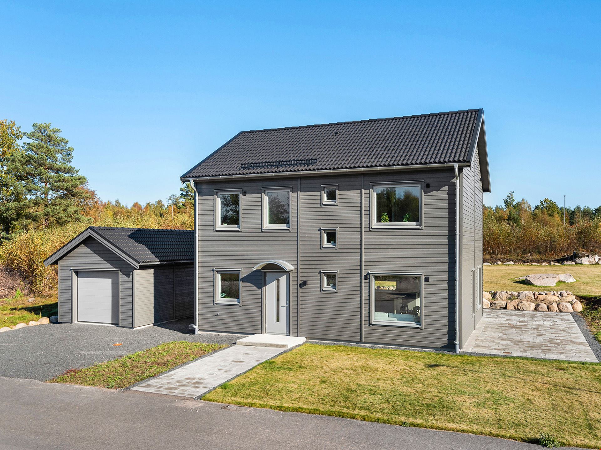 Fasaden är beviljad med en mörkt grå nyans och kommer ha en liggande panel. Alla plåtdetaljerna på huset så som stuprör, hängrännor, vindskivor m.m. kommer vara i silver och taket svart. Husets fönster kommer vara silver på utsidan och på insidan kommer de att vara vita. Ytterdörr och groventré kommer vara signalgrå. Garaget om 36 m² är isolerat med plats för en bil och dina trädgårdsredskap.