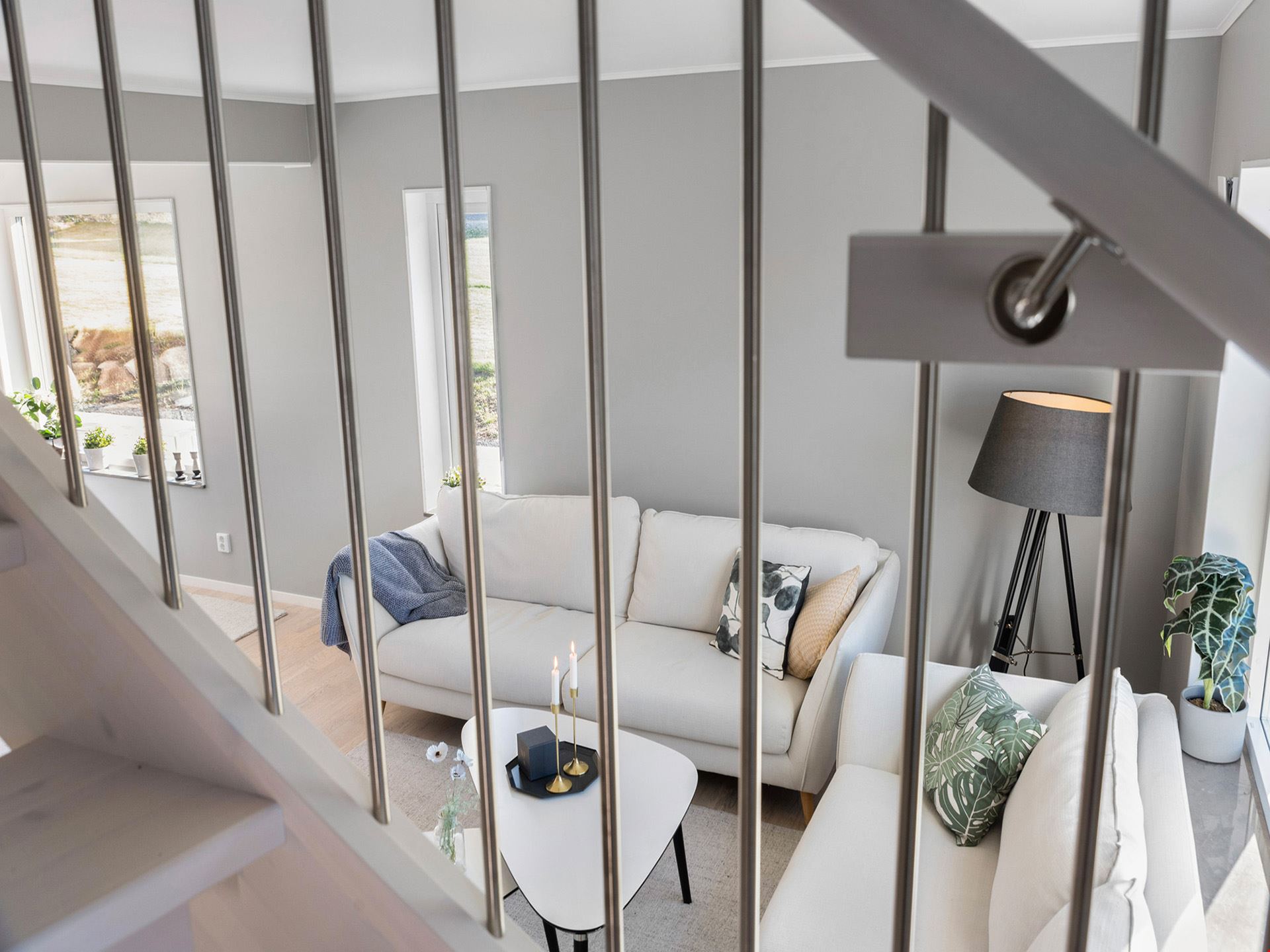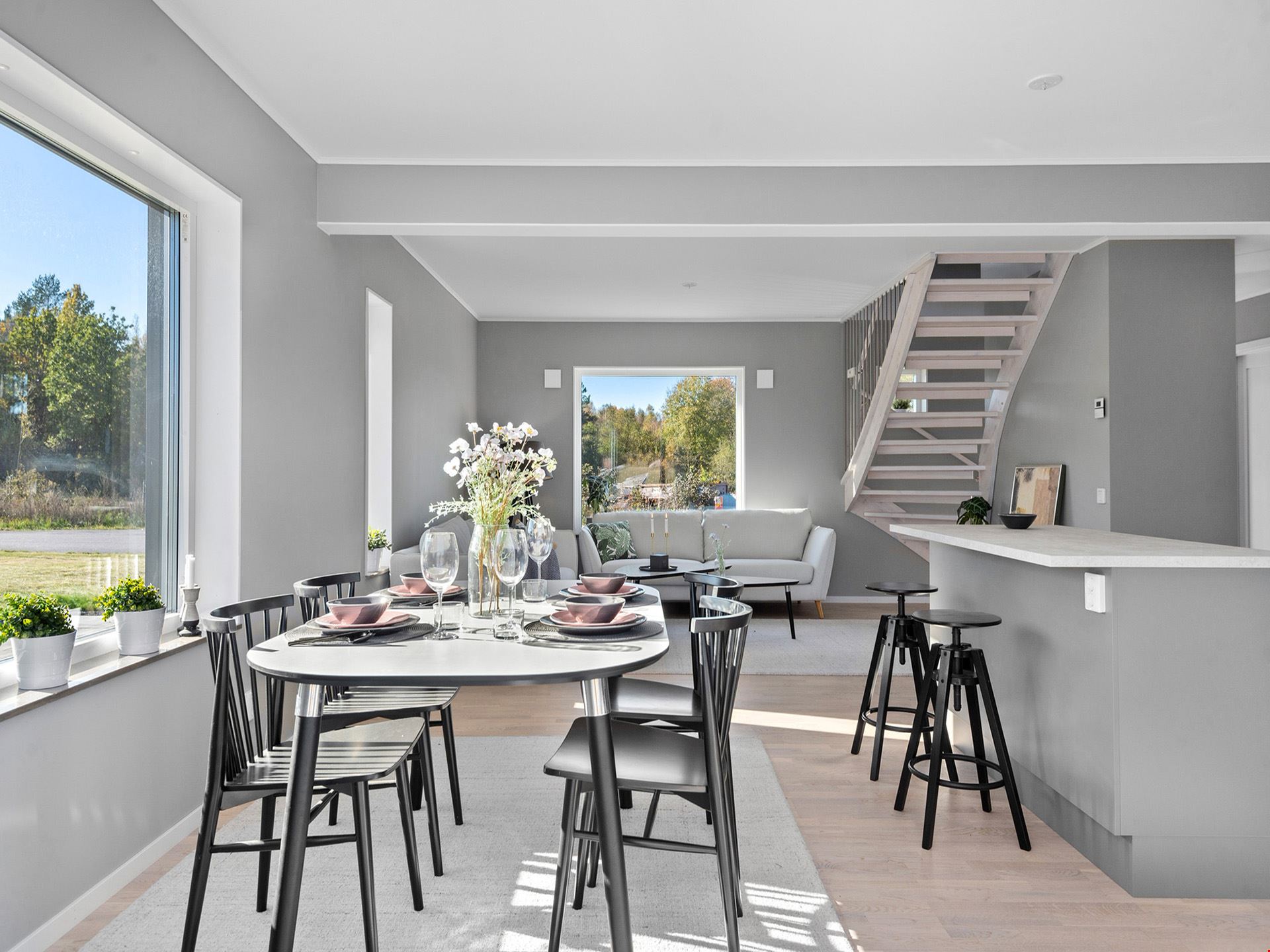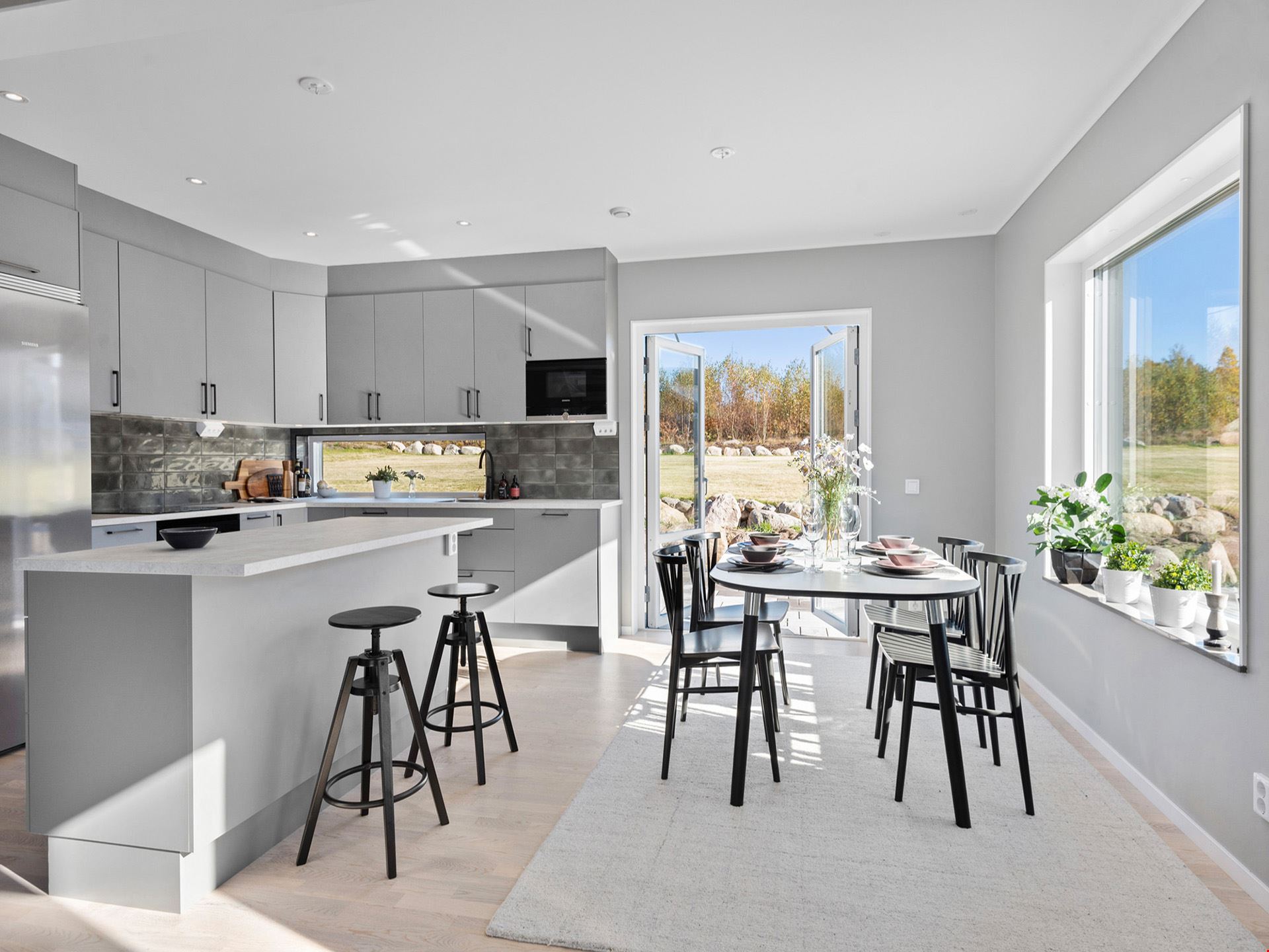 Fasaden är beviljad med en mörkt grå nyans och kommer ha en liggande panel. Alla plåtdetaljerna på huset så som stuprör, hängrännor, vindskivor m.m. kommer vara i silver och taket svart. Husets fönster kommer vara silver på utsidan och på insidan kommer de att vara vita. Ytterdörr och groventré kommer vara signalgrå. Garaget om 36 m² är isolerat med plats för en bil och dina trädgårdsredskap.