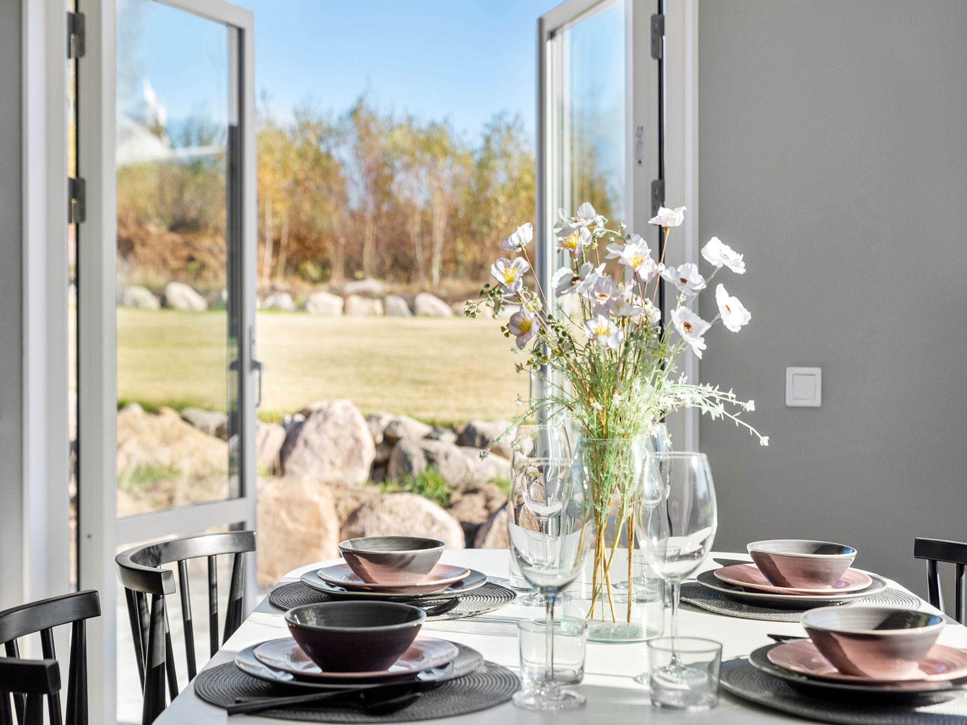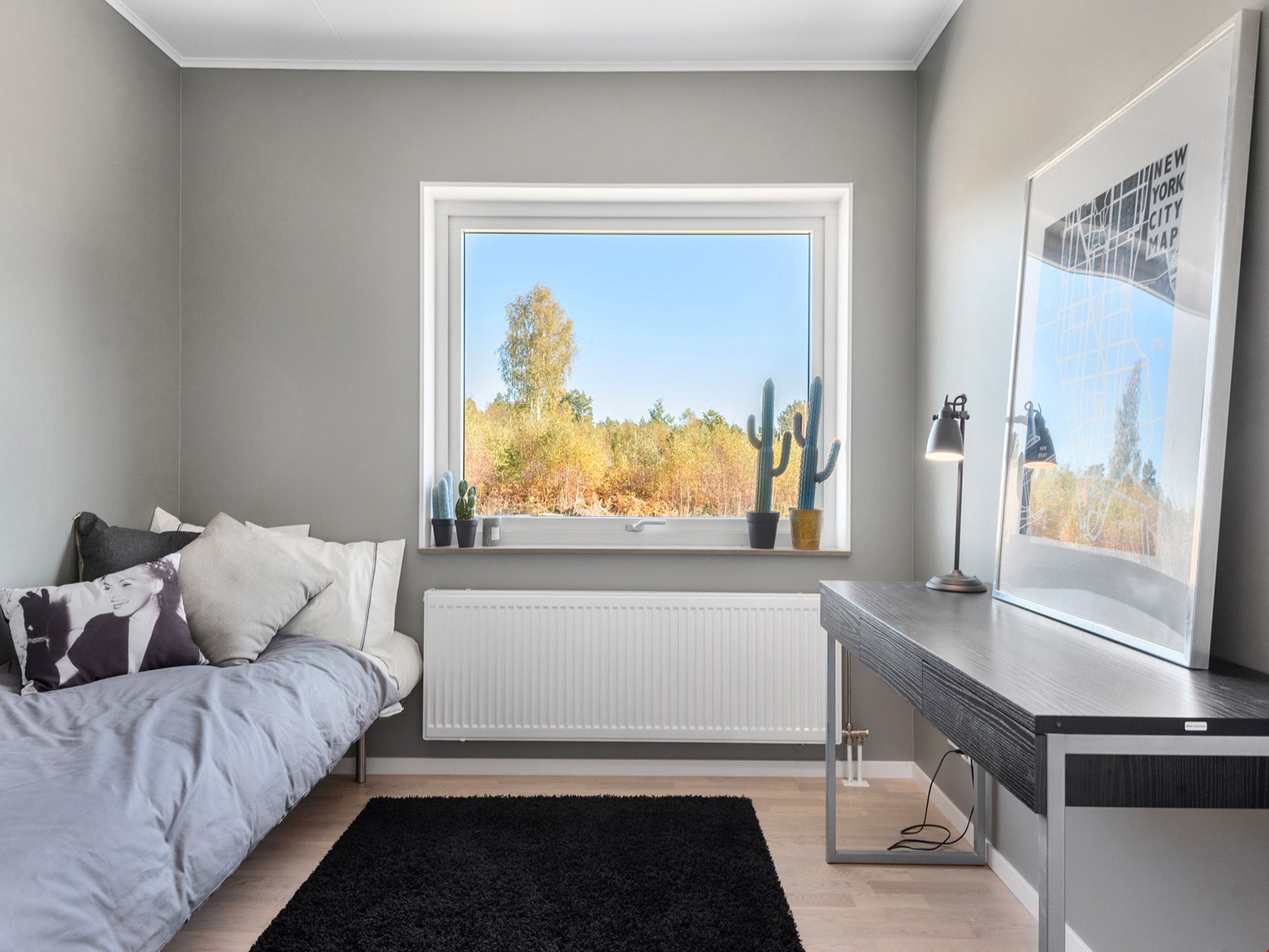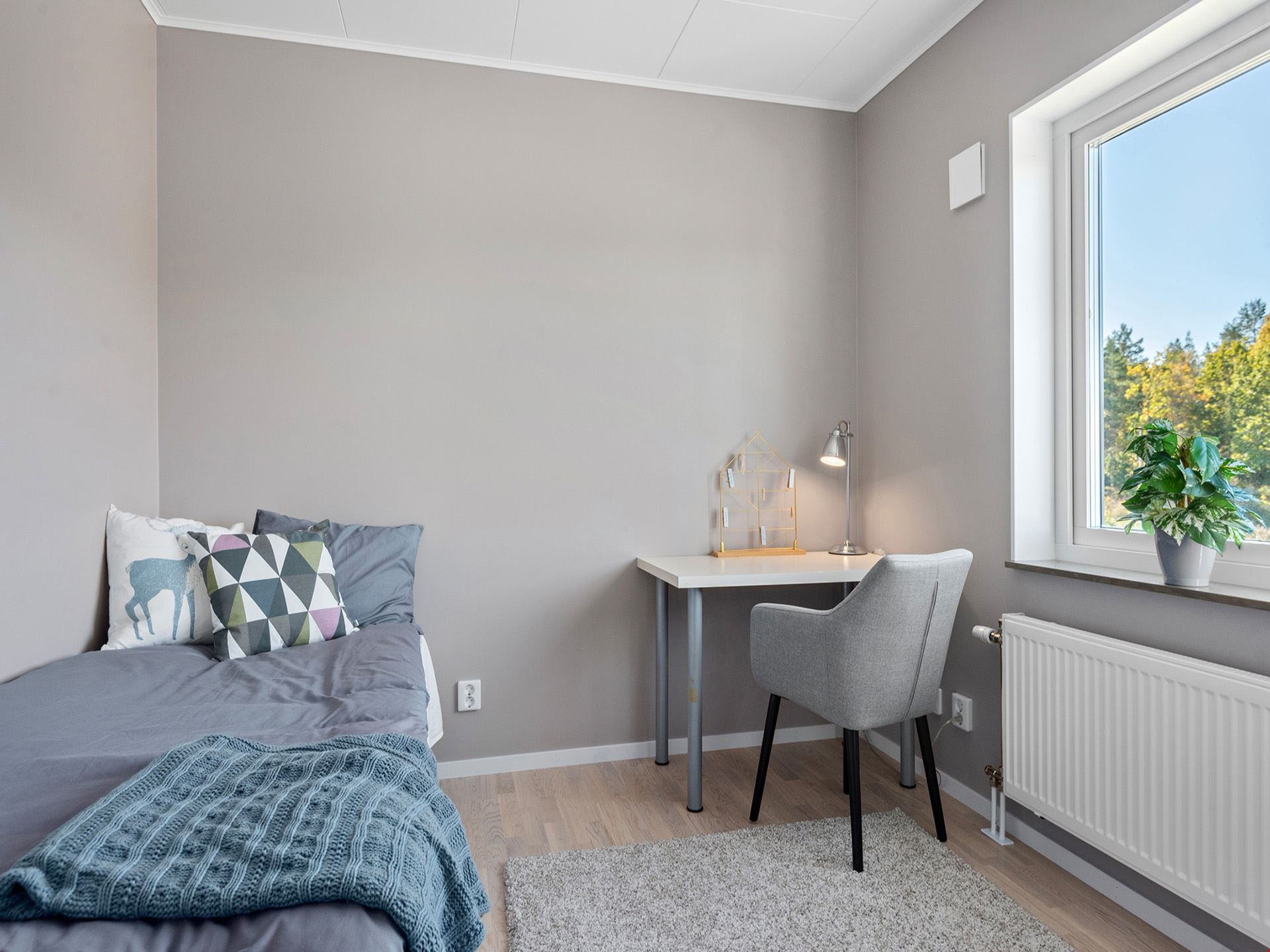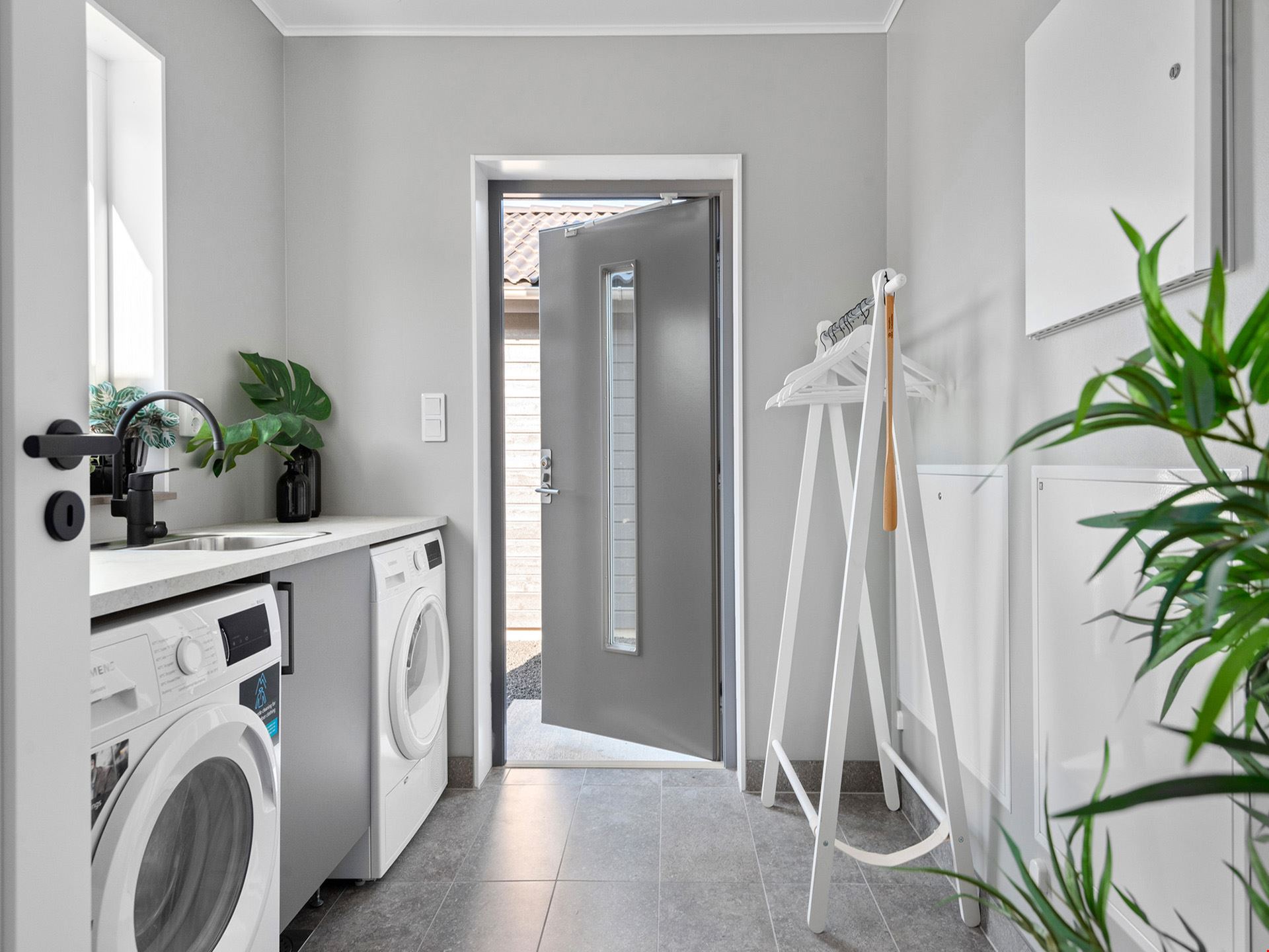 Fasaden är beviljad med en mörkt grå nyans och kommer ha en liggande panel. Alla plåtdetaljerna på huset så som stuprör, hängrännor, vindskivor m.m. kommer vara i silver och taket svart. Husets fönster kommer vara silver på utsidan och på insidan kommer de att vara vita. Ytterdörr och groventré kommer vara signalgrå. Garaget om 36 m² är isolerat med plats för en bil och dina trädgårdsredskap.