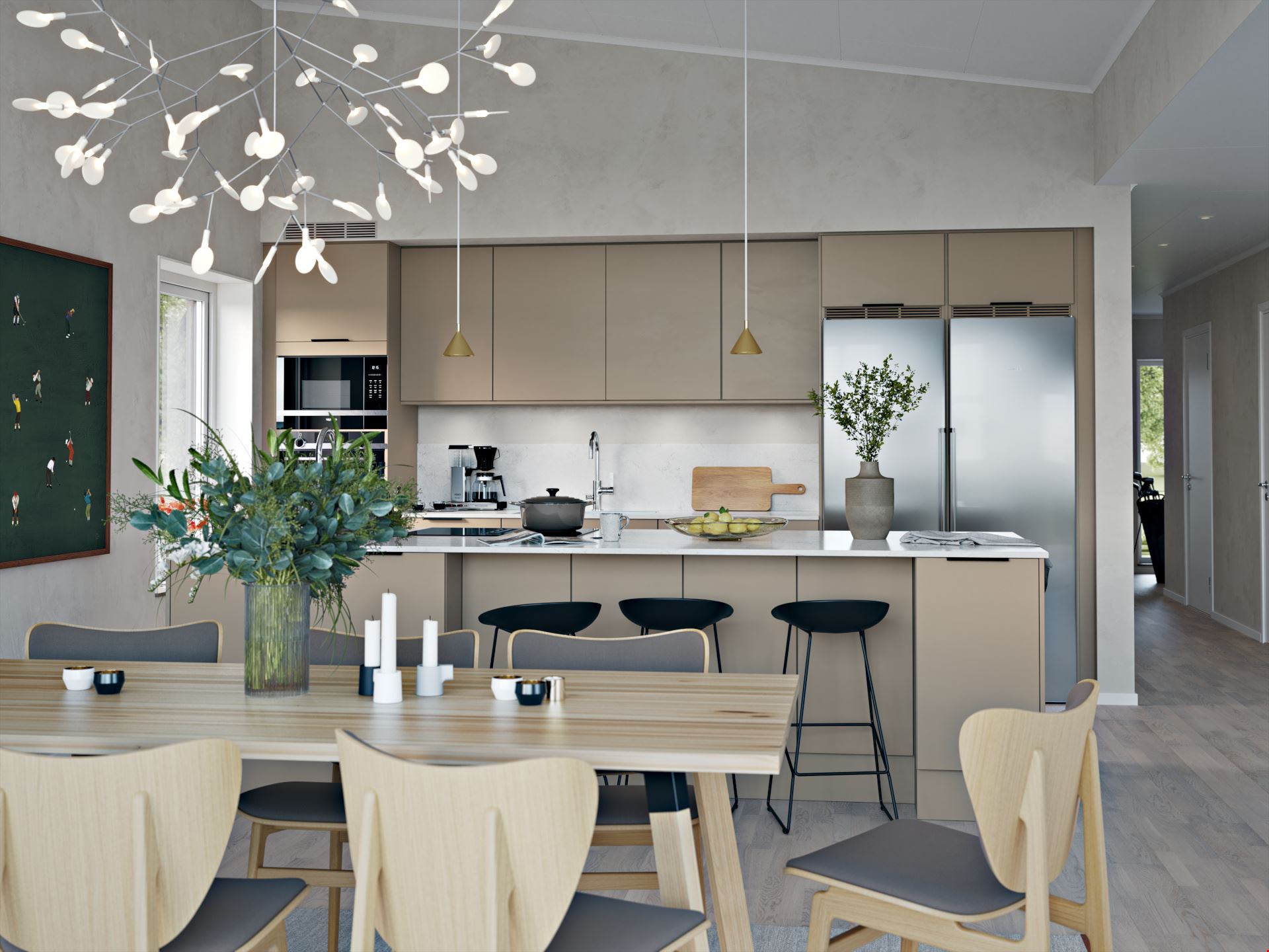 Huset erbjuder en välplanerad planlösning där kök och vardagsrum ligger i vinkel och skapar ett öppet, socialt flöde. Den generösa köksön blir en naturlig samlingspunkt som knyter samman kök och matplats – perfekt för både vardagsmiddagar och festliga tillfällen. Från vardagsrummet når du den indragna uteplatsen som blir en självklar förlängning av hemmet – en plats att njuta av, oavsett årstid.