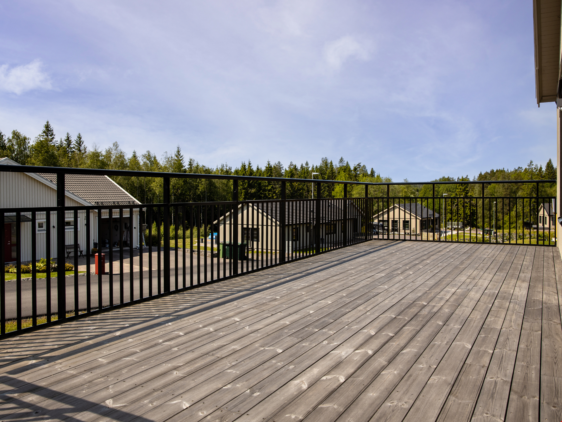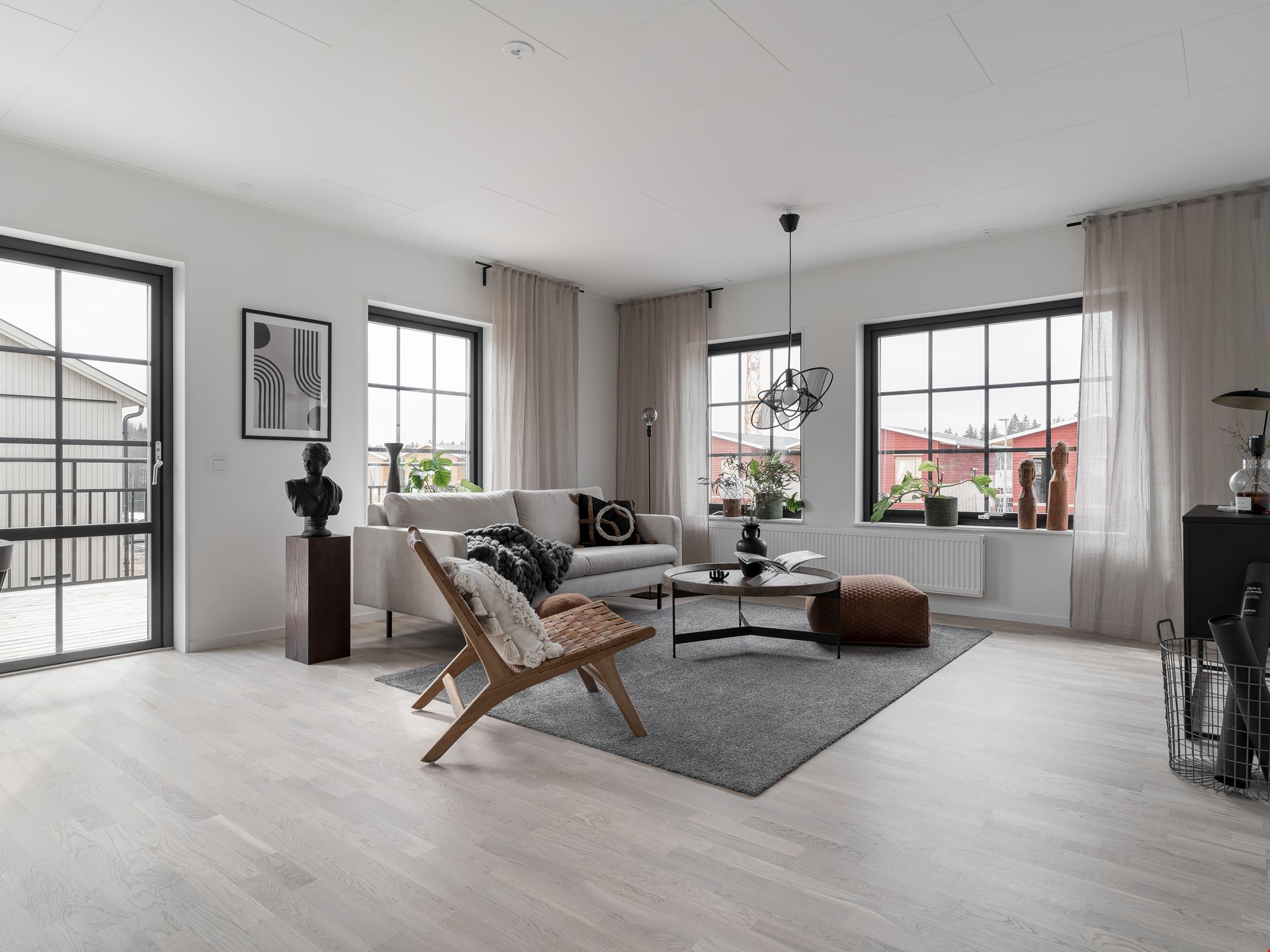 När vi tar trappan upp till det övre våningsplanet så kommer du till husets hjärta. Här är kök och vardagsrum placerade i ett öppet stråk för att ta vara på utsikten. Ljusinsläppet här inne är fantastiskt tack vare fönster i tre olika väderstreck. Från vardagsrummet tar du dig ut på den stora balkongen. Köket kommer från HTH och har en tidlös stil med rostfria vitvaror. Köksmodellen Stockholm i mockafärg gör att du får ett mysigt kök som tillför värme och hemtrevnad till din hemredning.