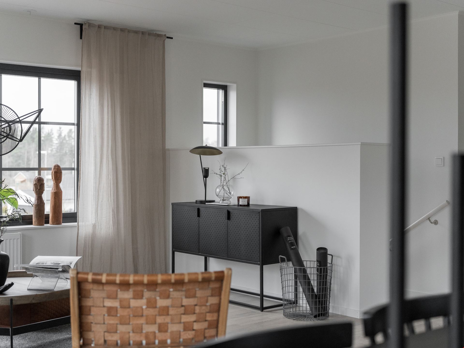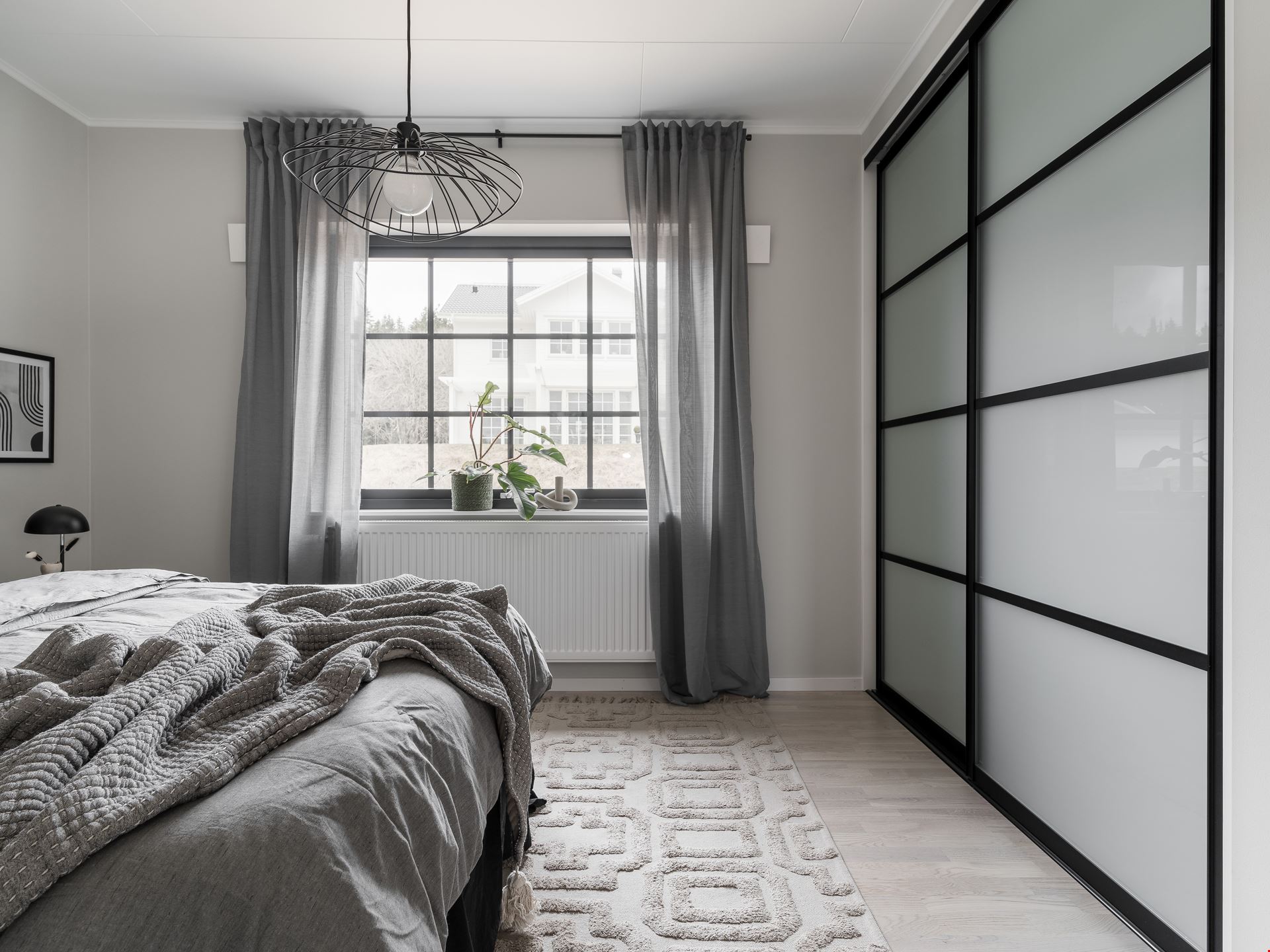 På det här våningsplanet hittar du också husets master bedroom som bjuder på gott om förvaring. I denna del av huset finns även ett mindre sovrum och badrum. Badrummet är inrett med kakel och klinker, duschväggar och en betonggrå kommod från Vedum.