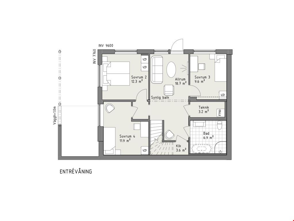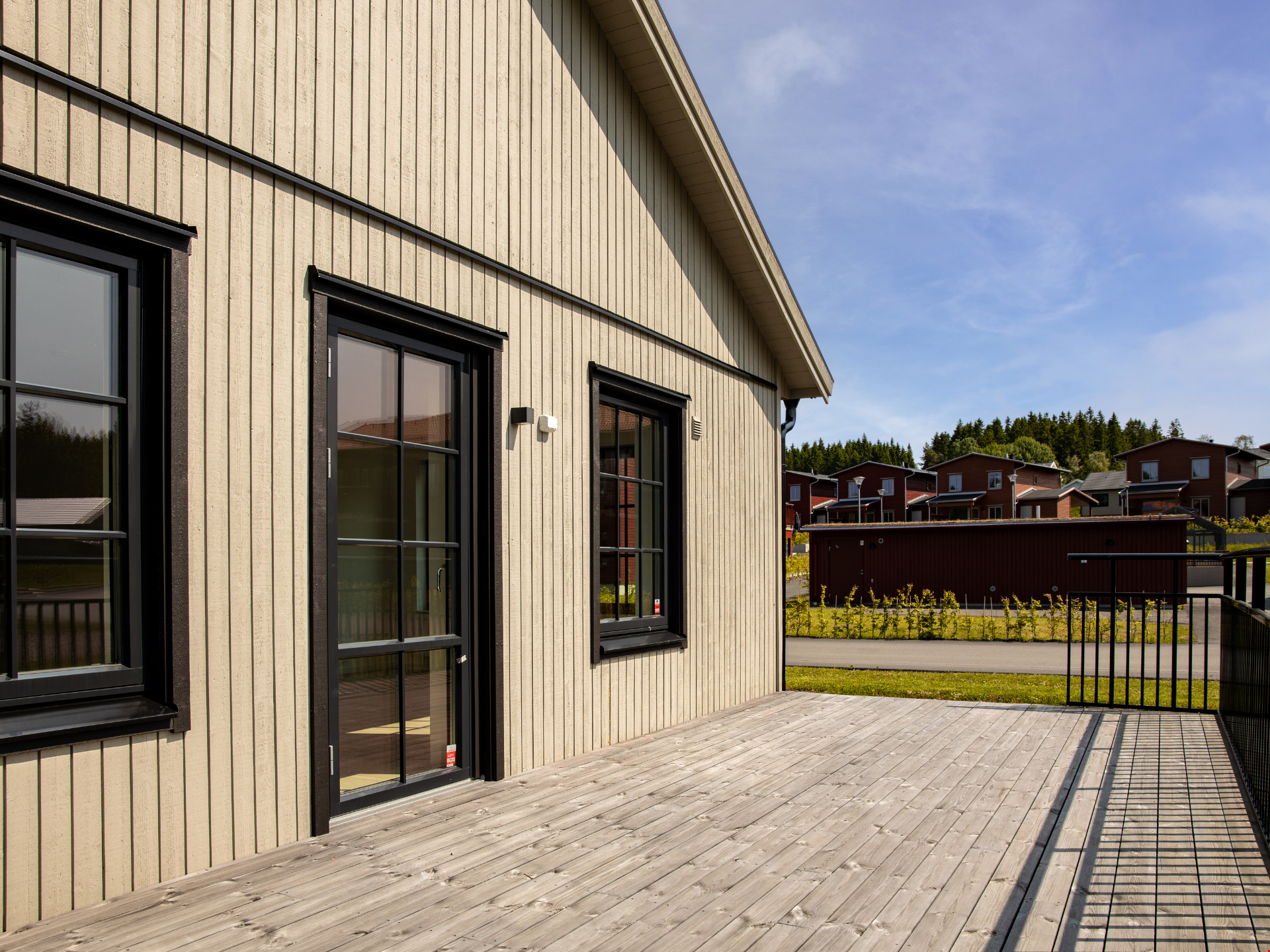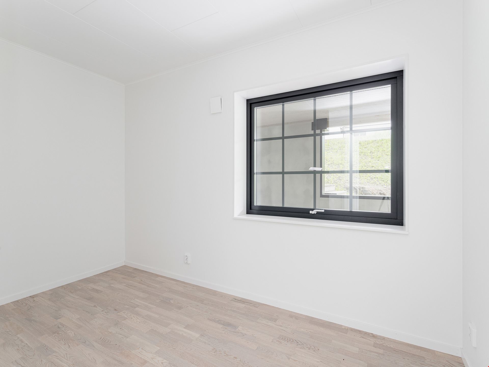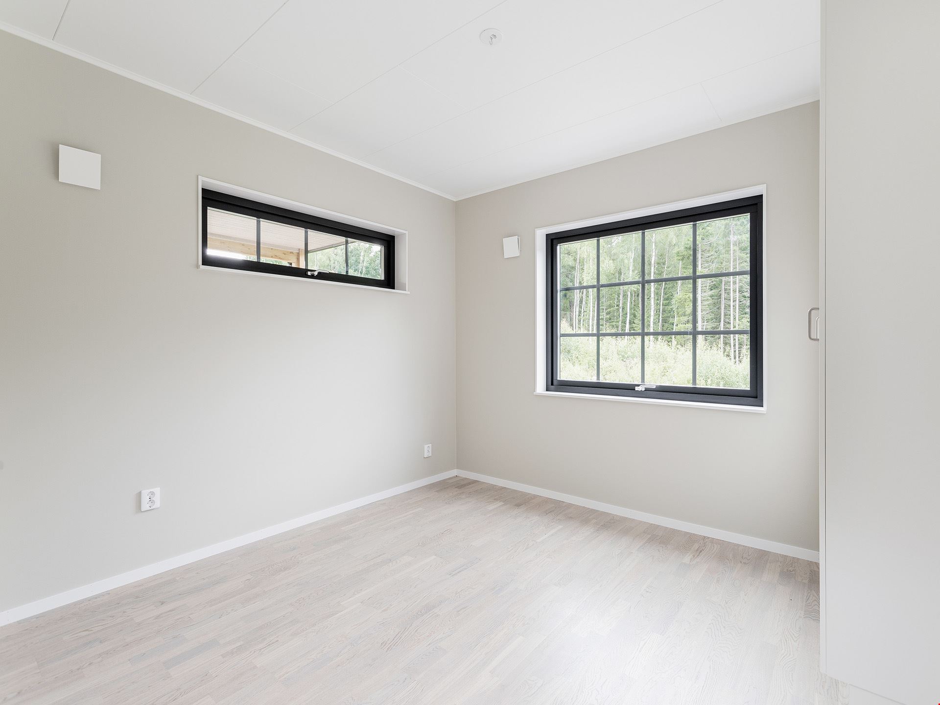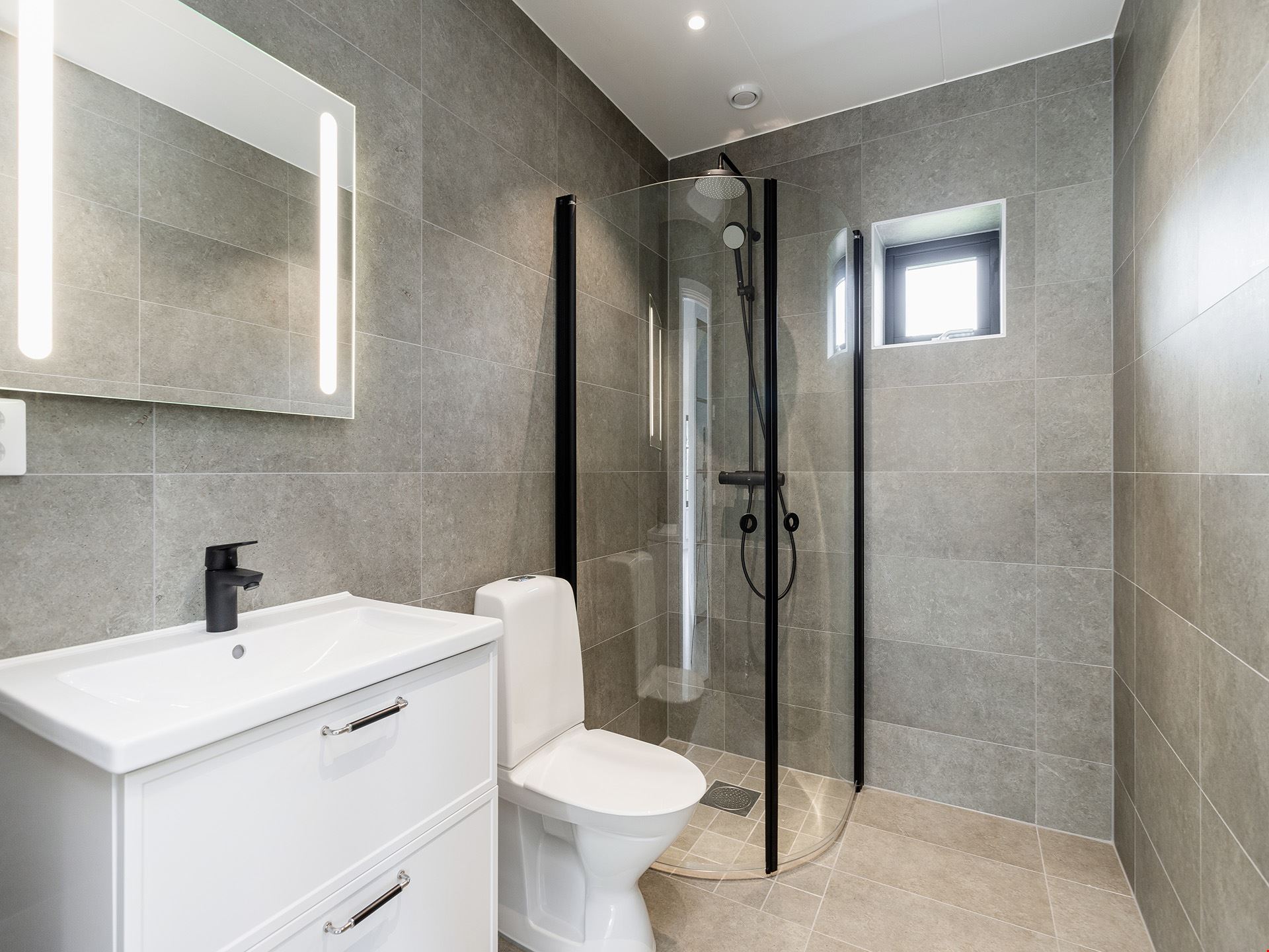 Välkomment till detta sluttningshus om 147 kvm. Entrén finns på det övre våningsplanet. När du kliver in genom entrén möts du av husets hjärta. Här är kök och vardagsrum placerade i ett öppet stråk för att ta vara på utsikten. Ljusinsläppet här inne är fantastiskt tack vare fönster i tre olika väderstreck. Från vardagsrummet tar du dig ut på den stora balkongen. Köket kommer från HTH och har en tidlös stil med rostfria vitvaror. Köksmodellen Stockholm i mockafärg gör att du får ett mysigt kök som tillför värme och hemtrevnad till din hemredning. På det här våningsplanet hittar du också husets master bedroom som bjuder på gott om förvaring. I denna del av huset finns också tvättstugan och ett badrum.