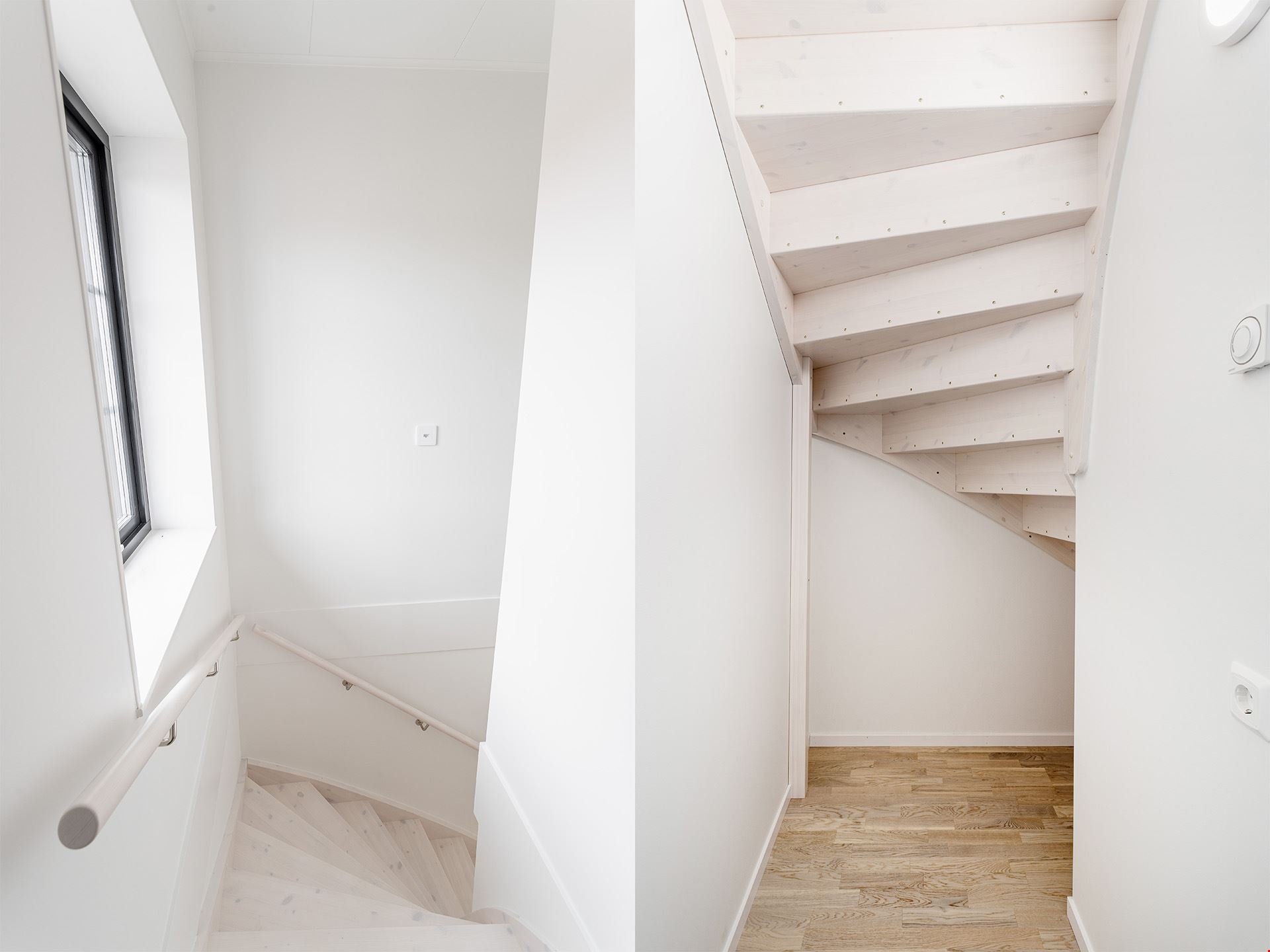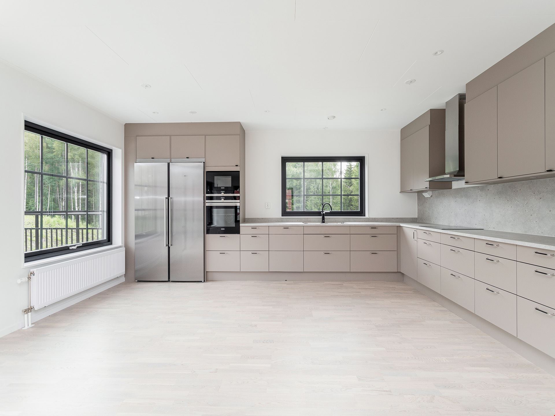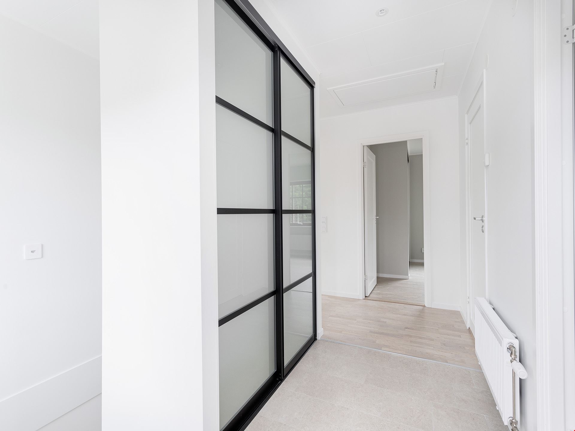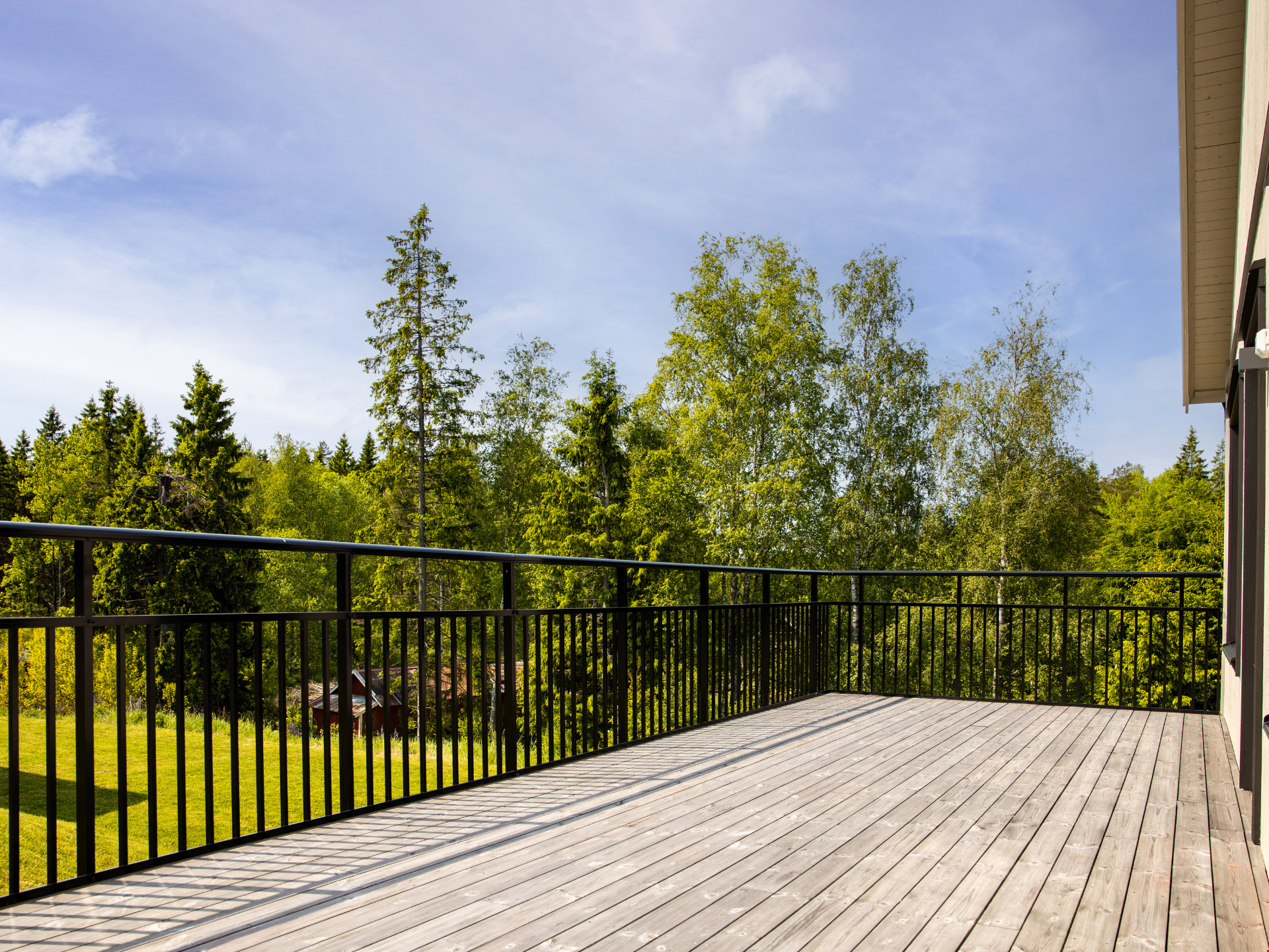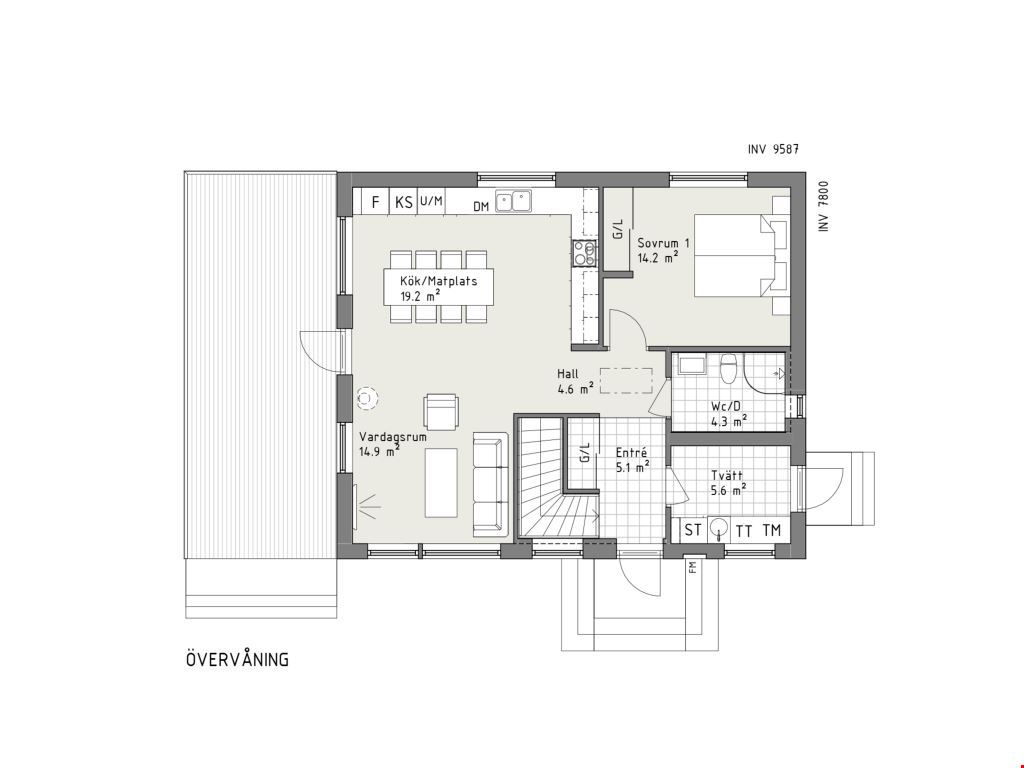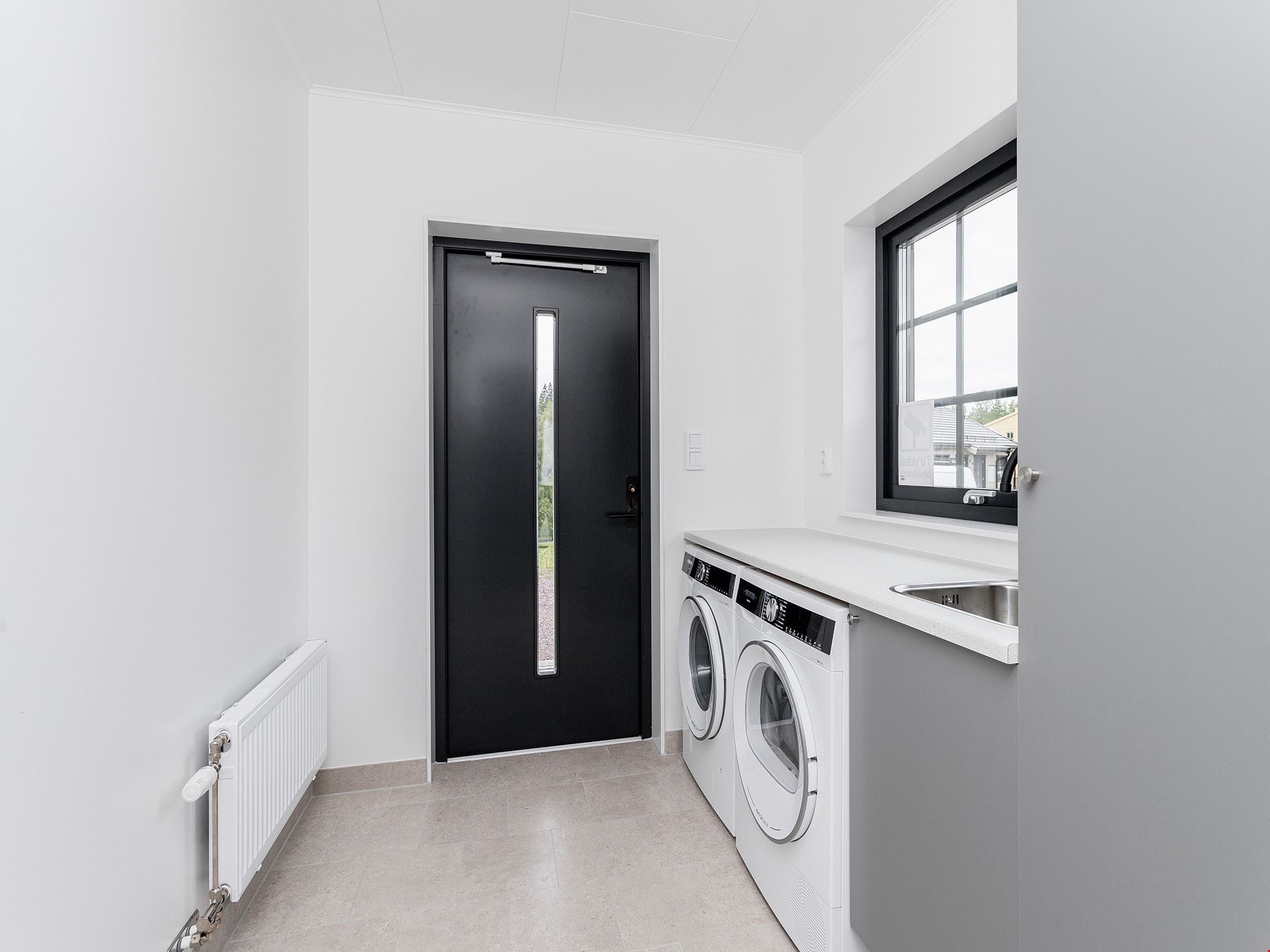 Välkomment till detta sluttningshus om 147 kvm. Entrén finns på det övre våningsplanet. När du kliver in genom entrén möts du av husets hjärta. Här är kök och vardagsrum placerade i ett öppet stråk för att ta vara på utsikten. Ljusinsläppet här inne är fantastiskt tack vare fönster i tre olika väderstreck. Från vardagsrummet tar du dig ut på den stora balkongen. Köket kommer från HTH och har en tidlös stil med rostfria vitvaror. Köksmodellen Stockholm i mockafärg gör att du får ett mysigt kök som tillför värme och hemtrevnad till din hemredning. På det här våningsplanet hittar du också husets master bedroom som bjuder på gott om förvaring. I denna del av huset finns också tvättstugan och ett badrum.