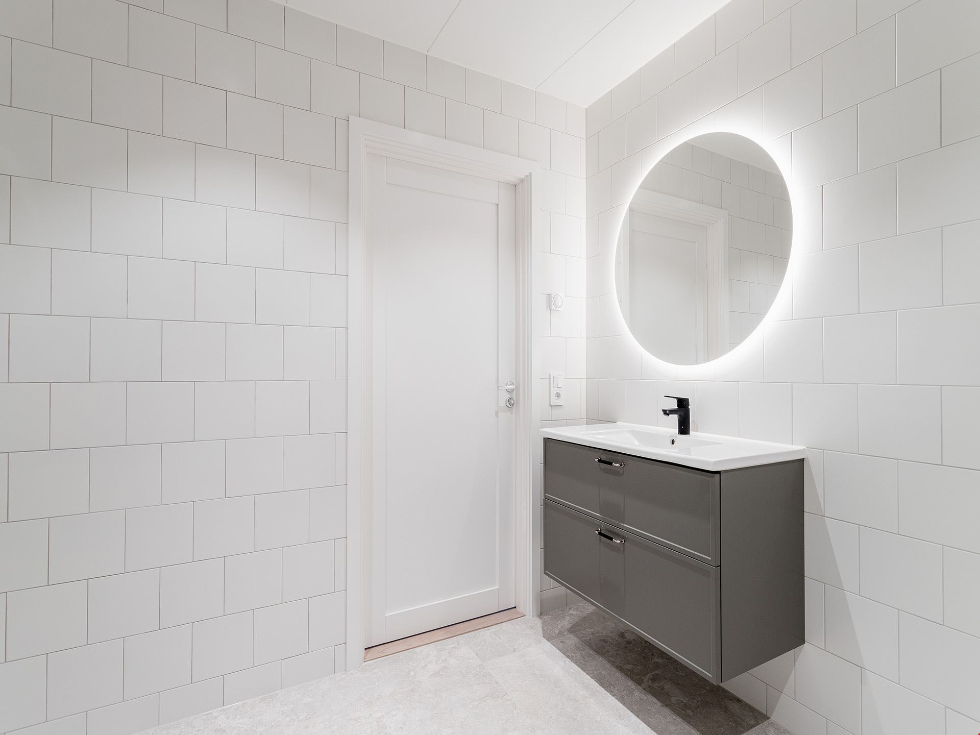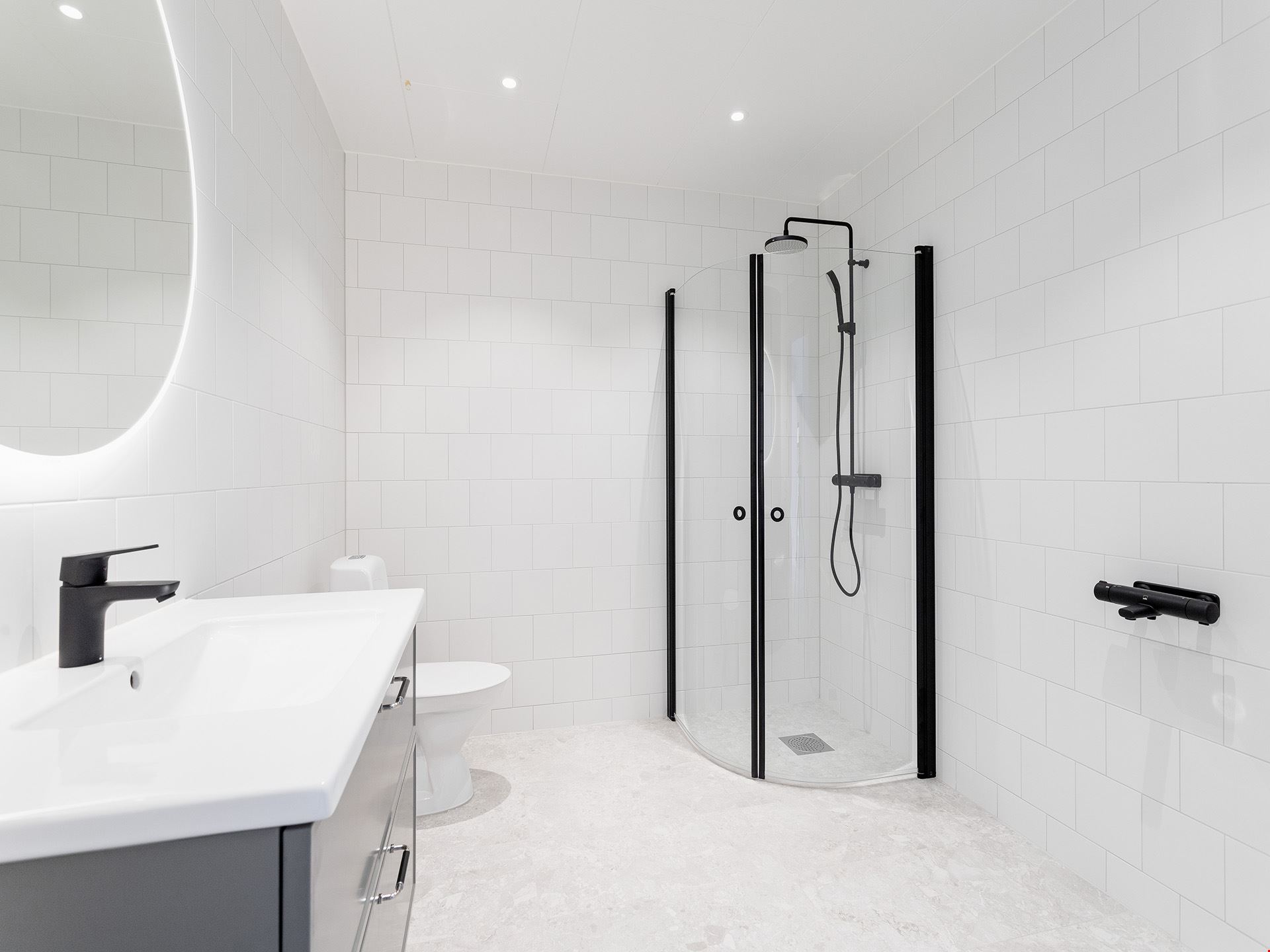 När du tar trappan ner hittar du den perfekta ungdomsavdelningen med ett allrum. Här finns också tre rymliga sovrum, gott om förvaring och ett större badrum som är inrett med kakel och klinker, duschväggar samt kommod från Vedum. Huset är inrett i industriell stil.