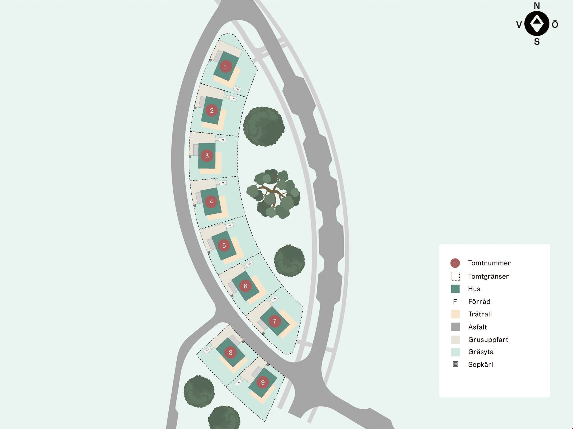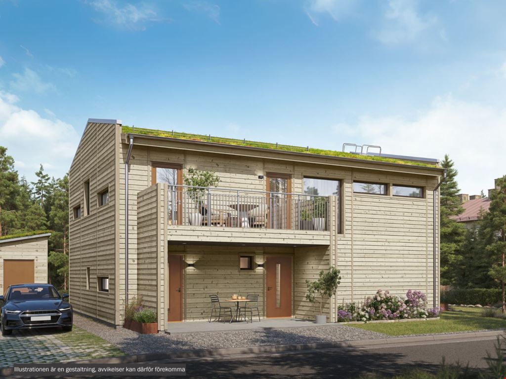 Här får du ett hem i modern stil, med sedumtak och stora glaspartier som bjuder in ljuset och tar tillvara på omgivningen. Huset, som både är funktionellt och vackert, smälter in i den omgivande miljön och den vackra entrébalkongen och de stora fönsterpartierna ger gott om ljusinsläpp till husets olika sällskapsytor. Entrévåningen präglas av generösa och flexibla ytor för vardagsrum, kök och matplats, med närhet till groventré och tvätt. Sovrummen hittar du på husets övervåning och där finns även gott om förvaring i form av två generösa klädkammare. På övervåningen finns även ett rymligt badrum och allrum.