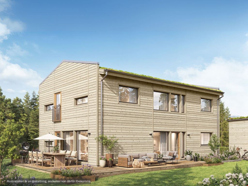 I denna 2-plansvilla får du ett hem i modern stil, med sedumtak och stora glaspartier som bjuder in ljuset och tar tillvara på omgivningen. Huset, som både är funktionellt och vackert, smälter in i den omgivande miljön och den vackra entrébalkongen och de stora fönsterpartierna ger gott om ljusinsläpp till husets olika sällskapsytor. Entrévåningen präglas av generösa och flexibla ytor för vardagsrum, kök och matplats, med närhet till groventré och tvätt. Sovrummen hittar du på husets övervåning och där finns även gott om förvaring i form av två generösa klädkammare. På övervåningen finns även ett rymligt badrum och allrum.