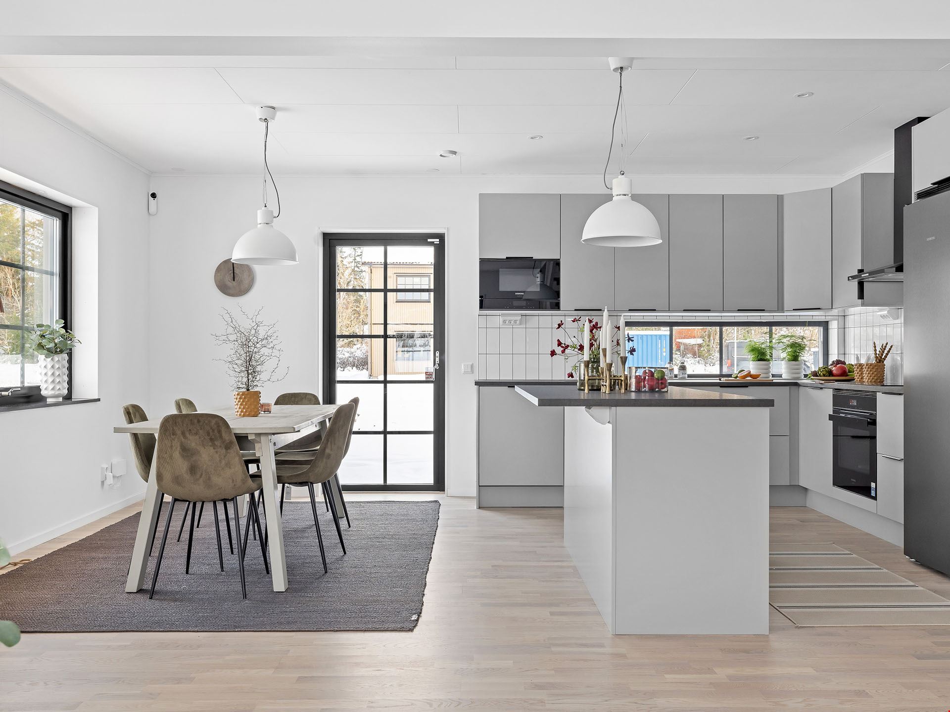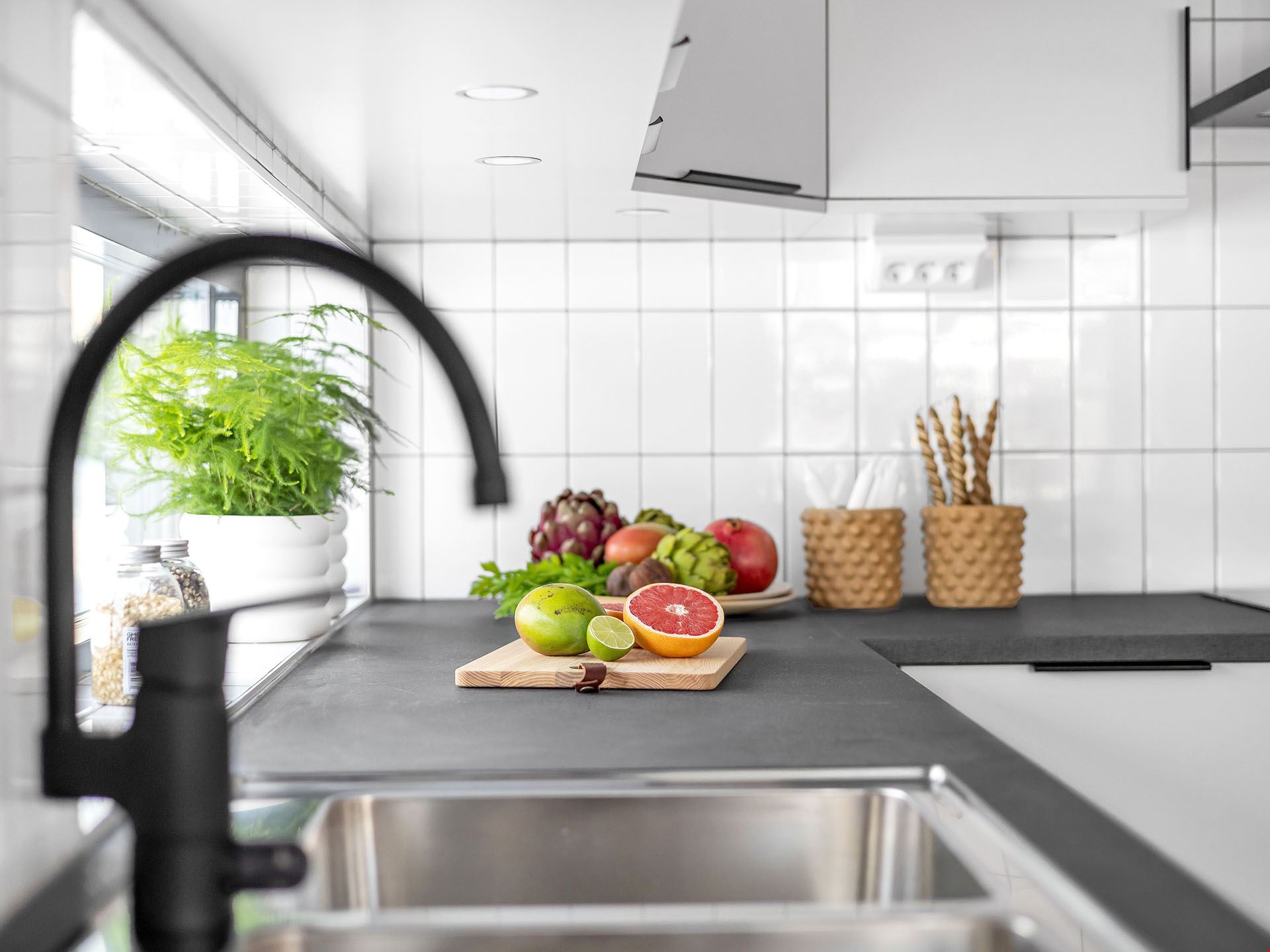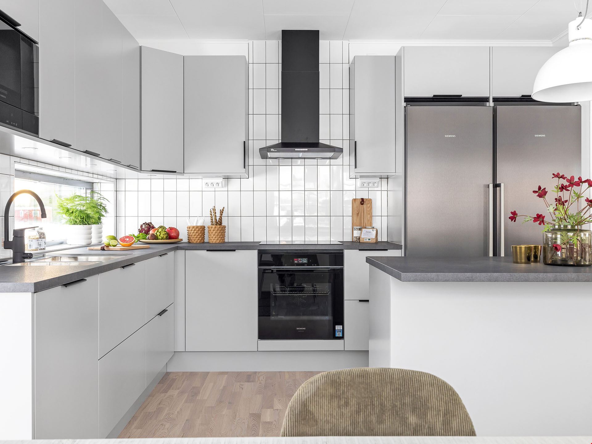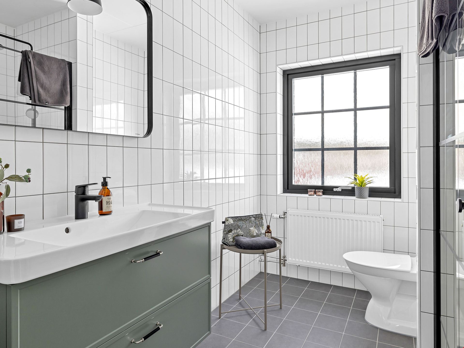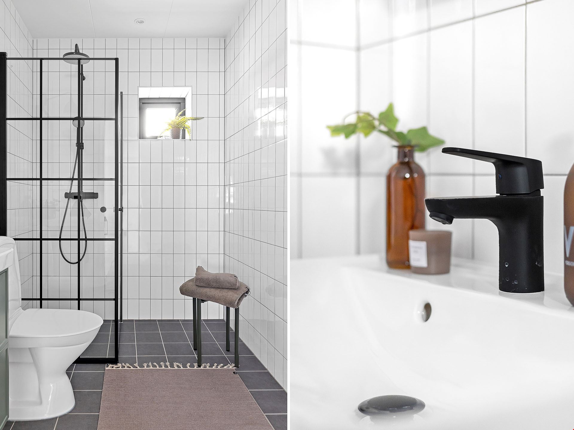 Köket kommer vara utrustad med en hög standard och inrett med en köksö. Luckorna är vita med diskreta rostfria handtag, bänkskivan är i svart laminat och vitvarorna svarta. I köket hittar du alla hushållsapparater som du behöver för att laga dina festliga måltider som: inbyggnadsugn, mikro, kyl, frys, spishäll, fläkt, diskmaskin, dämpade fullutdragslådor och mjukstängande luckor. Klicka här för att se ritningarna på köket. Badrummen är inredda med kakel och klinker, duschhörn med takdusch samt skogsgröna kommoder.
