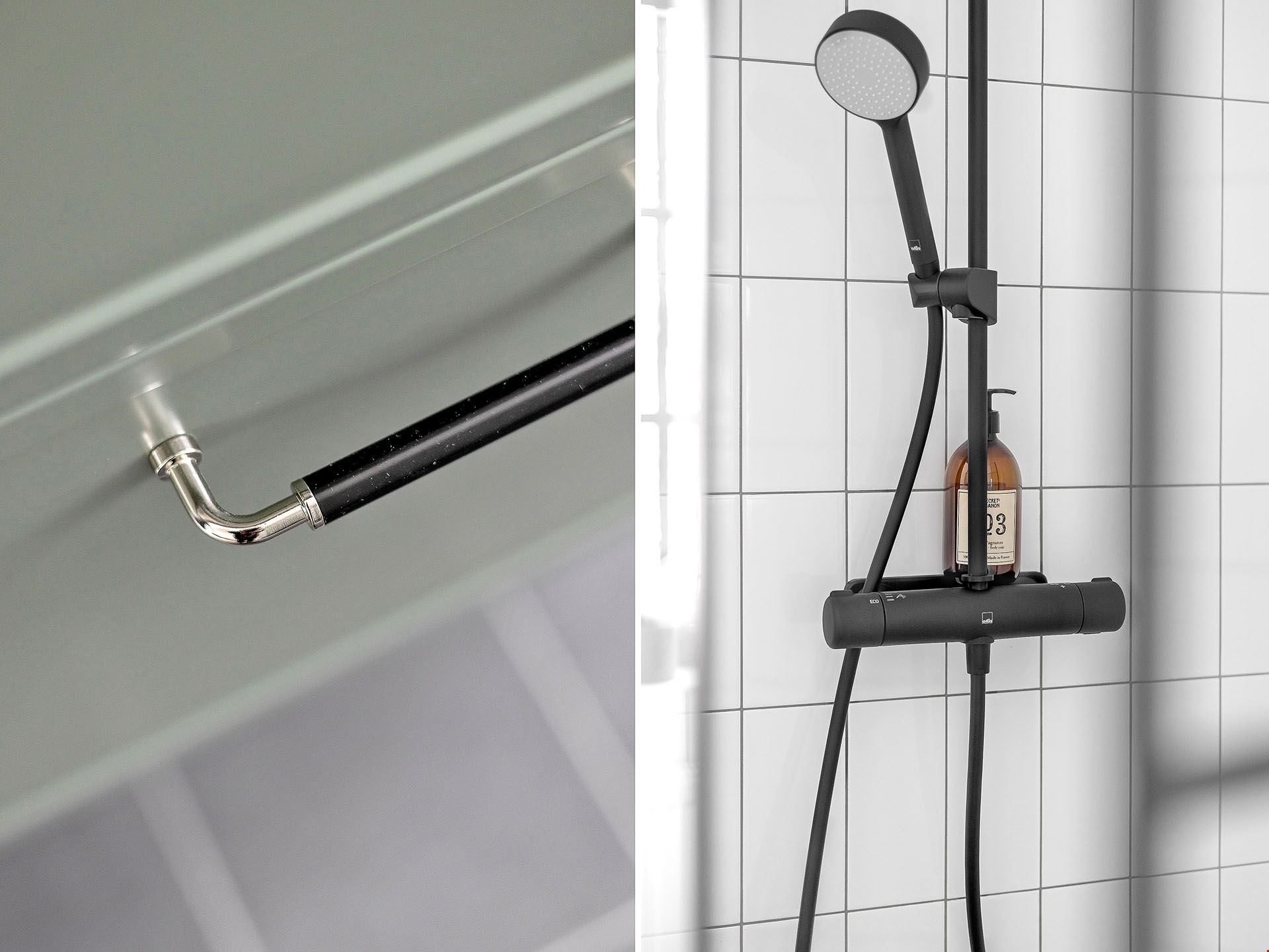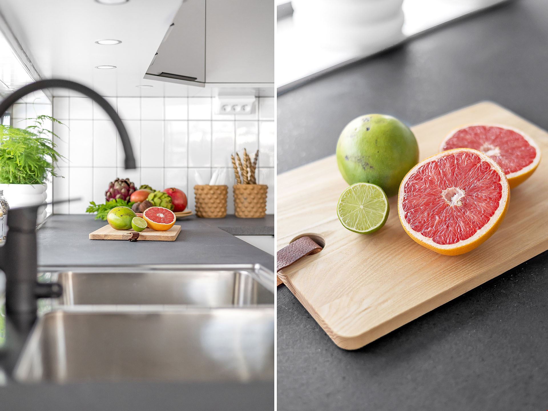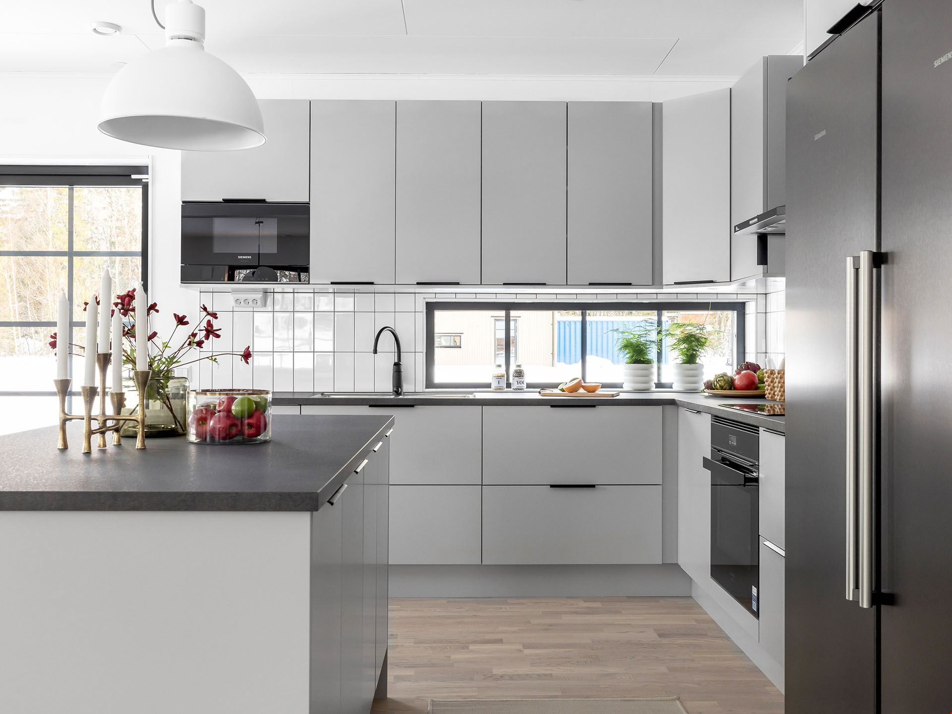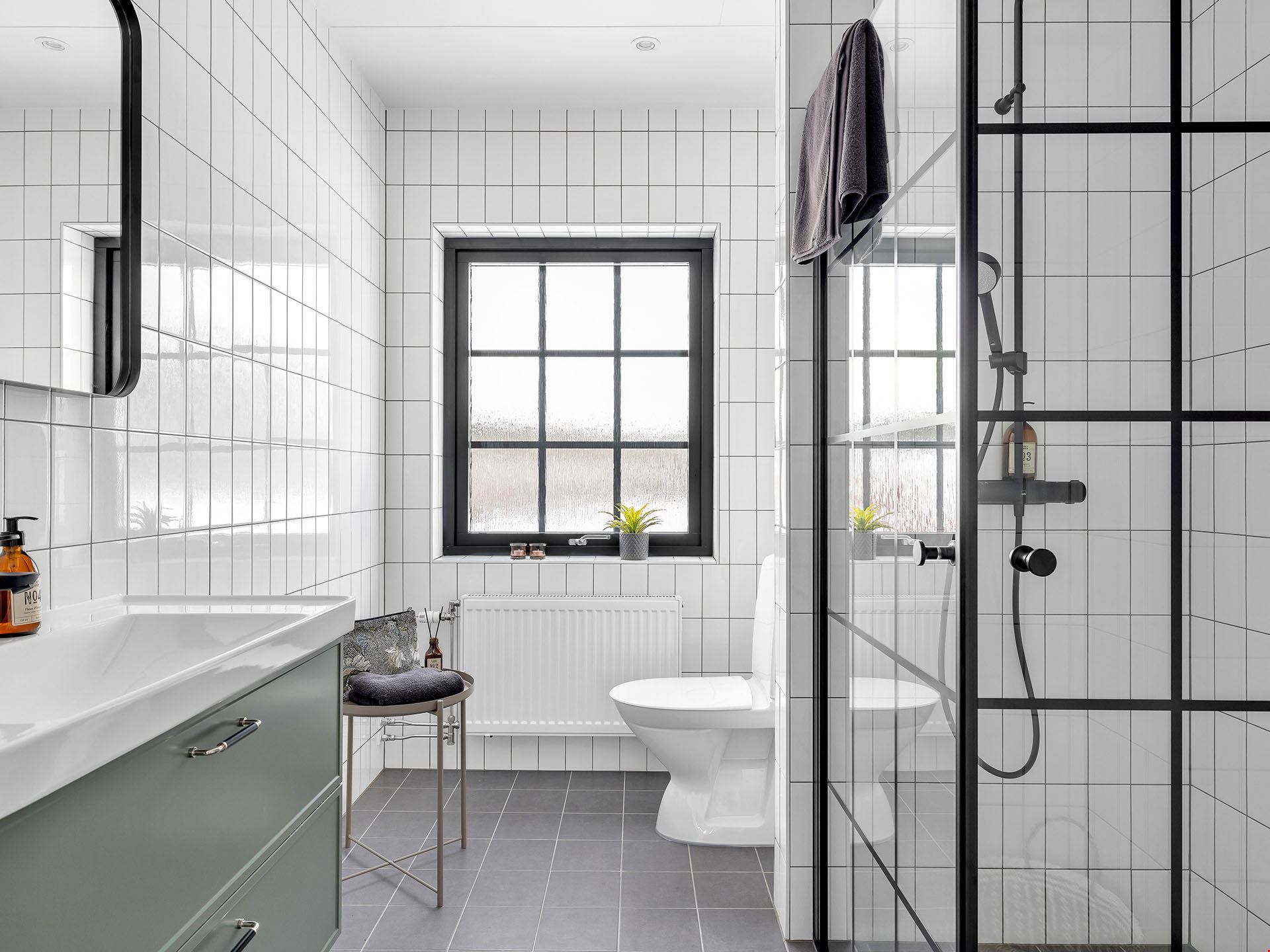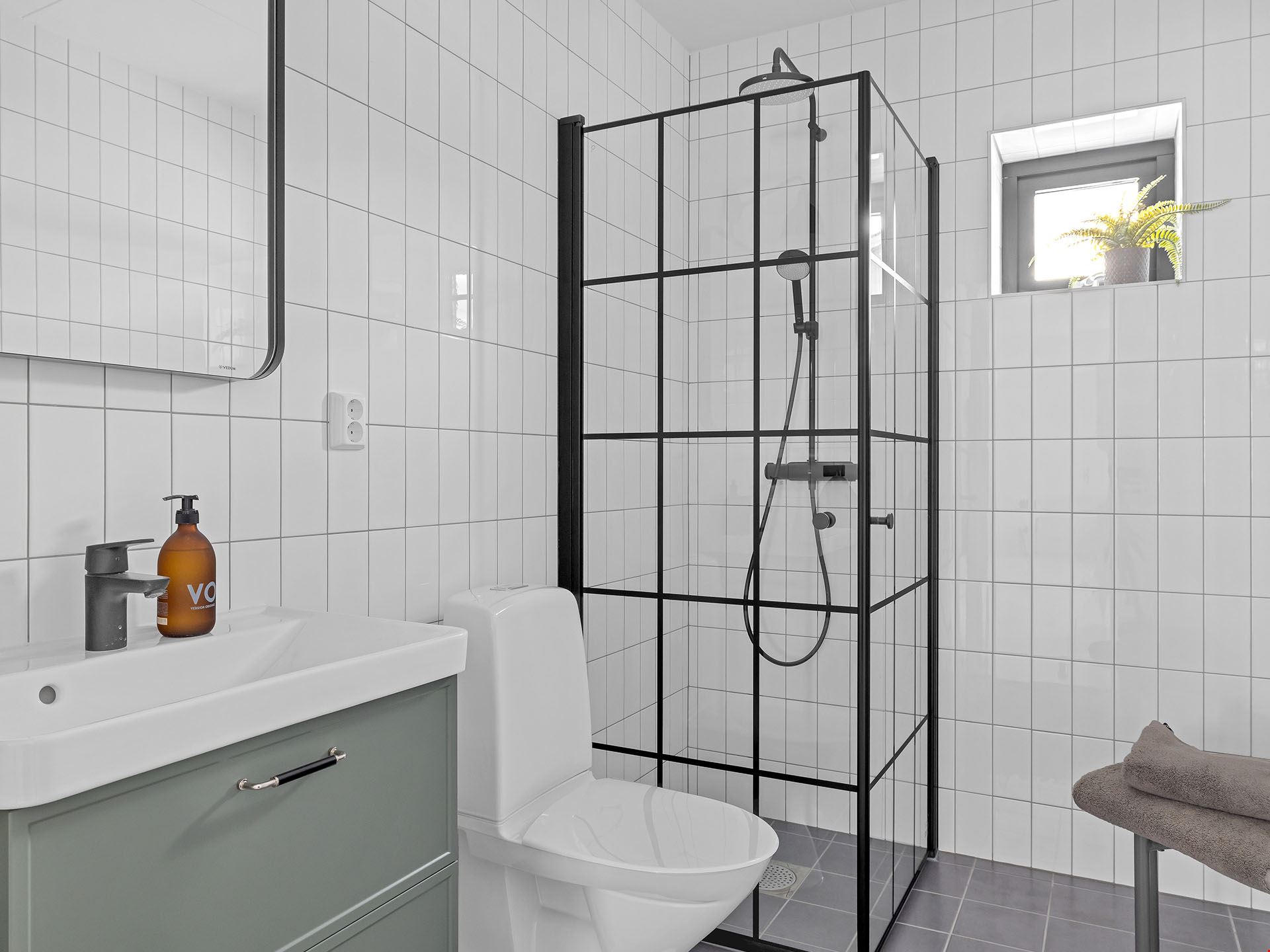 Köket kommer vara utrustad med en hög standard och inrett med en köksö. Luckorna är vita med diskreta rostfria handtag, bänkskivan är i svart laminat och vitvarorna svarta. I köket hittar du alla hushållsapparater som du behöver för att laga dina festliga måltider som: inbyggnadsugn, mikro, kyl, frys, spishäll, fläkt, diskmaskin, dämpade fullutdragslådor och mjukstängande luckor. Klicka här för att se ritningarna på köket. Badrummen är inredda med kakel och klinker, duschhörn med takdusch samt skogsgröna kommoder.