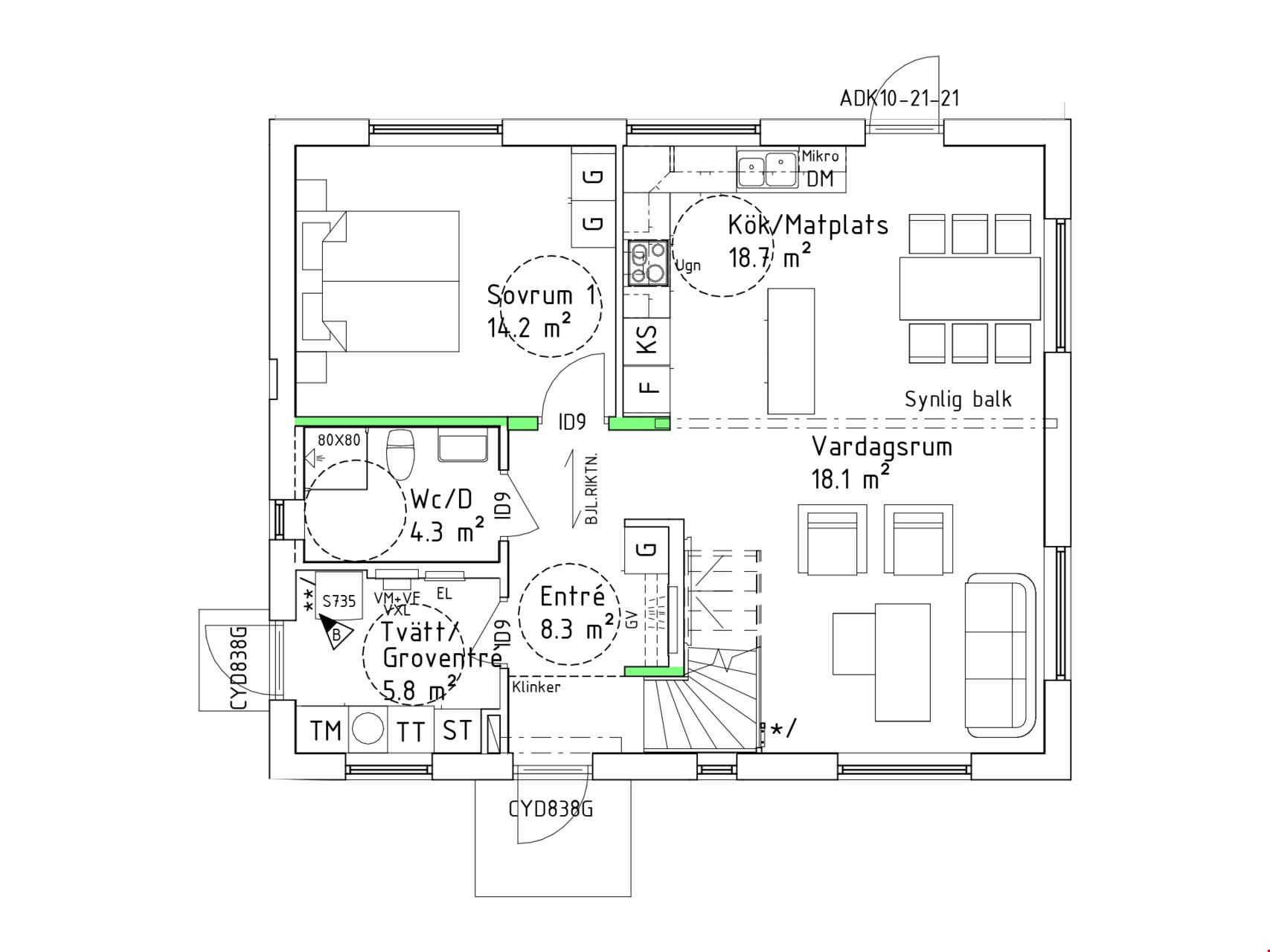 Köket kommer vara utrustad med en hög standard och inrett med en köksö. Luckorna är vita med diskreta rostfria handtag, bänkskivan är i svart laminat och vitvarorna svarta. I köket hittar du alla hushållsapparater som du behöver för att laga dina festliga måltider som: inbyggnadsugn, mikro, kyl, frys, spishäll, fläkt, diskmaskin, dämpade fullutdragslådor och mjukstängande luckor. Klicka här för att se ritningarna på köket. Badrummen är inredda med kakel och klinker, duschhörn med takdusch samt skogsgröna kommoder.