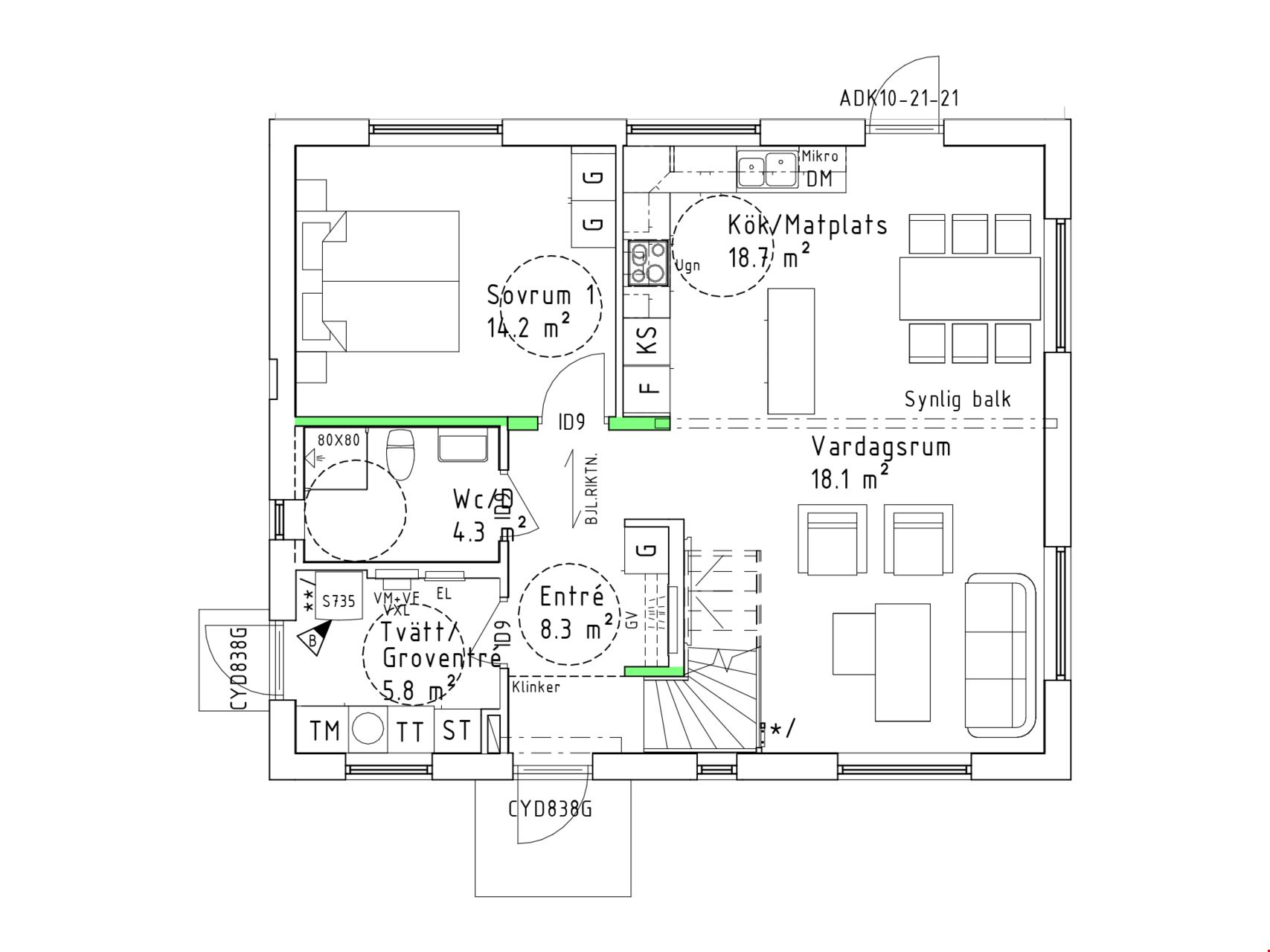 Köket kommer vara utrustad med en hög standard och inrett med en köksö. Luckorna är vita med diskreta rostfria handtag, bänkskivan är i svart laminat och vitvarorna svarta. I köket hittar du alla hushållsapparater som du behöver för att laga dina festliga måltider som: inbyggnadsugn, mikro, kyl, frys, spishäll, fläkt, diskmaskin, dämpade fullutdragslådor och mjukstängande luckor. Klicka här för att se ritningarna på köket. Badrummen är inredda med kakel och klinker, duschhörn med takdusch samt skogsgröna kommoder.