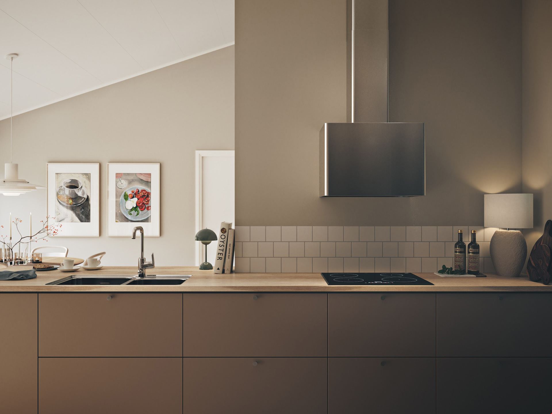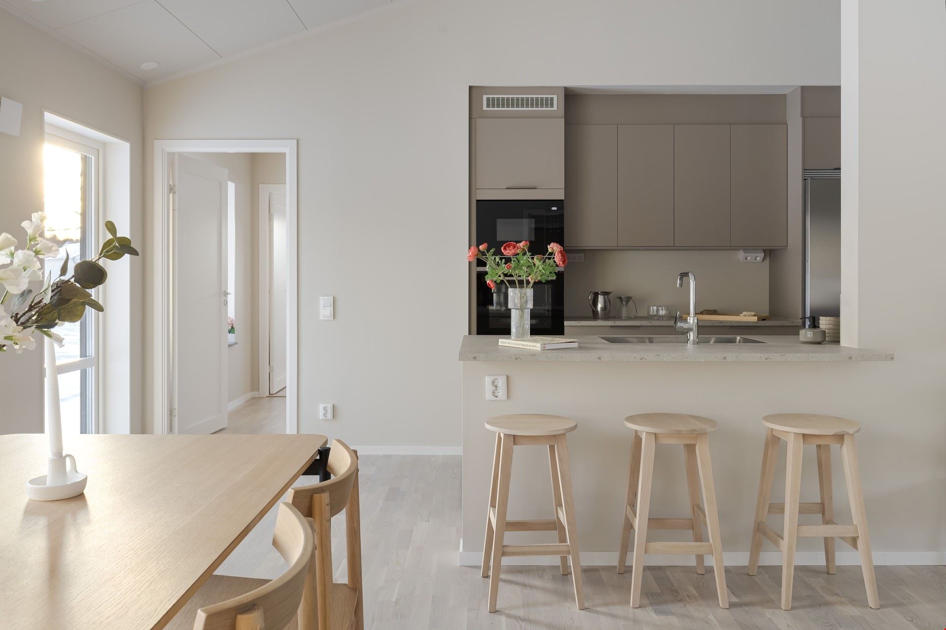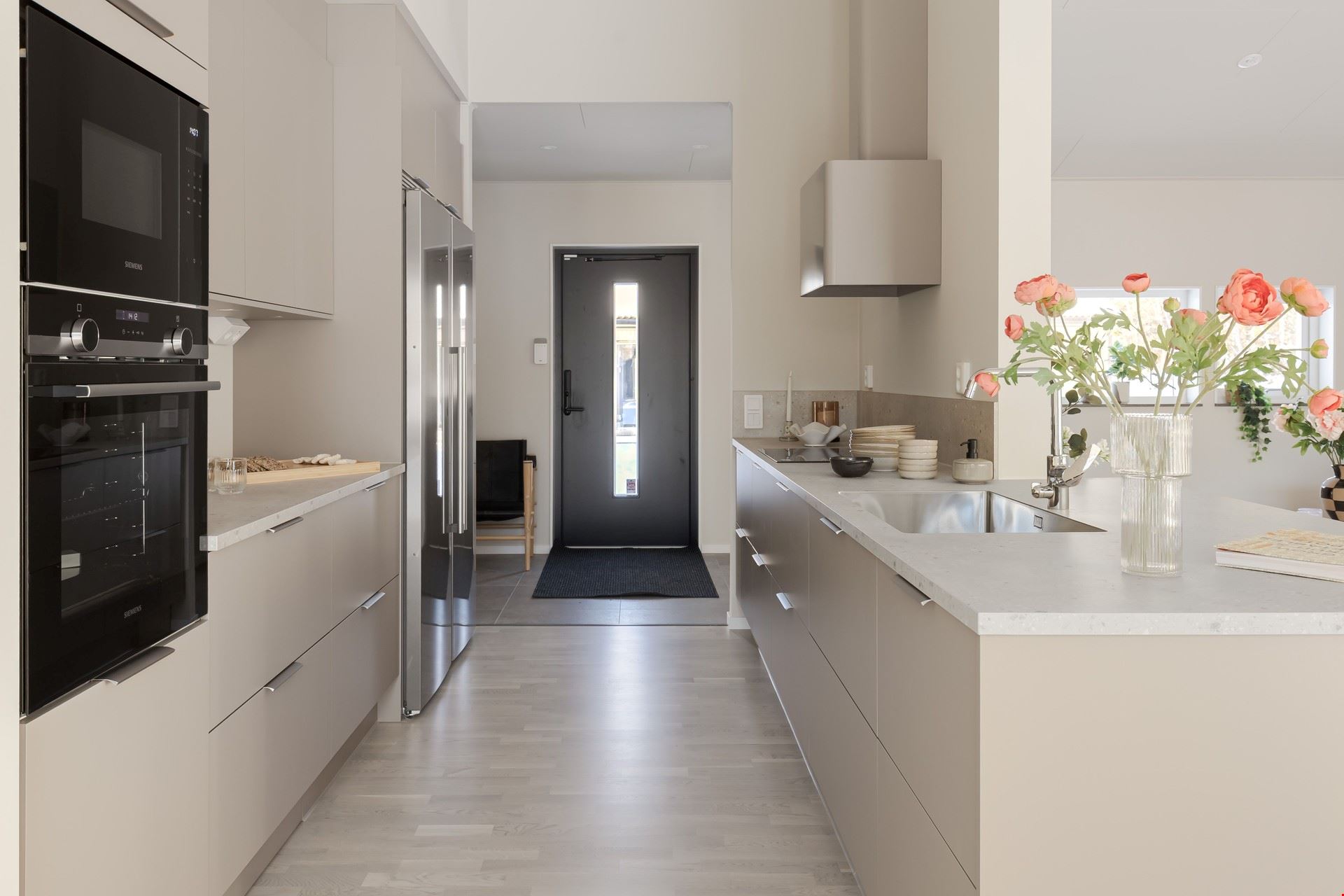 Köket kommer från HTH i modellen Stockholm i mockafärg, med matchande bänkskiva och stänkpanel i Delaware Stone – ett varmt, stilrent val som ger köket en hemtrevlig känsla.