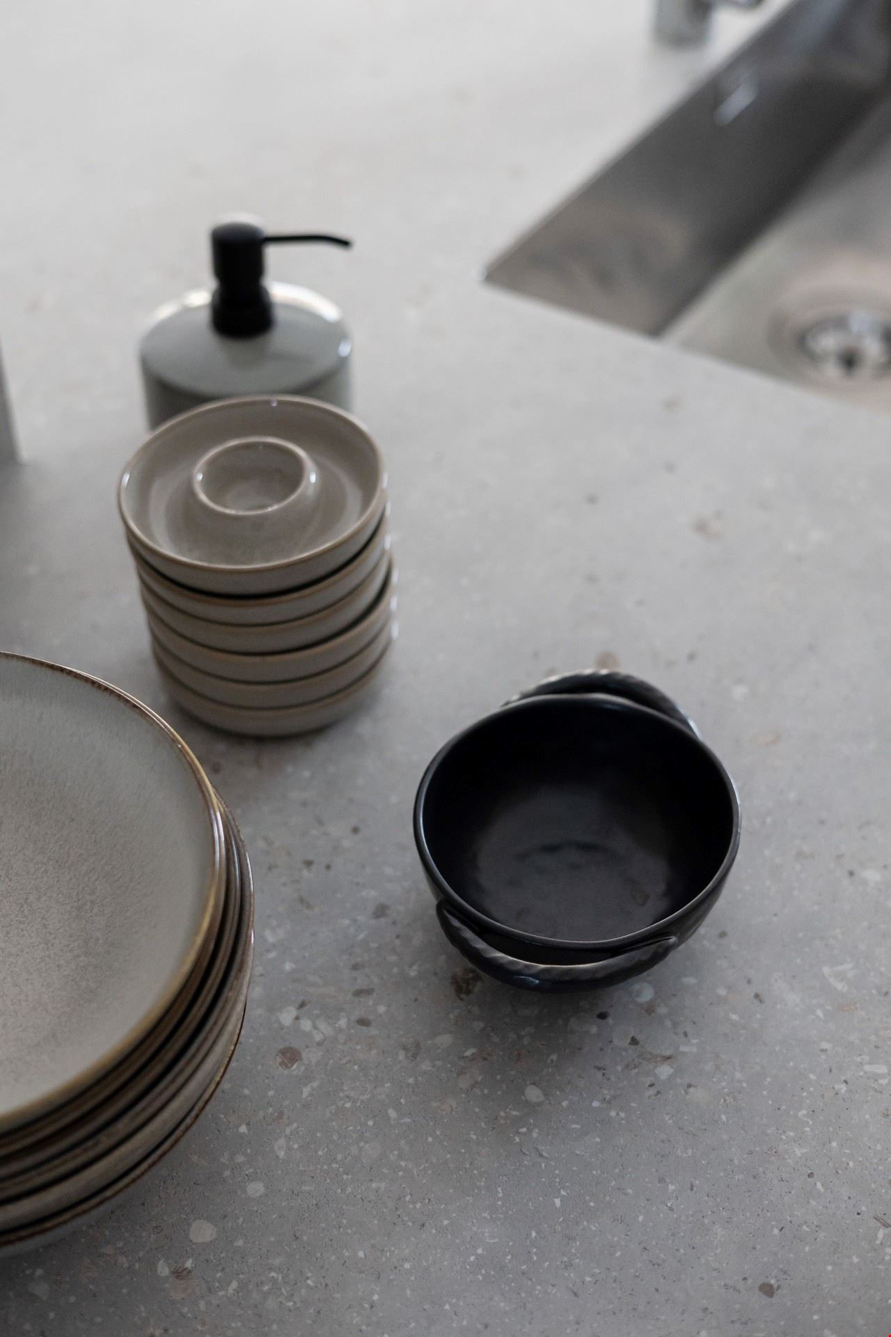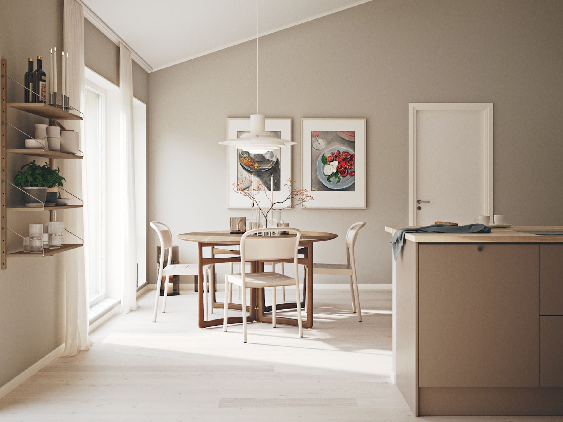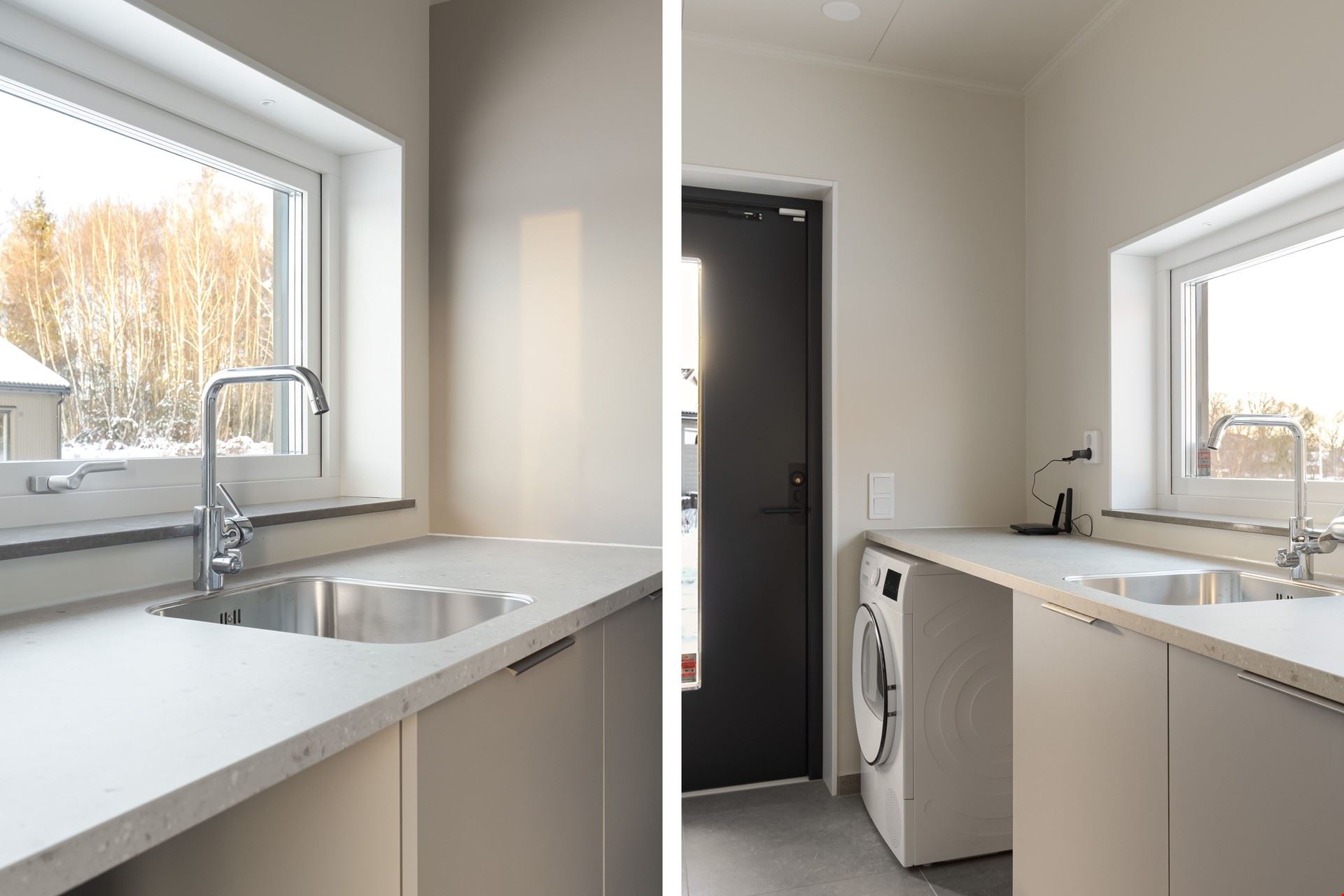 Köket kommer från HTH i modellen Stockholm i mockafärg, med matchande bänkskiva och stänkpanel i Delaware Stone – ett varmt, stilrent val som ger köket en hemtrevlig känsla.