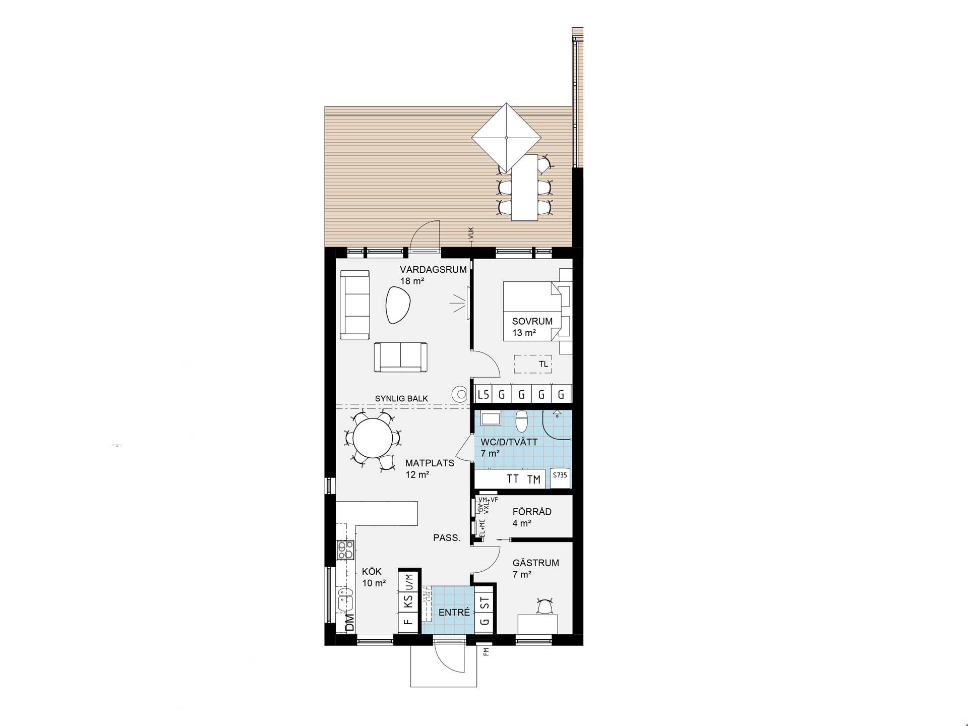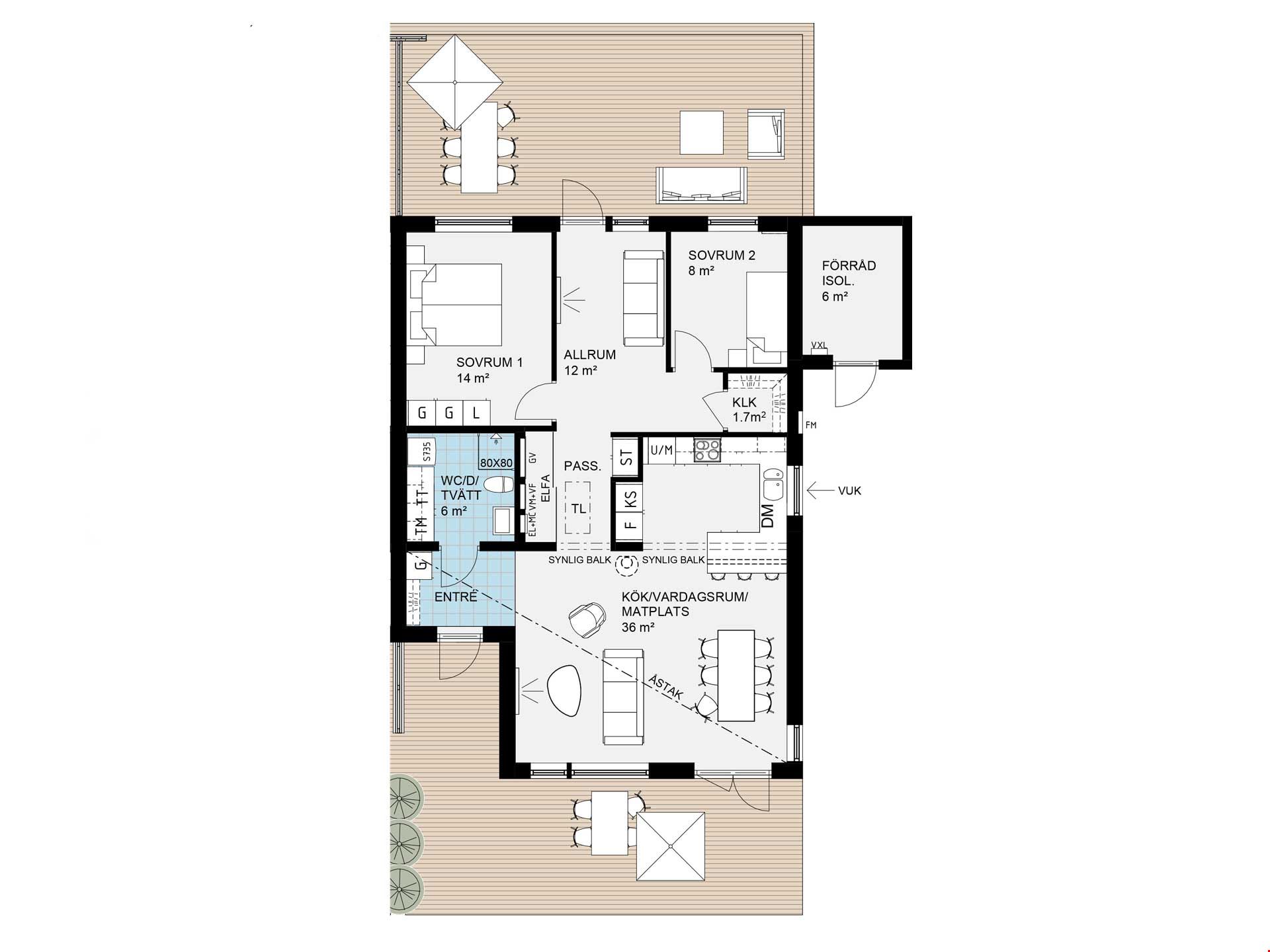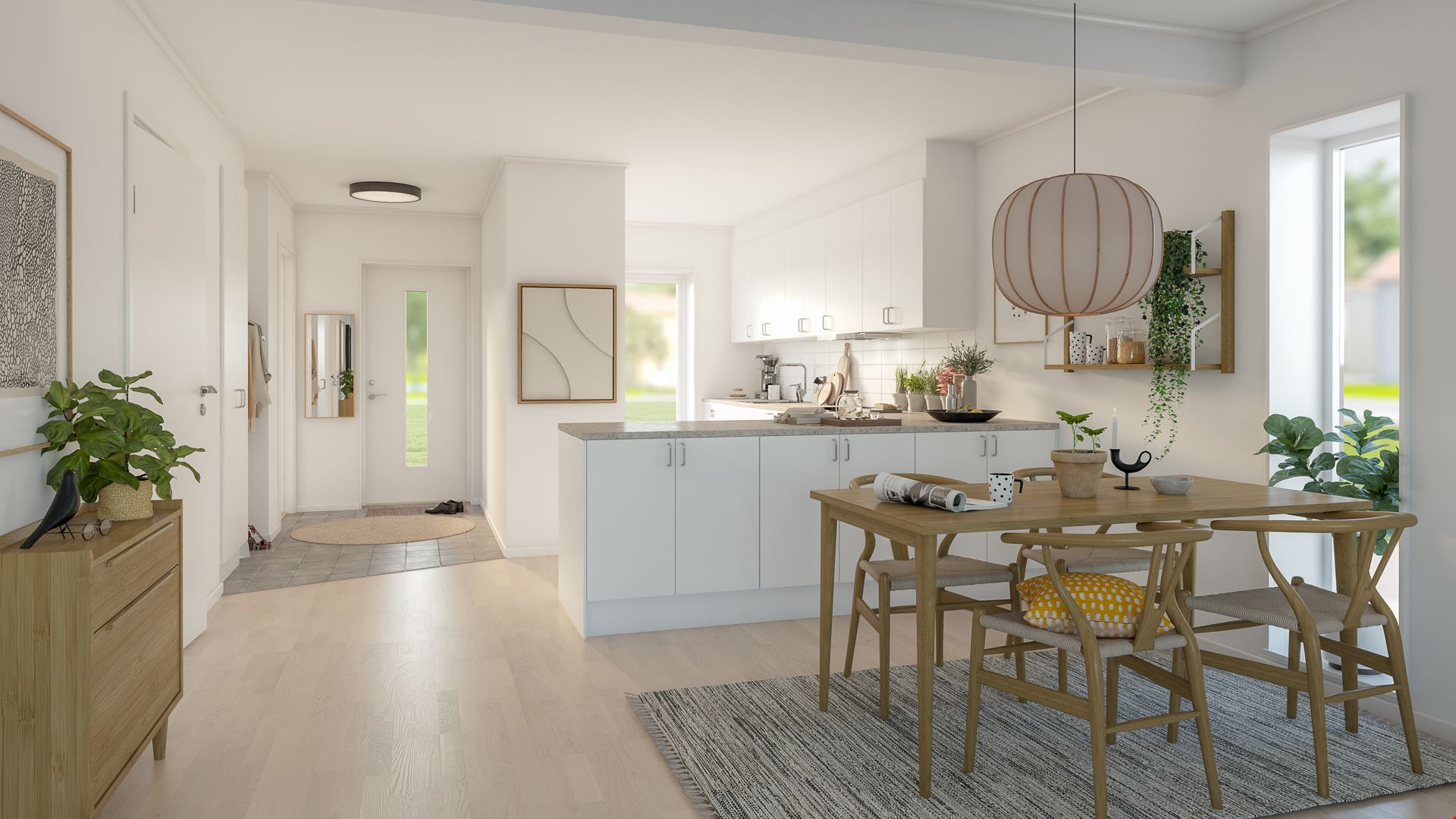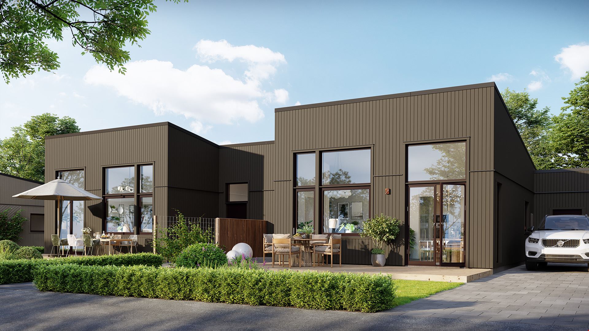 Det mindre av de två husen, på 77 kvm, passar perfekt för paret eller den lilla familjen som uppskattar sociala ytor och en lättskött planlösning. Här möts du av ett öppet samband mellan kök, matplats och vardagsrum – idealiskt för middagar, umgänge och lediga helger. Två sovrum, varav ett master bedroom med klädkammare, kompletteras av ett flexibelt rum som fungerar lika bra som gästrum, hemmakontor eller barnrum. Från vardagsrummet når du uteplatsen, en naturlig förlängning av hemmet under årets soliga dagar.