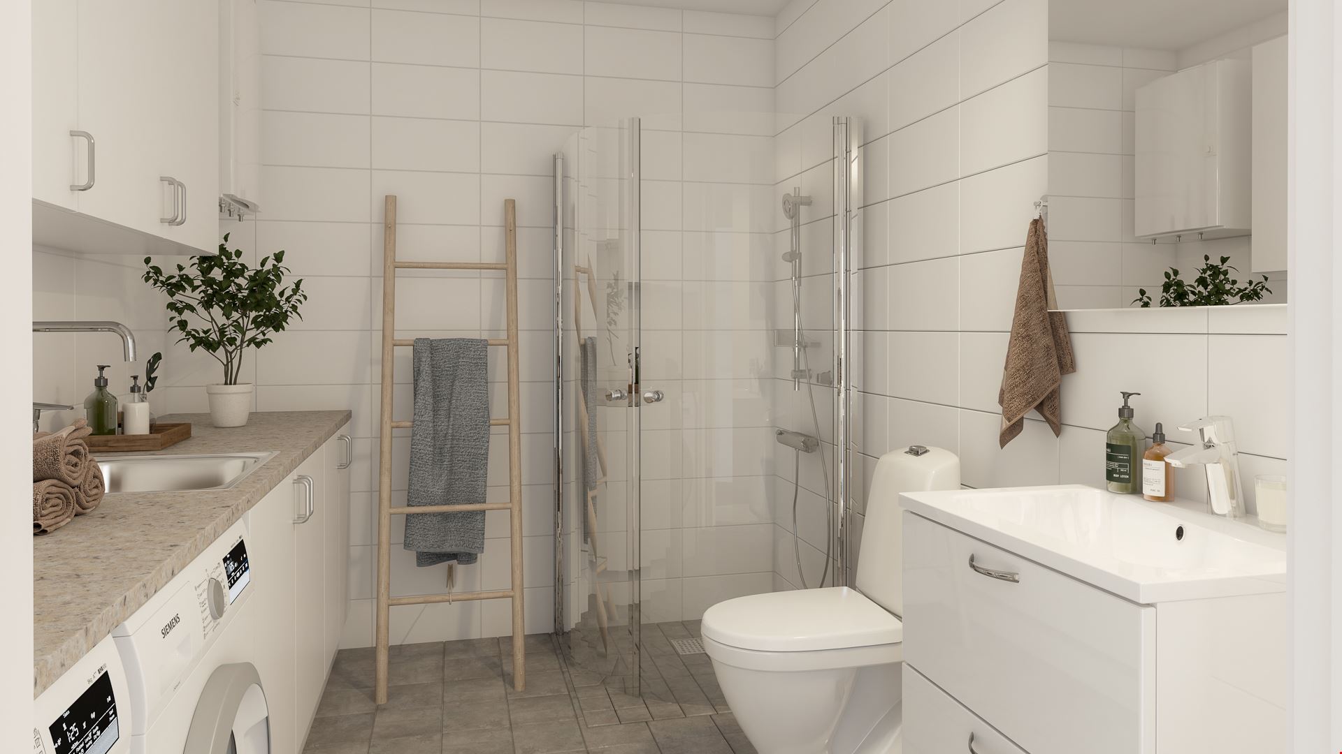 Det större huset, på 91 kvm, erbjuder extra rymd och flexibilitet med vardagsrum i ryggåstak och direkt utgång till altanen. Här finns ett generöst master bedroom med gott om förvaring, två extra rum som passar som barnrum, kontor eller hobbyrum samt ett stort badrum med tvättdel och separat gäst-WC.