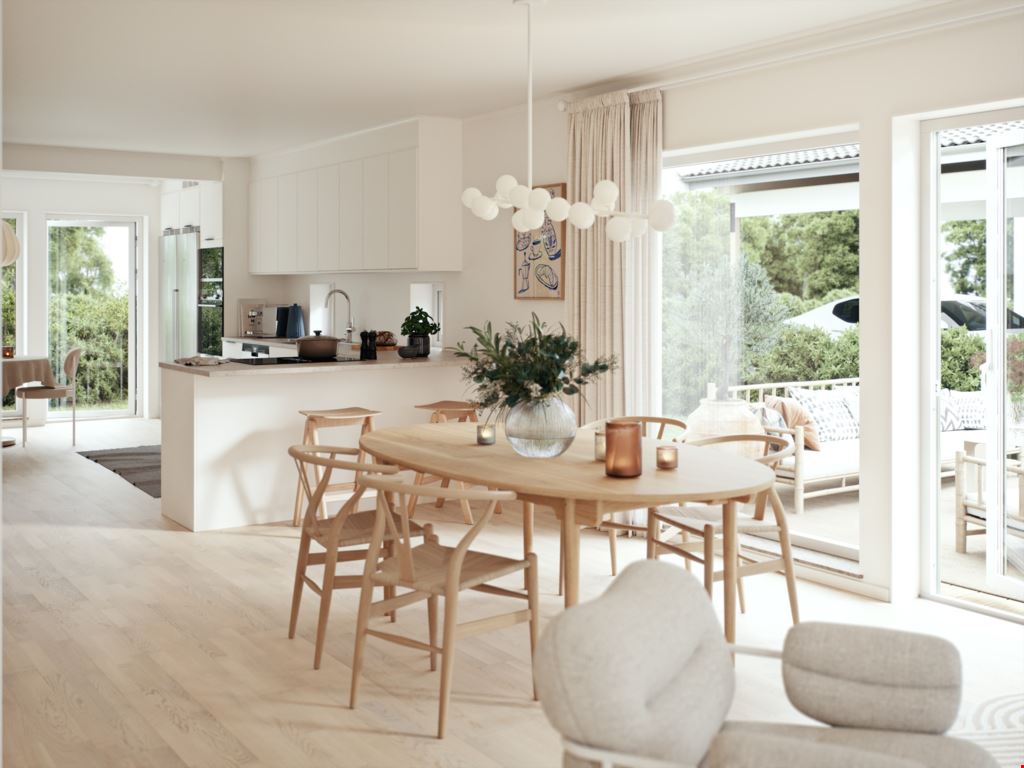 Husen erbjuder en ljus och social planlösning med kök och vardagsrum i öppen anslutning, generösa sällskapsytor och plats för upp till fyra sovrum. På övervåningen finns ett mysigt allrum och master bedroom med gott om förvaring. Två badrum, en praktisk tvättstuga med groventré från carporten samt förråd gör vardagen smidigare.