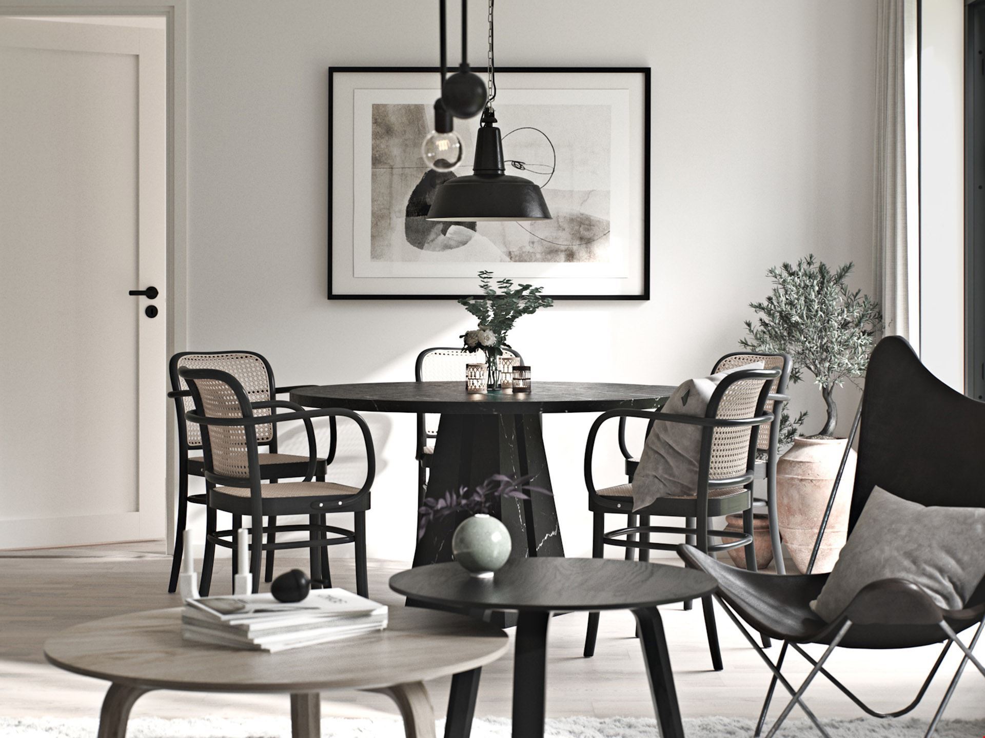 Med öppen planlösning mellan kök, matplats och vardagsrum skapas en ljus och luftig känsla – perfekt för både vardagsmys och festliga tillfällen. De stora fönstren släpper in rikligt med dagsljus och ger kontakt med naturen utanför, medan ryggåstaket förstärker rymden och ger en exklusiv känsla.