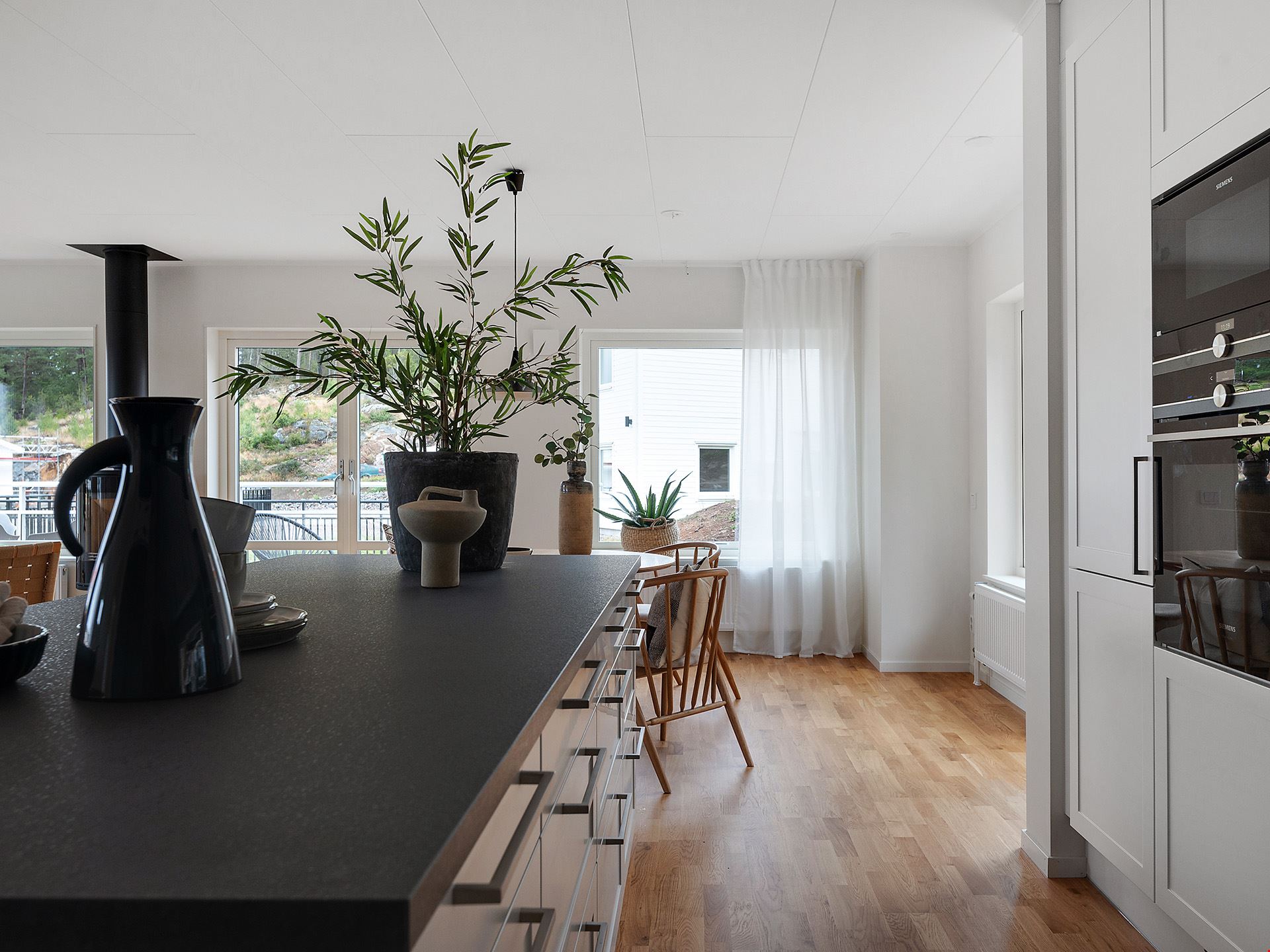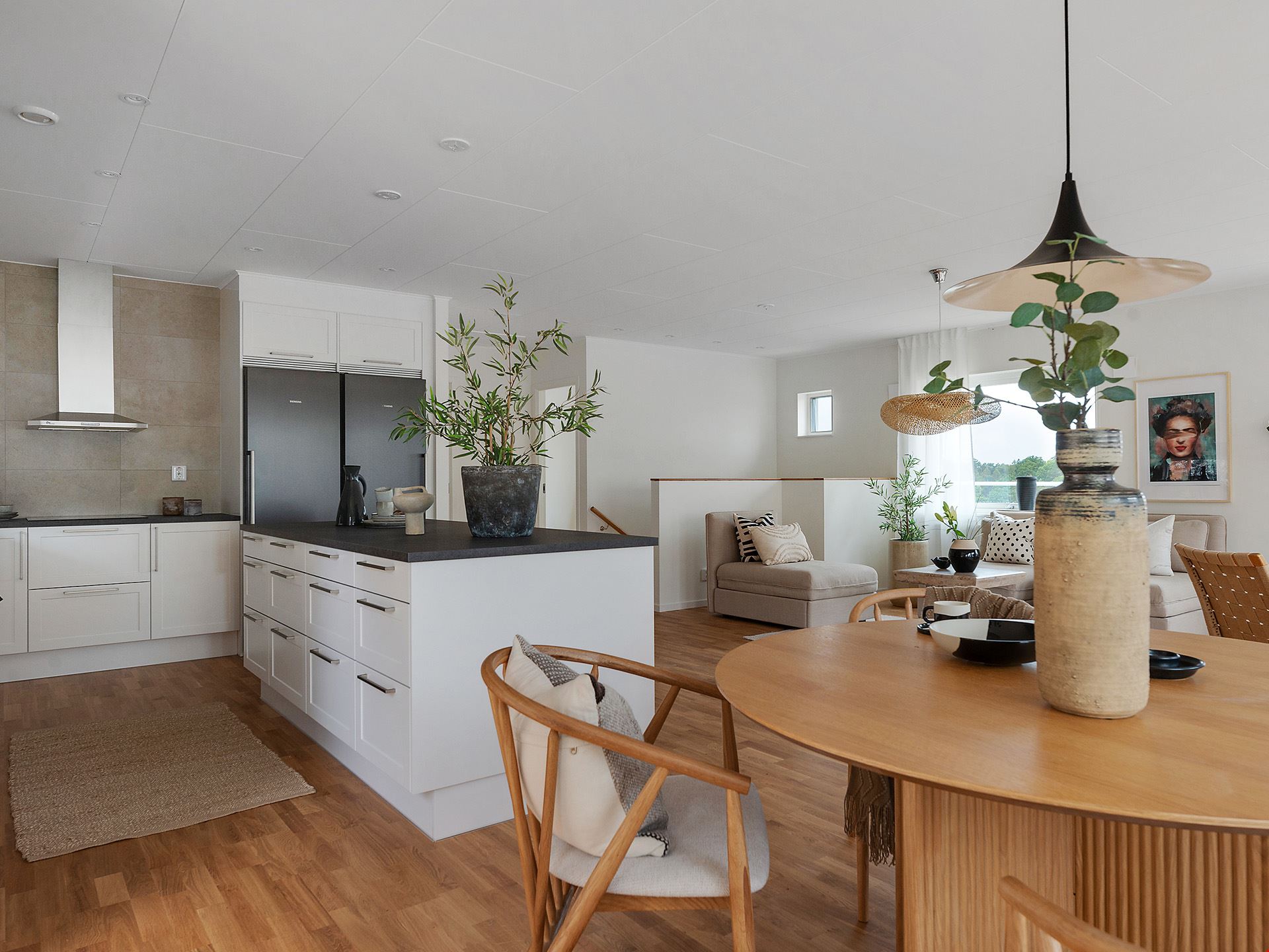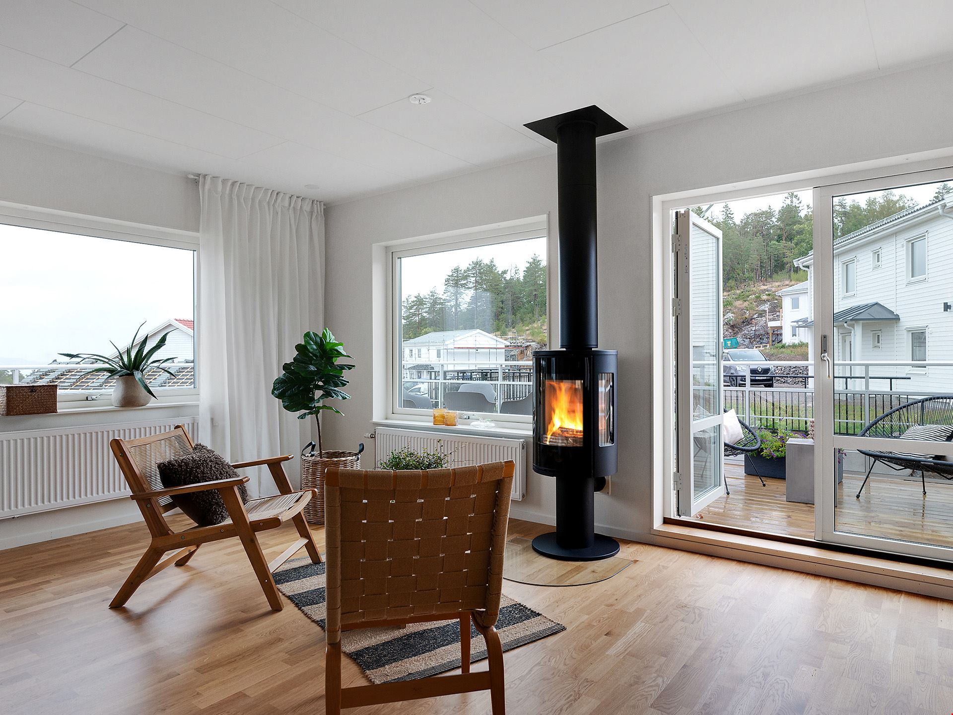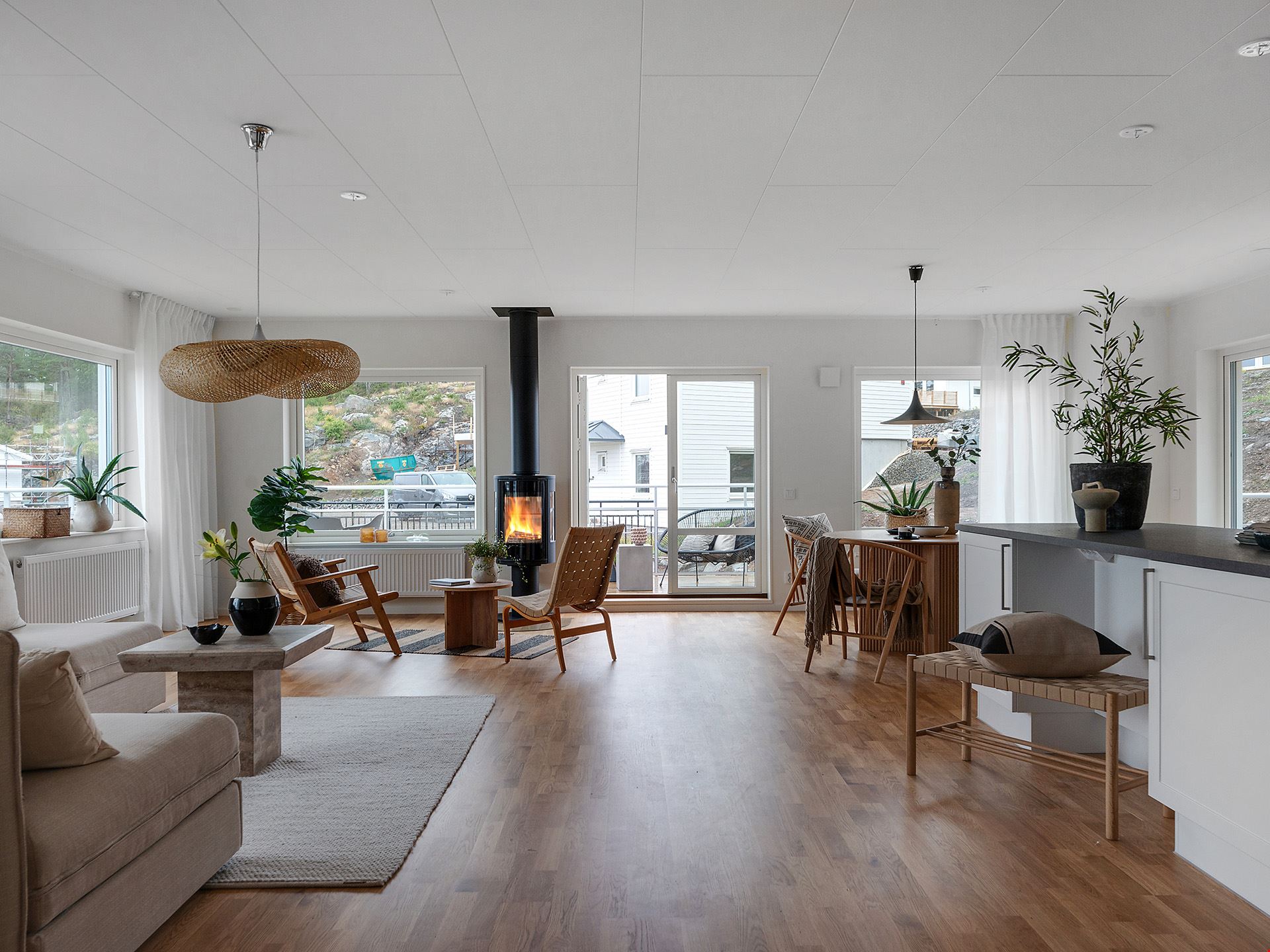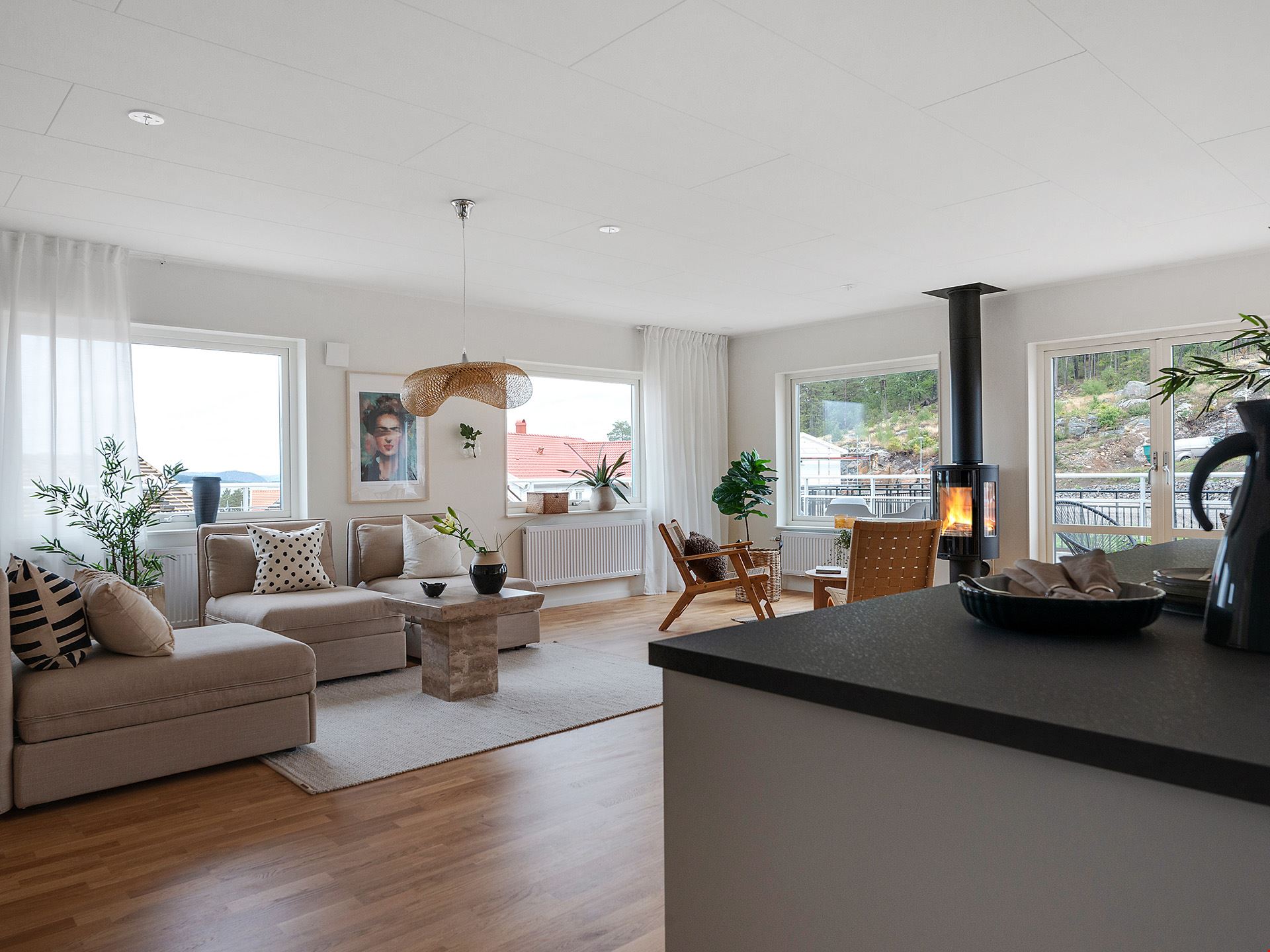 När vi tar trappan upp till det övre våningsplanet så kommer du till husets hjärta. Här är kök och vardagsrum placerade i ett öppet stråk för att ta vara på utsikten. Ljusinsläppet här inne är fantastiskt tack vare fönster i tre olika väderstreck. I vardagsrummet står en härlig braskamin som höjer mysfaktorn. Från vardagsrummet tar du dig också ut till den stora balkongen. Köket kommer från HTH och har en klassisk, tidlös stil med svarta vitvaror och köksö. (Klicka här för att se ritningarna på köket). På det här våningsplanet hittar du också husets master bedroom som bjuder på gott om förvaring, ett mindre sovrum och badrum. Badrummet är inrett med kakel och klinker, duschhörn, handdustork och svart kommod.