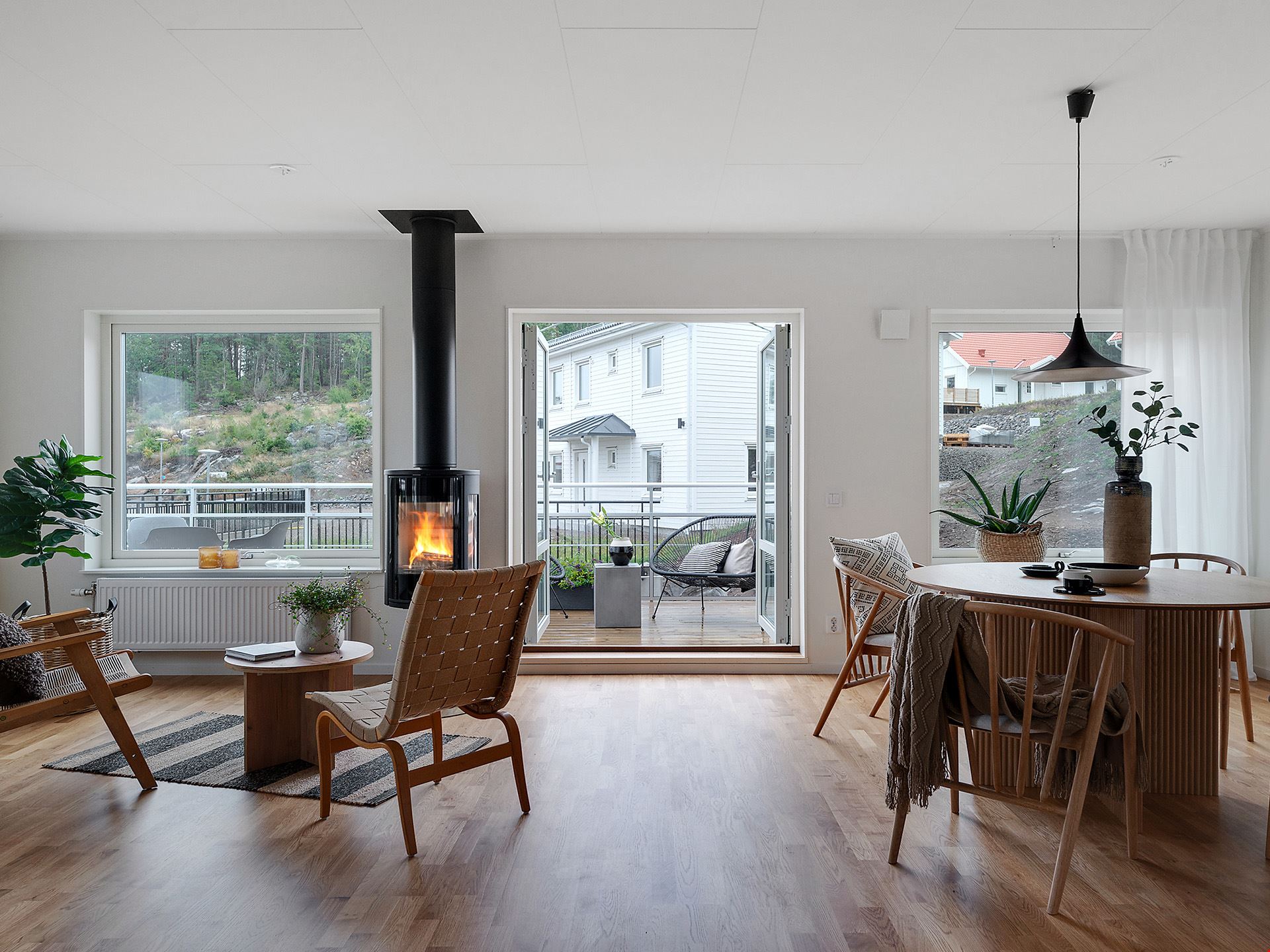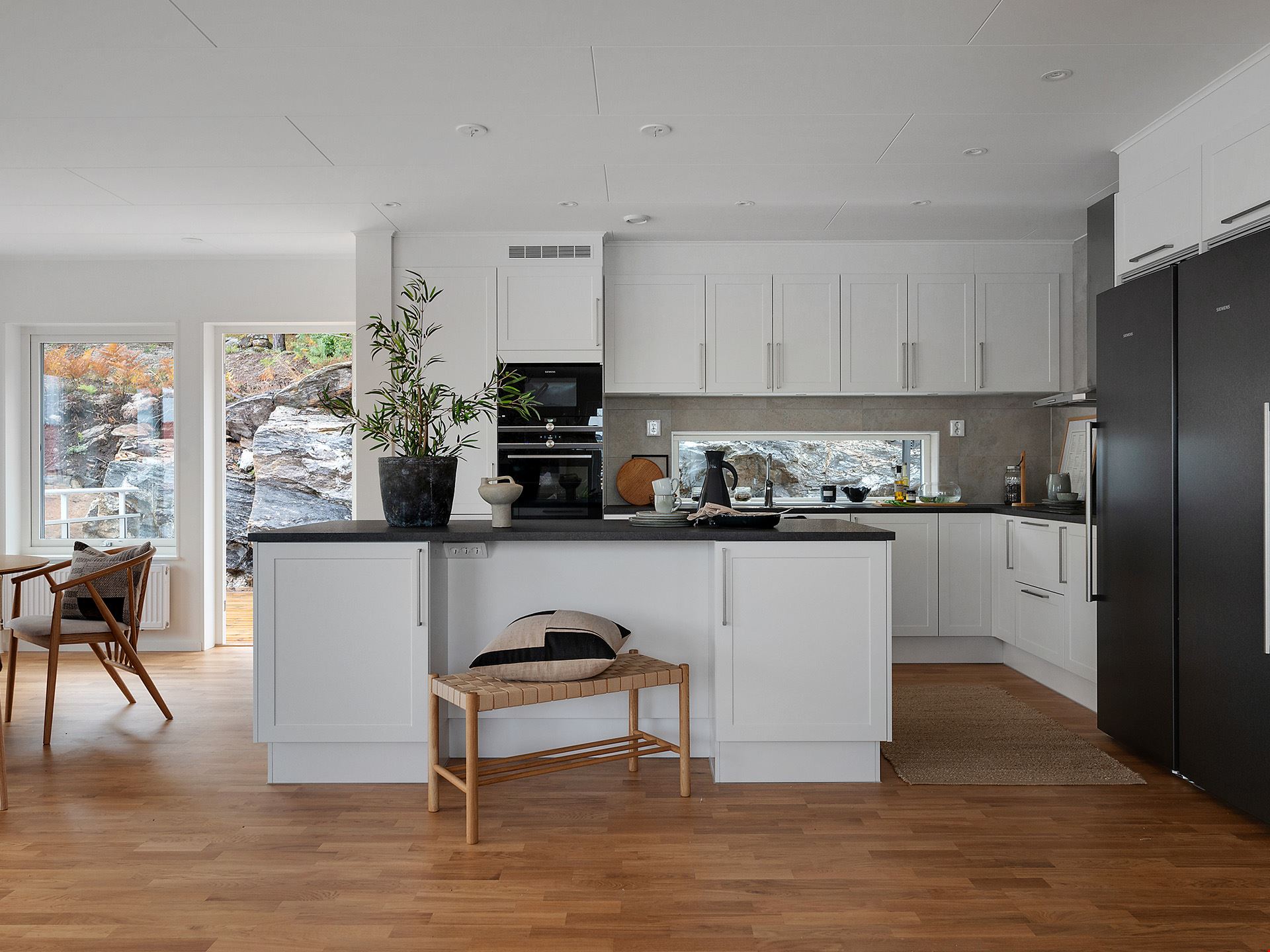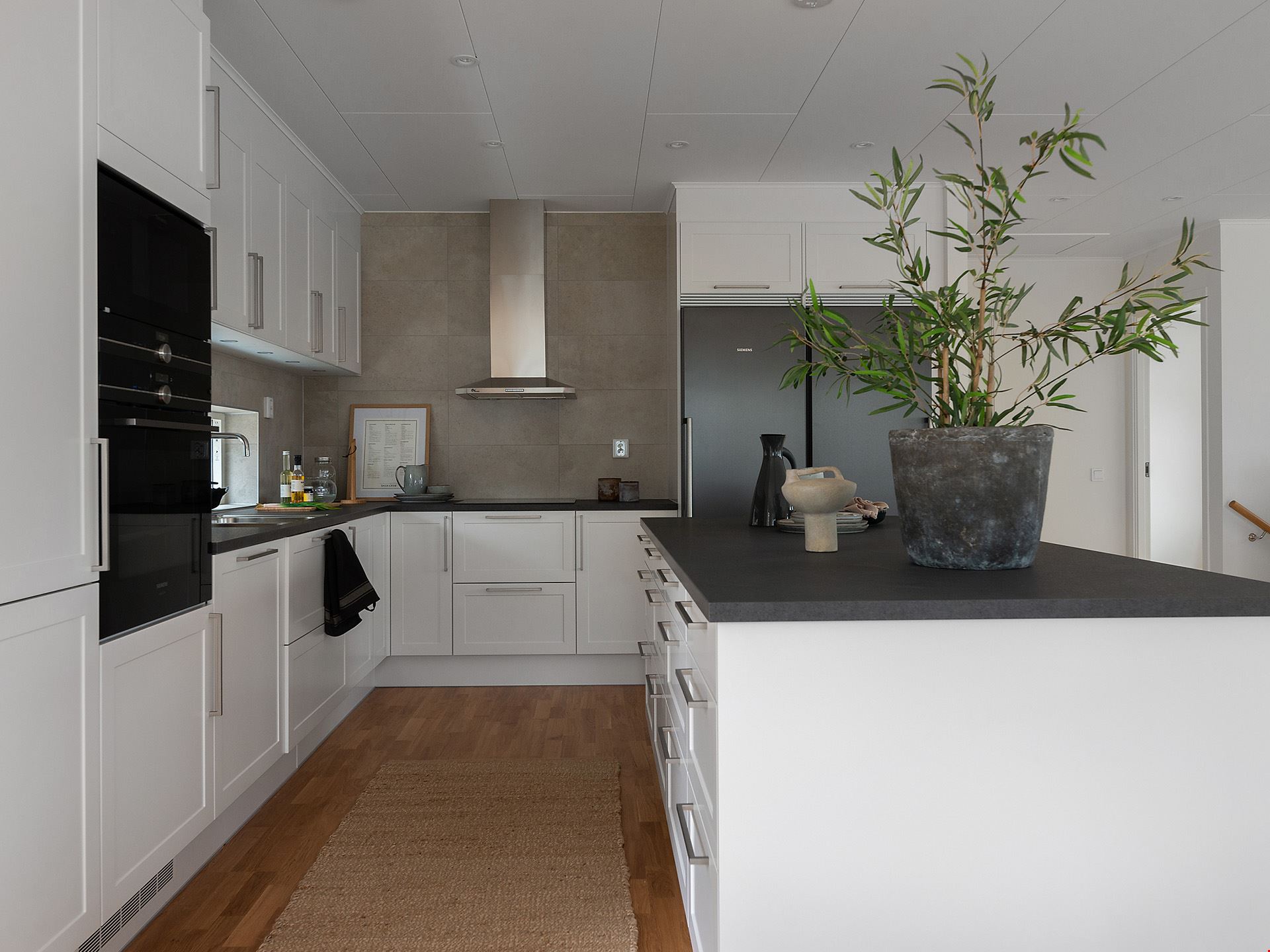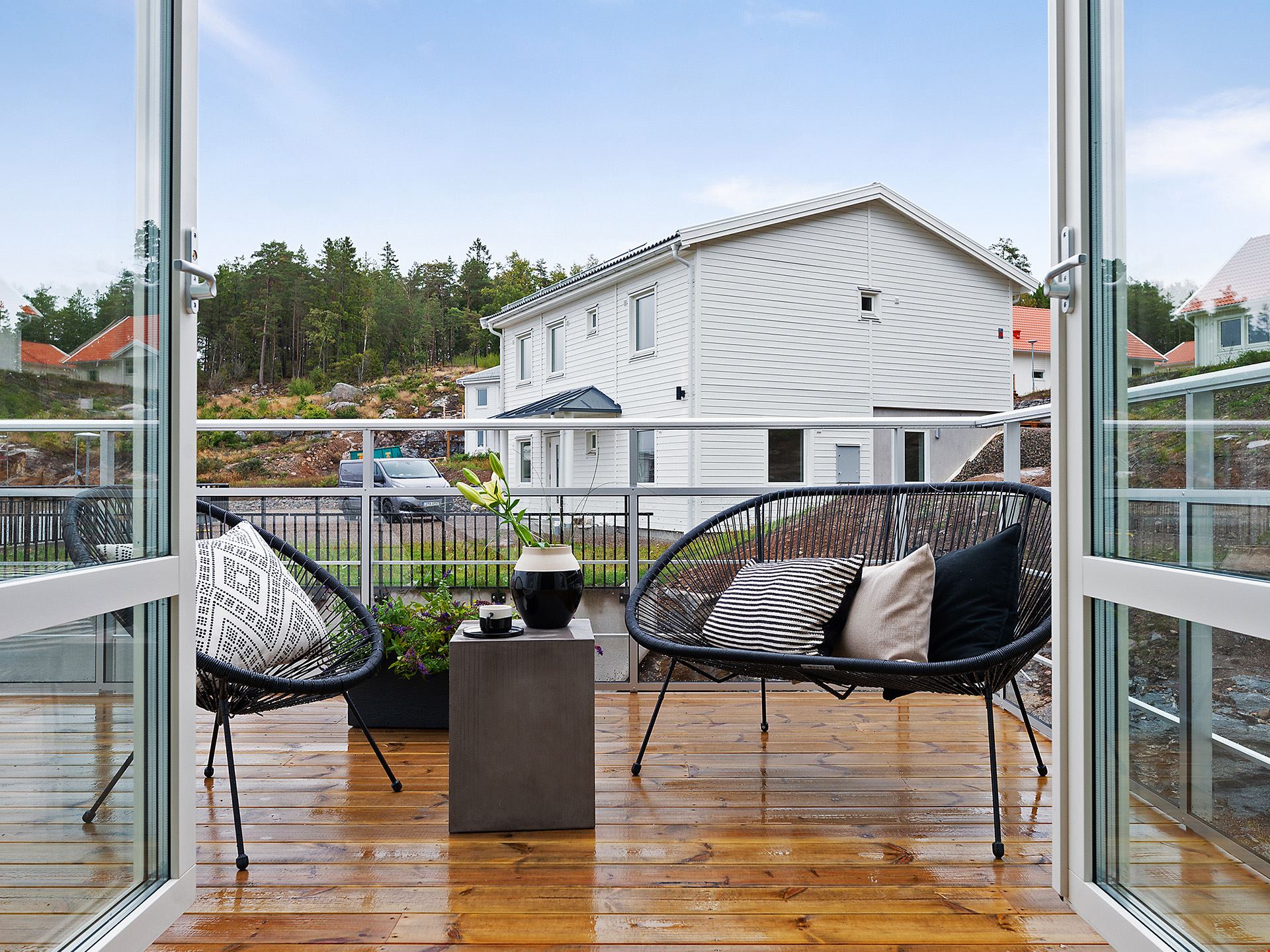 När vi tar trappan upp till det övre våningsplanet så kommer du till husets hjärta. Här är kök och vardagsrum placerade i ett öppet stråk för att ta vara på utsikten. Ljusinsläppet här inne är fantastiskt tack vare fönster i tre olika väderstreck. I vardagsrummet står en härlig braskamin som höjer mysfaktorn. Från vardagsrummet tar du dig också ut till den stora balkongen. Köket kommer från HTH och har en klassisk, tidlös stil med svarta vitvaror och köksö. (Klicka här för att se ritningarna på köket). På det här våningsplanet hittar du också husets master bedroom som bjuder på gott om förvaring, ett mindre sovrum och badrum. Badrummet är inrett med kakel och klinker, duschhörn, handdustork och svart kommod.
