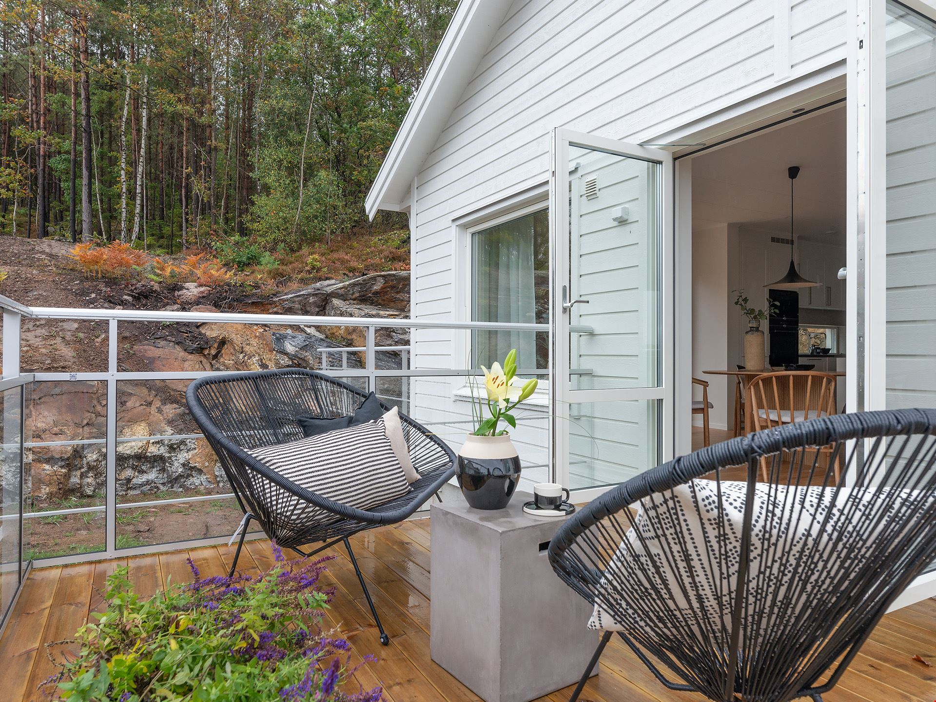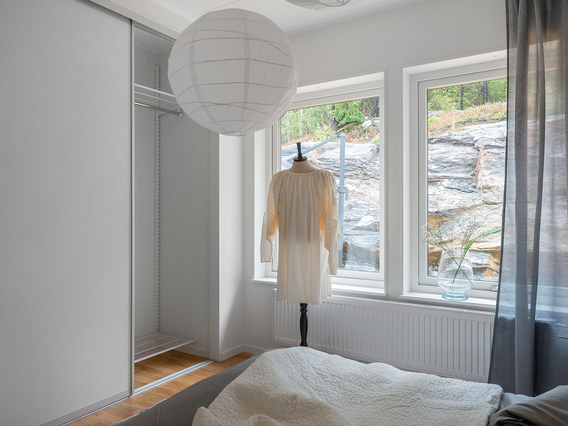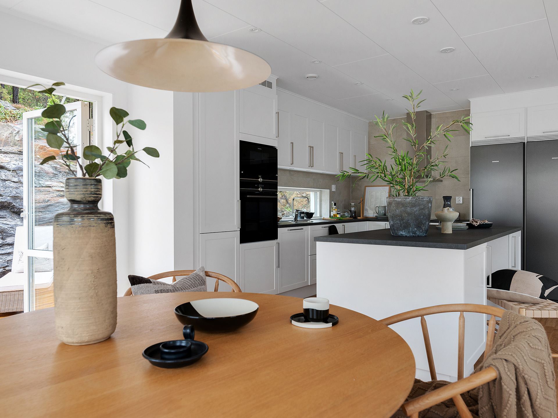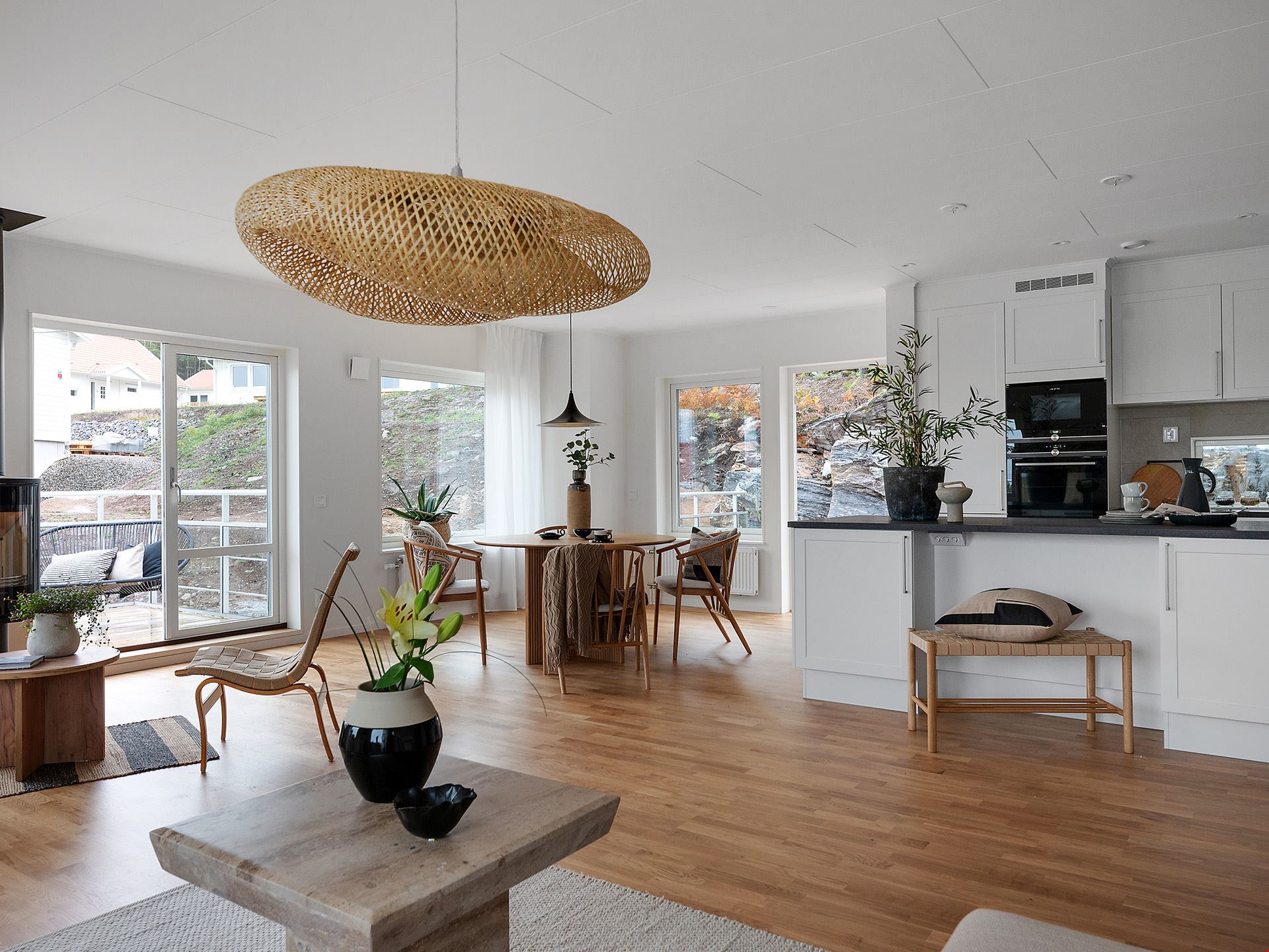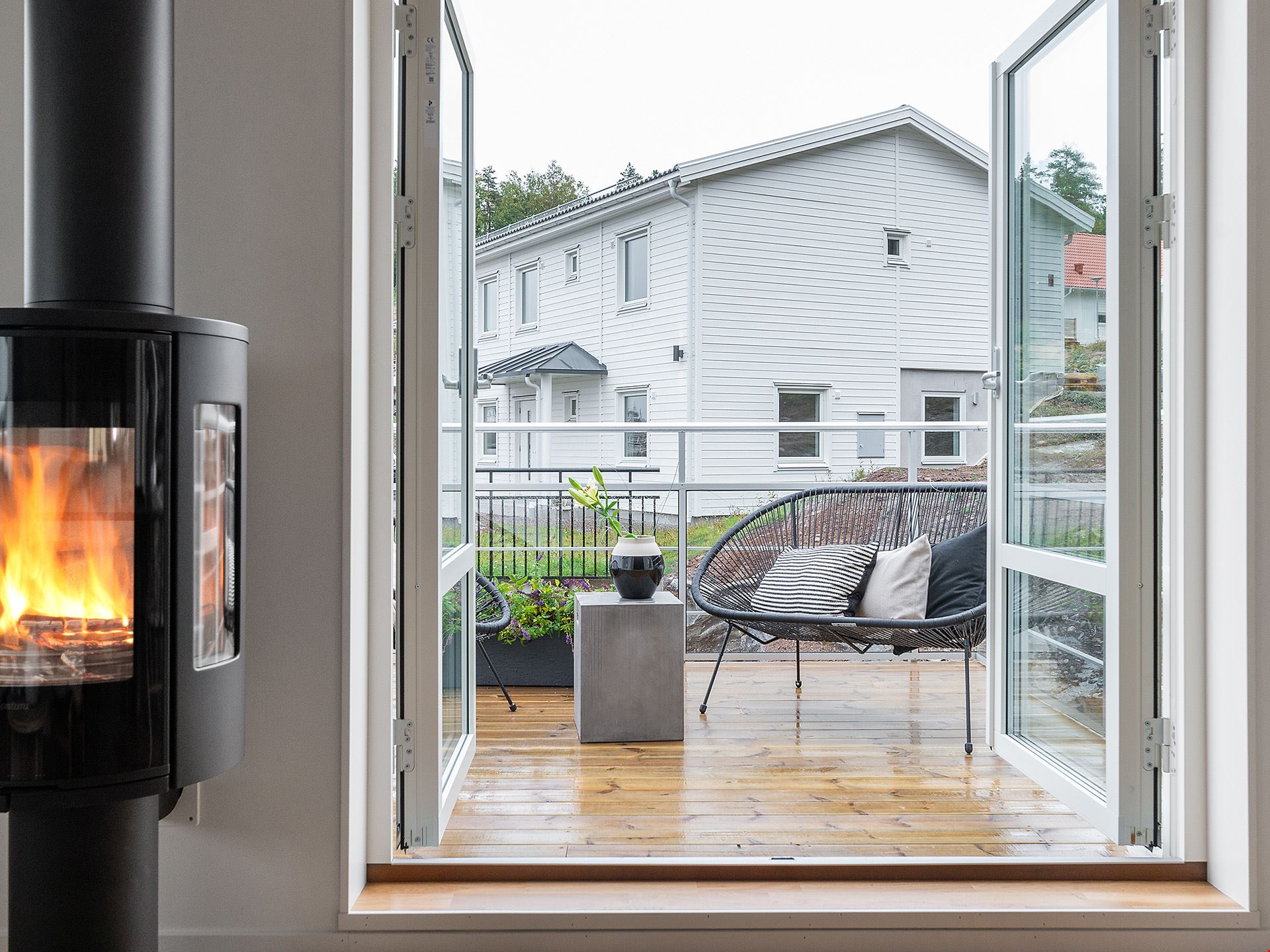 När vi tar trappan upp till det övre våningsplanet så kommer du till husets hjärta. Här är kök och vardagsrum placerade i ett öppet stråk för att ta vara på utsikten. Ljusinsläppet här inne är fantastiskt tack vare fönster i tre olika väderstreck. I vardagsrummet står en härlig braskamin som höjer mysfaktorn. Från vardagsrummet tar du dig också ut till den stora balkongen. Köket kommer från HTH och har en klassisk, tidlös stil med svarta vitvaror och köksö. (Klicka här för att se ritningarna på köket). På det här våningsplanet hittar du också husets master bedroom som bjuder på gott om förvaring, ett mindre sovrum och badrum. Badrummet är inrett med kakel och klinker, duschhörn, handdustork och svart kommod.