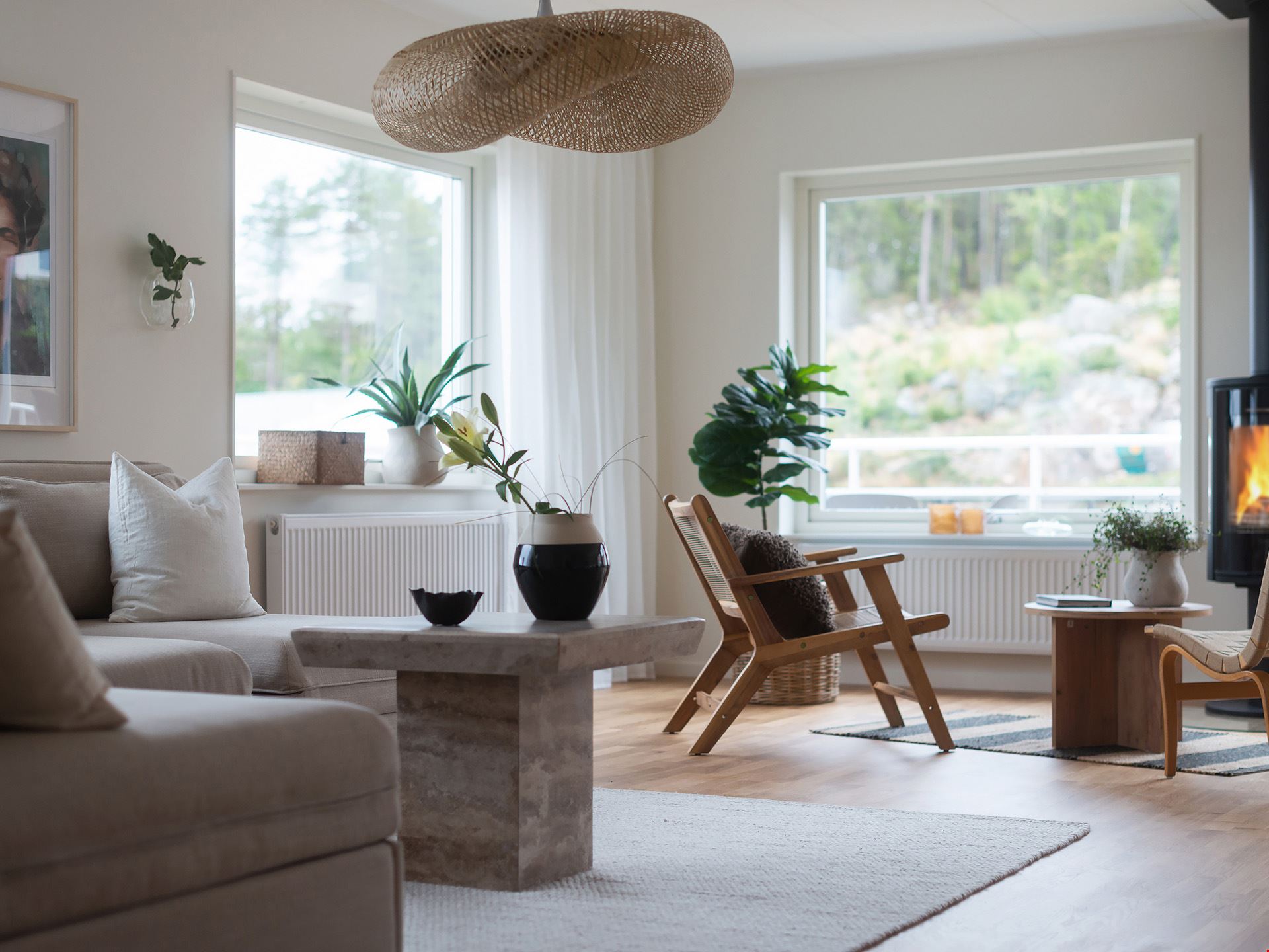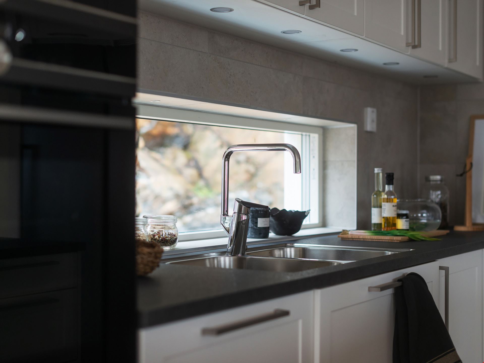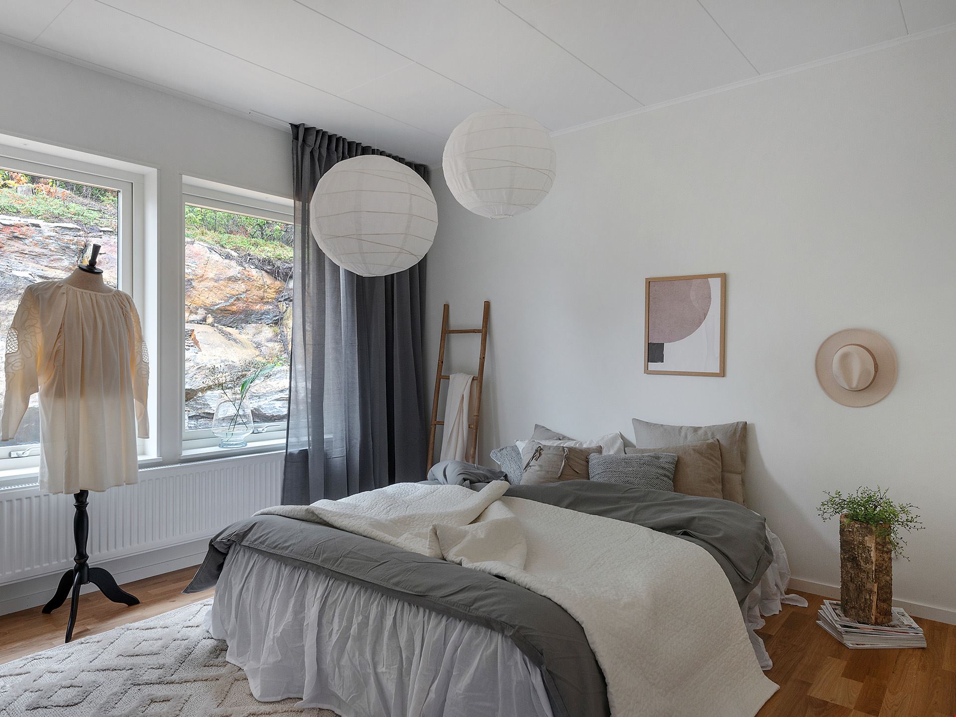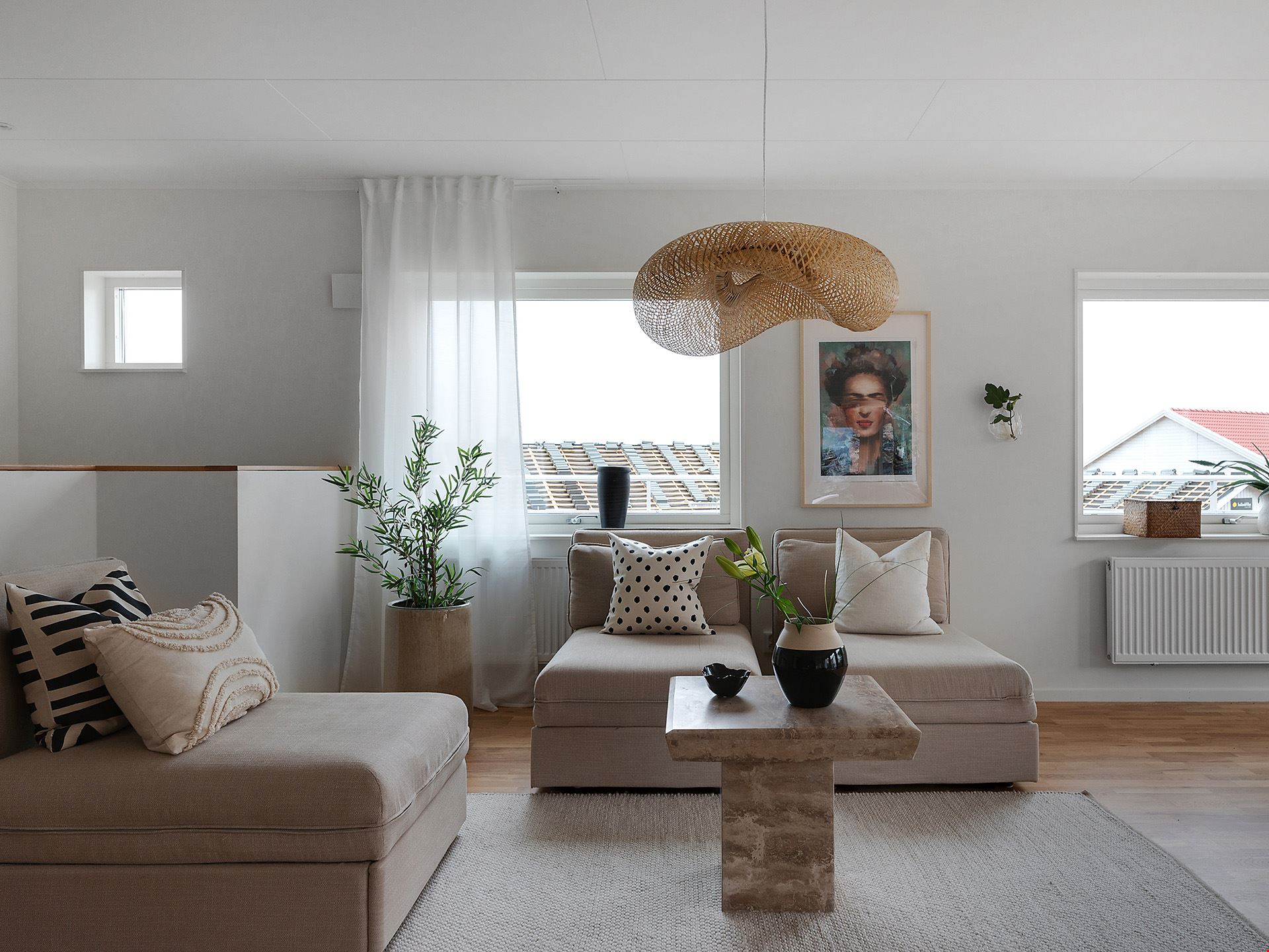 När vi tar trappan upp till det övre våningsplanet så kommer du till husets hjärta. Här är kök och vardagsrum placerade i ett öppet stråk för att ta vara på utsikten. Ljusinsläppet här inne är fantastiskt tack vare fönster i tre olika väderstreck. I vardagsrummet står en härlig braskamin som höjer mysfaktorn. Från vardagsrummet tar du dig också ut till den stora balkongen. Köket kommer från HTH och har en klassisk, tidlös stil med svarta vitvaror och köksö. (Klicka här för att se ritningarna på köket). På det här våningsplanet hittar du också husets master bedroom som bjuder på gott om förvaring, ett mindre sovrum och badrum. Badrummet är inrett med kakel och klinker, duschhörn, handdustork och svart kommod.