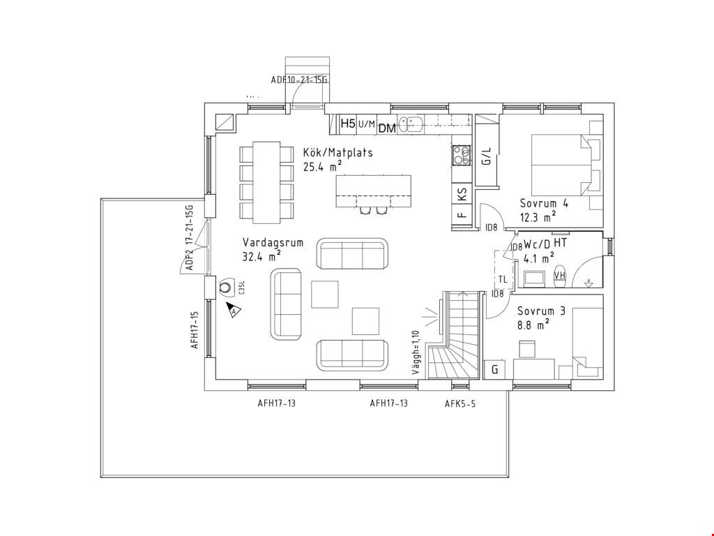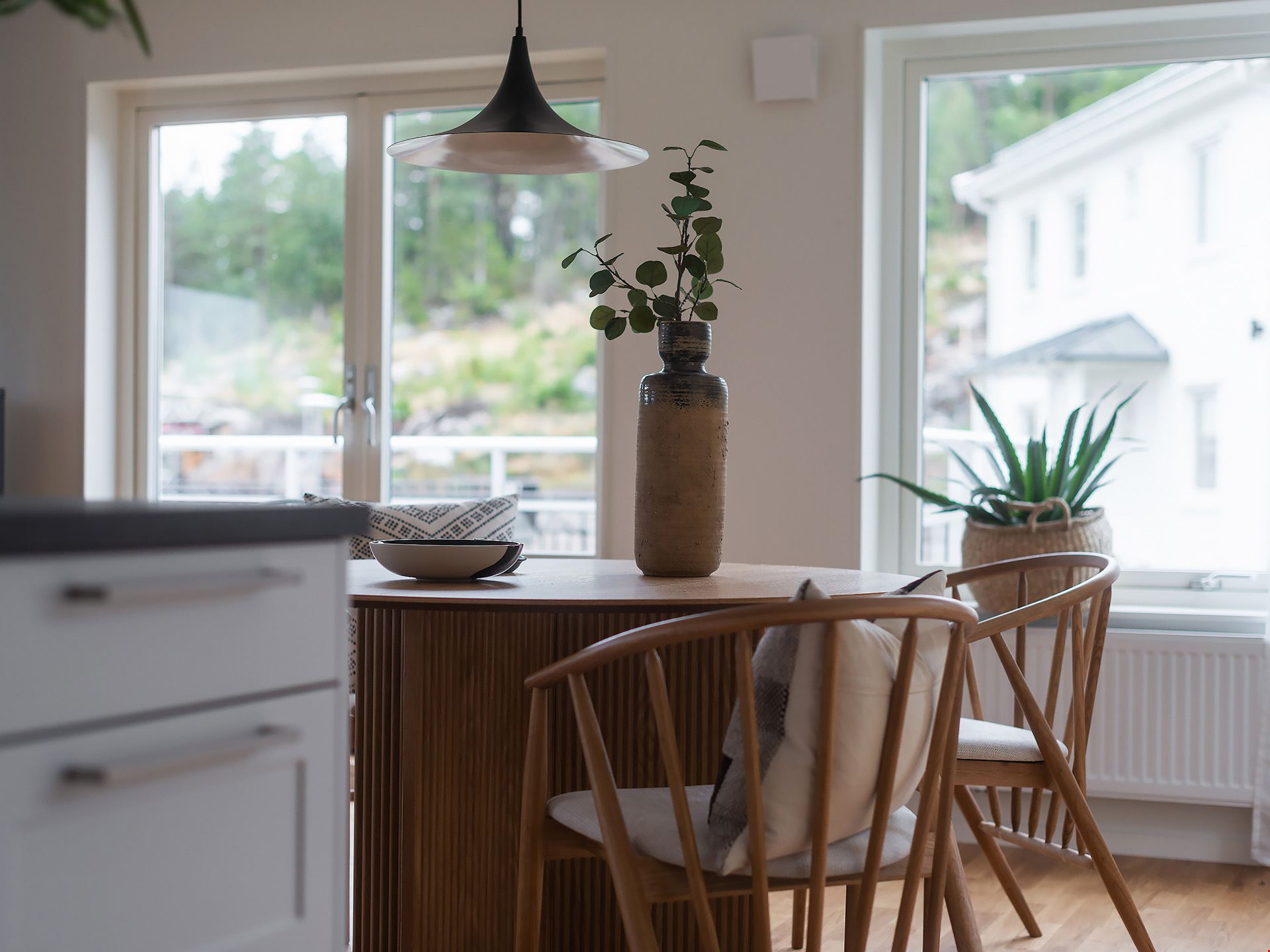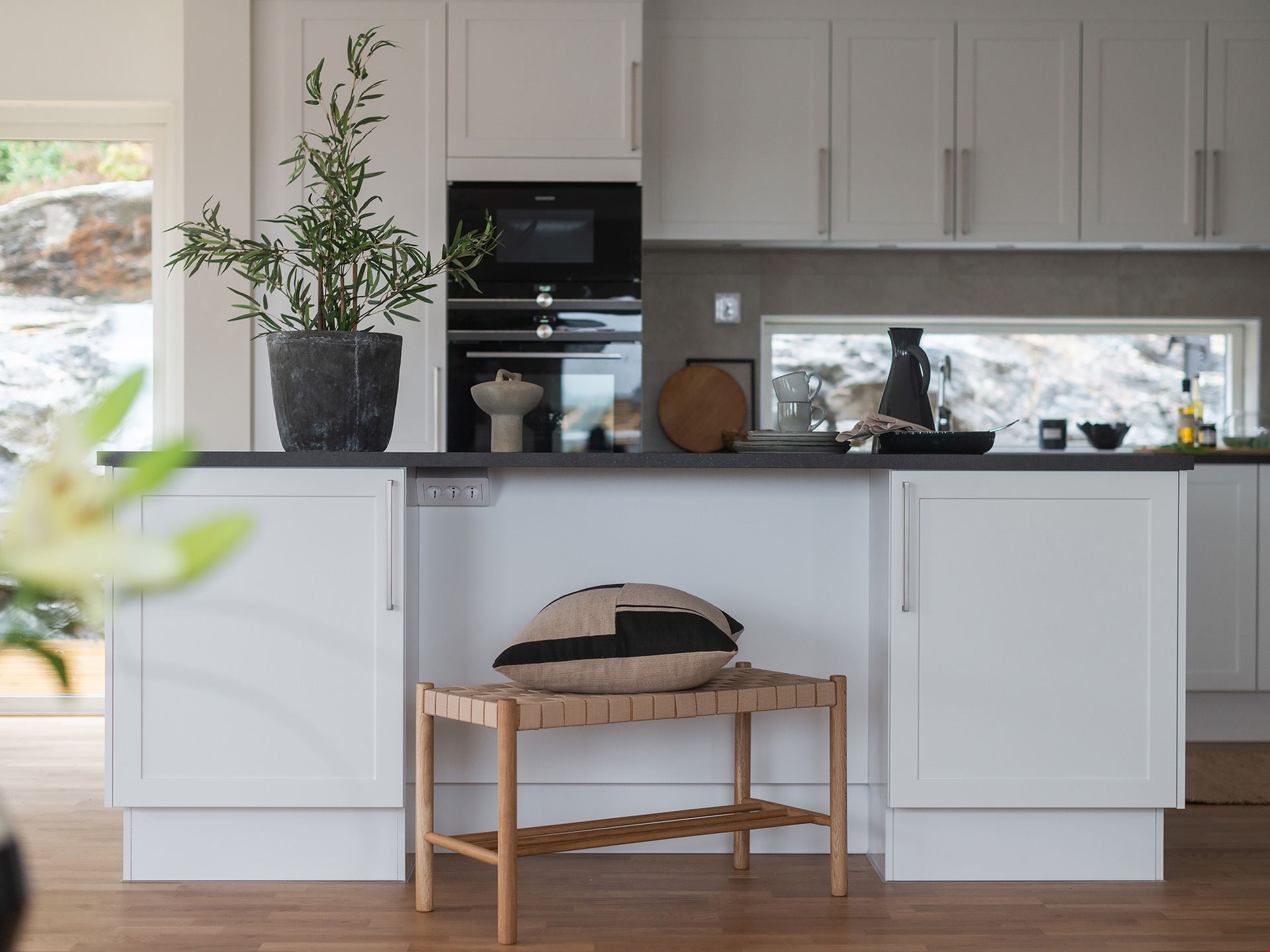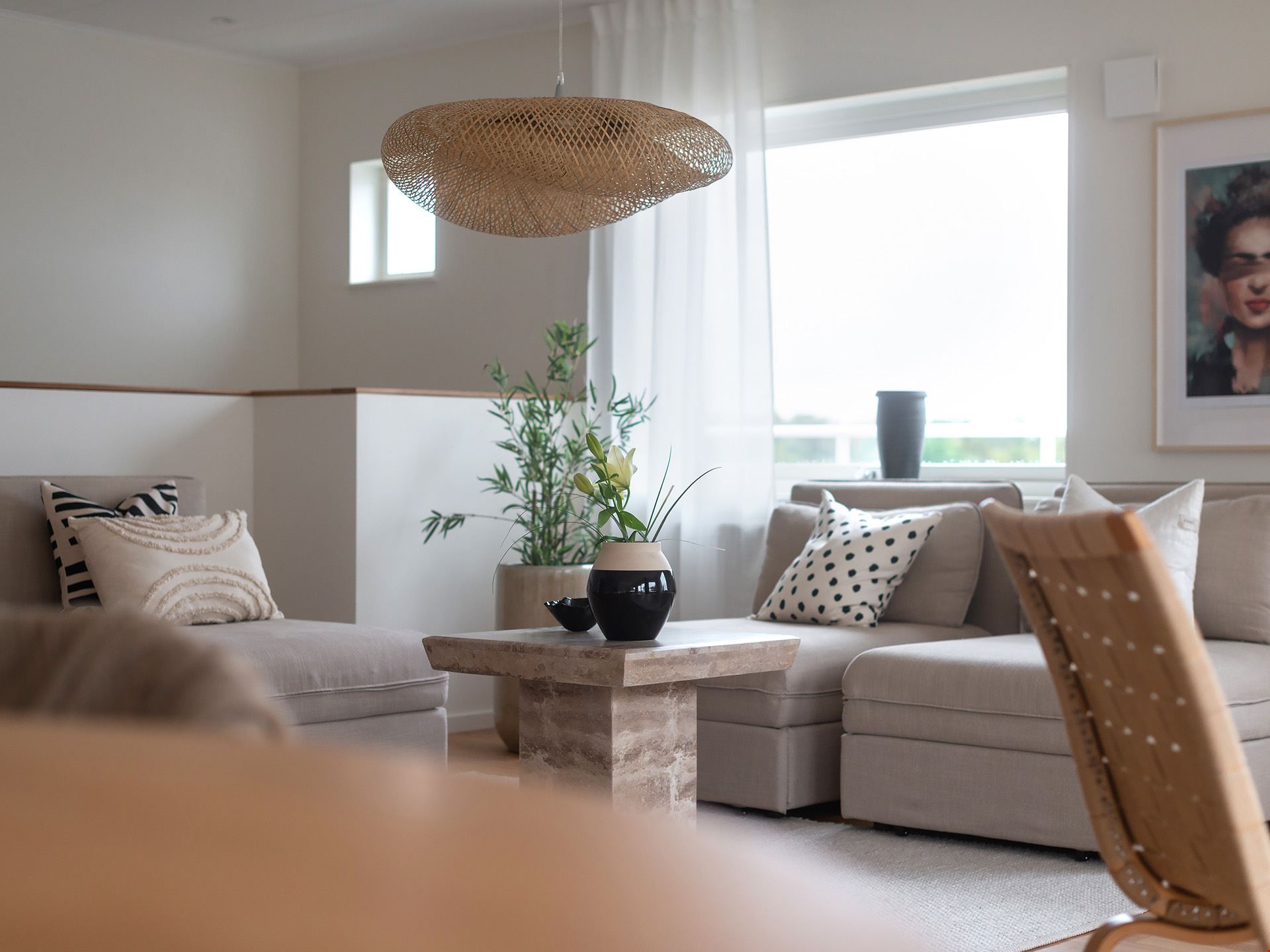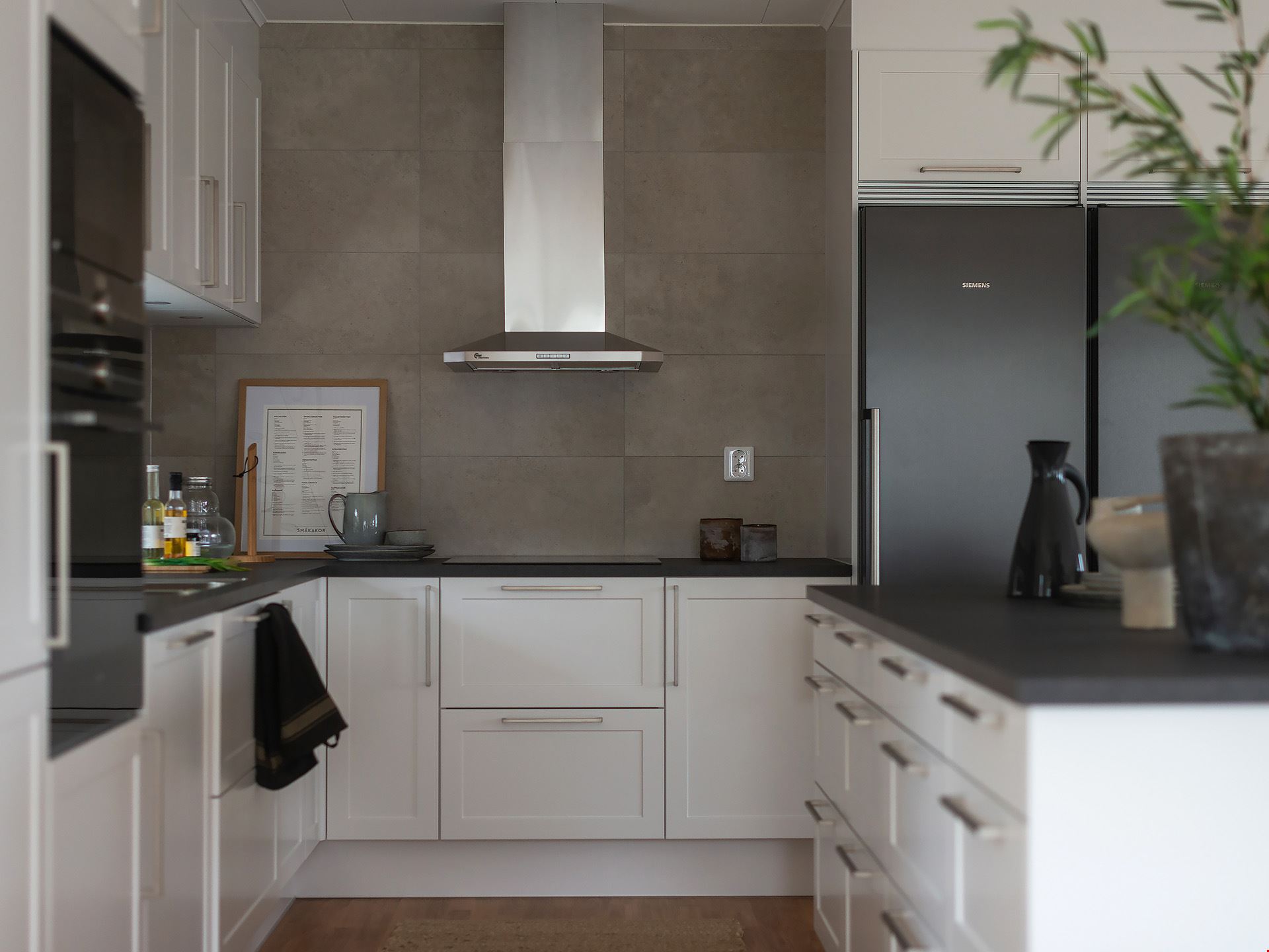 När vi tar trappan upp till det övre våningsplanet så kommer du till husets hjärta. Här är kök och vardagsrum placerade i ett öppet stråk för att ta vara på utsikten. Ljusinsläppet här inne är fantastiskt tack vare fönster i tre olika väderstreck. I vardagsrummet står en härlig braskamin som höjer mysfaktorn. Från vardagsrummet tar du dig också ut till den stora balkongen. Köket kommer från HTH och har en klassisk, tidlös stil med svarta vitvaror och köksö. (Klicka här för att se ritningarna på köket). På det här våningsplanet hittar du också husets master bedroom som bjuder på gott om förvaring, ett mindre sovrum och badrum. Badrummet är inrett med kakel och klinker, duschhörn, handdustork och svart kommod.