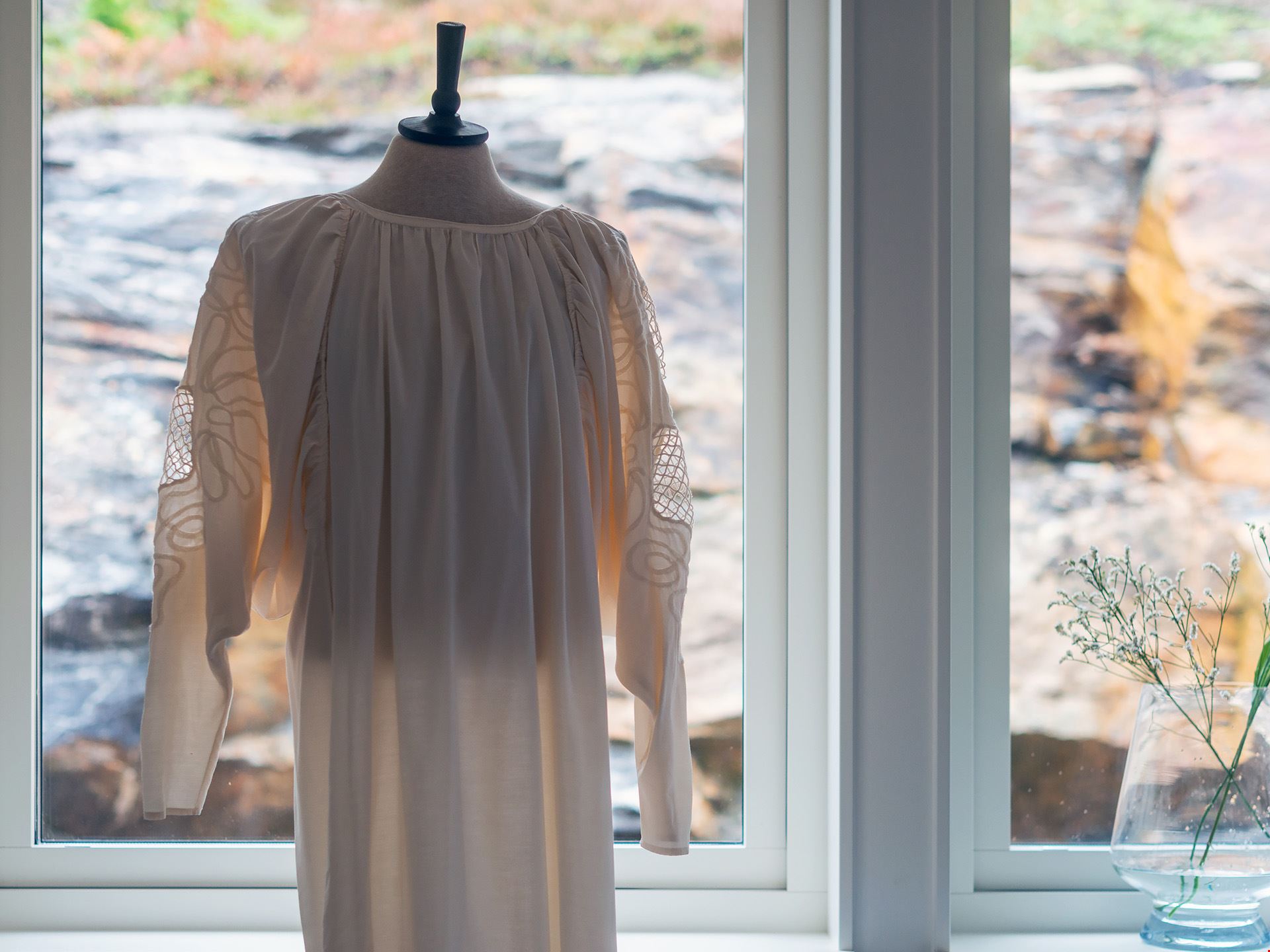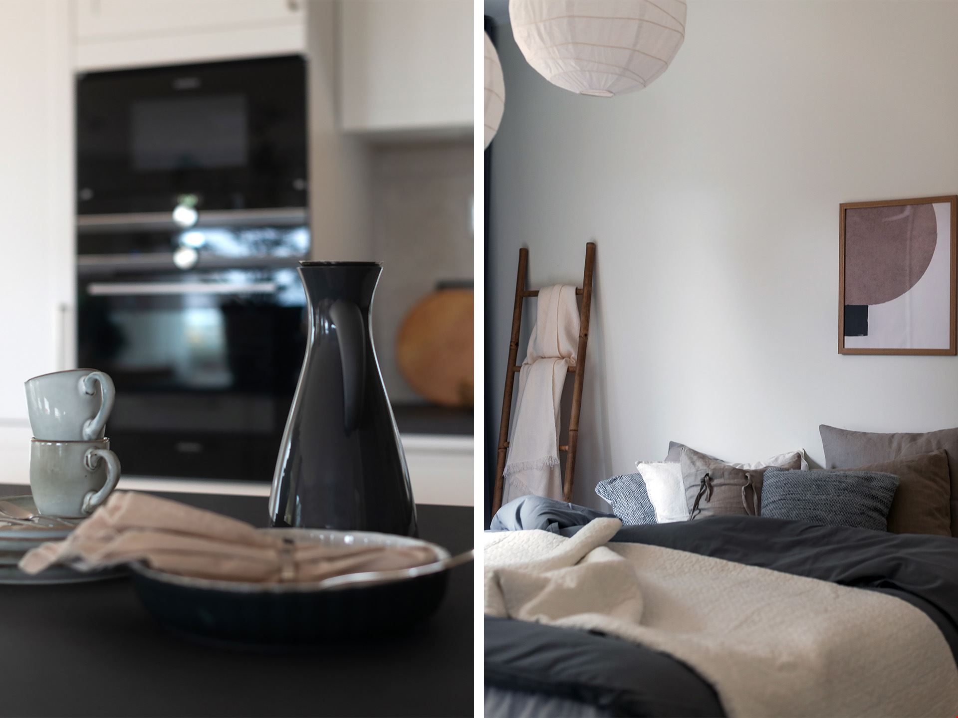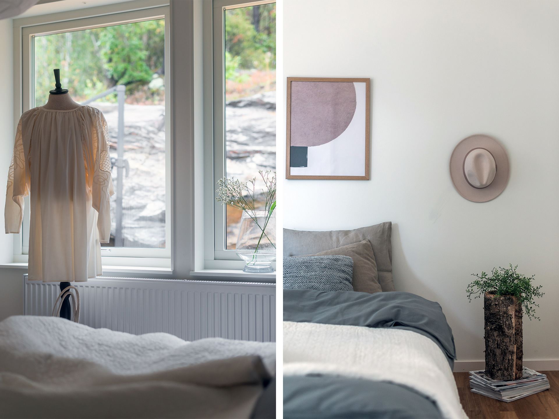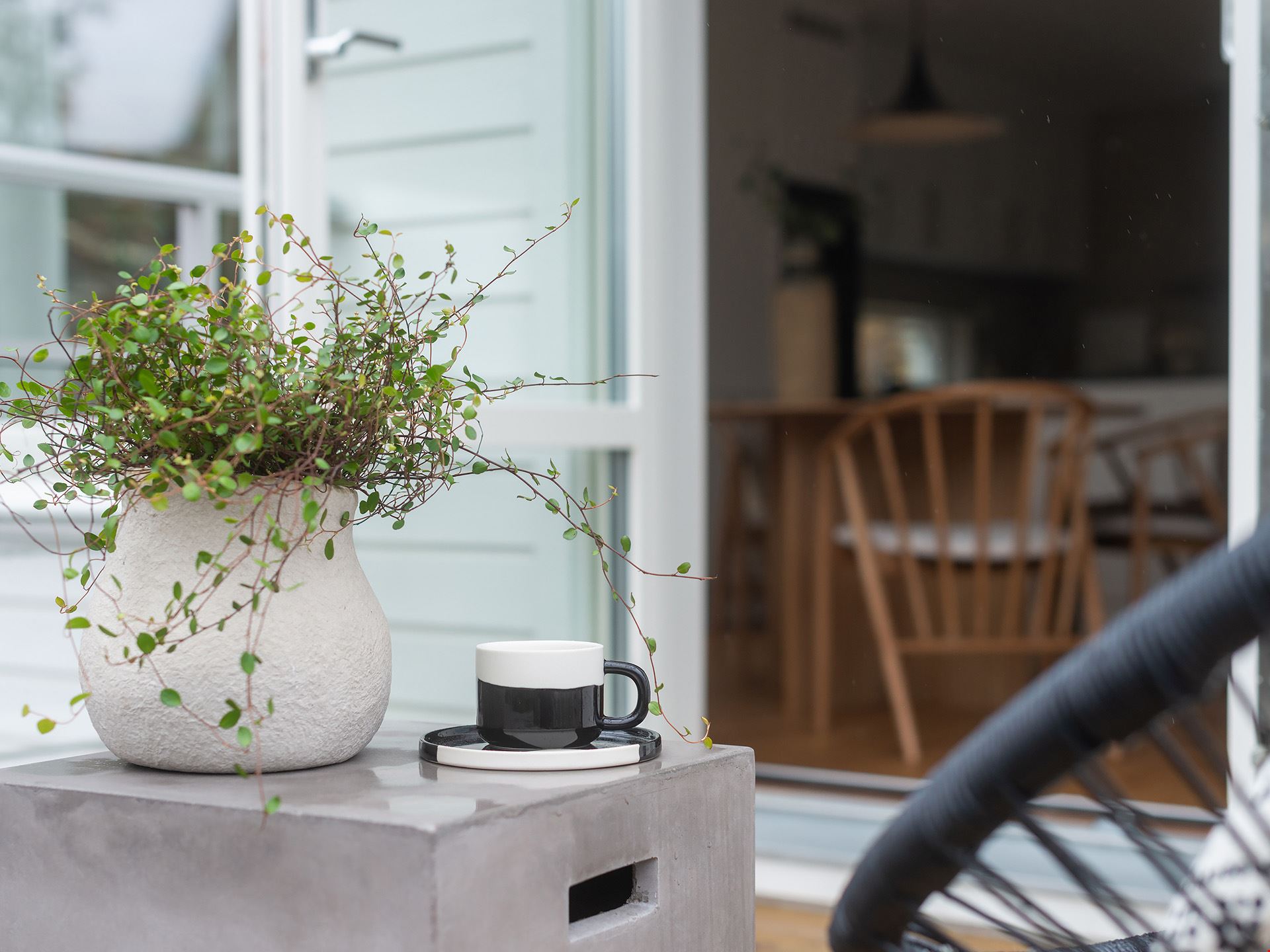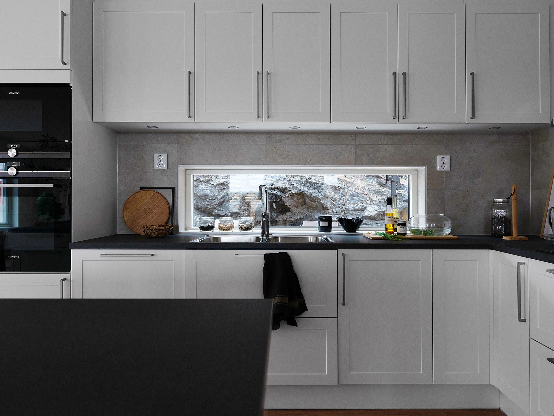 När vi tar trappan upp till det övre våningsplanet så kommer du till husets hjärta. Här är kök och vardagsrum placerade i ett öppet stråk för att ta vara på utsikten. Ljusinsläppet här inne är fantastiskt tack vare fönster i tre olika väderstreck. I vardagsrummet står en härlig braskamin som höjer mysfaktorn. Från vardagsrummet tar du dig också ut till den stora balkongen. Köket kommer från HTH och har en klassisk, tidlös stil med svarta vitvaror och köksö. (Klicka här för att se ritningarna på köket). På det här våningsplanet hittar du också husets master bedroom som bjuder på gott om förvaring, ett mindre sovrum och badrum. Badrummet är inrett med kakel och klinker, duschhörn, handdustork och svart kommod.