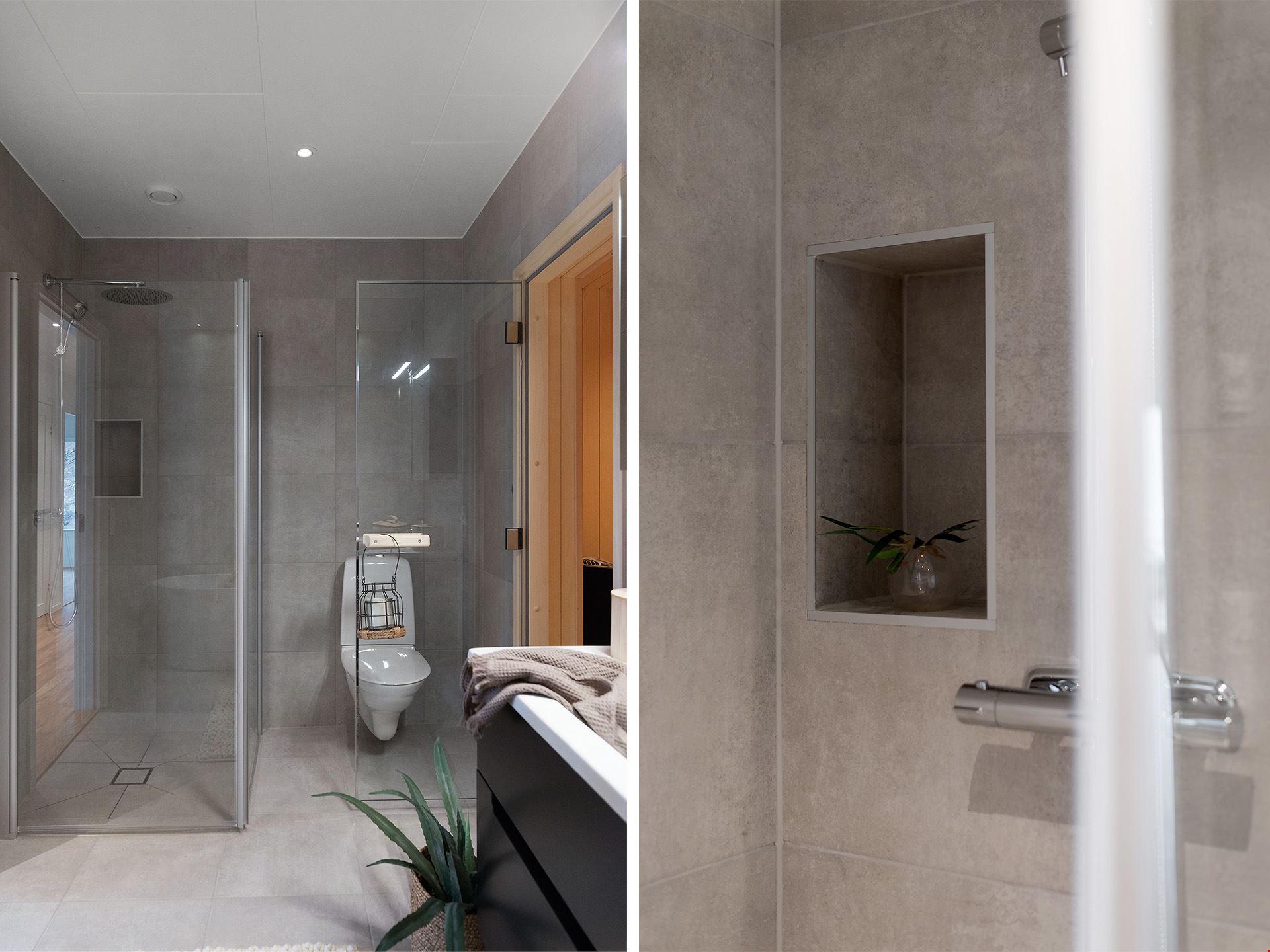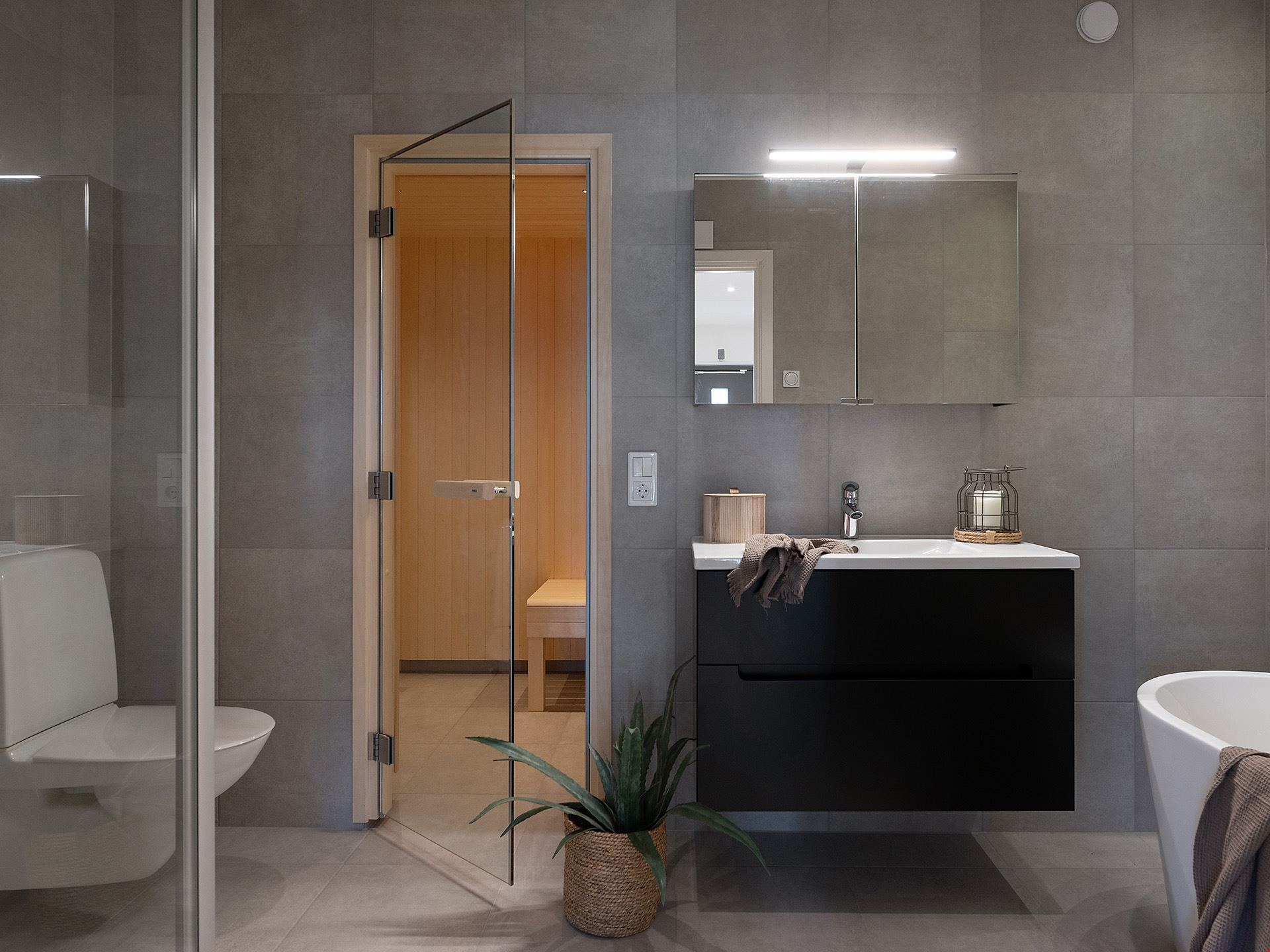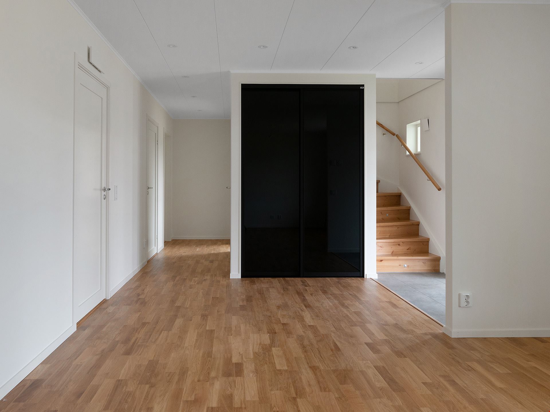 Välkommen in i denna nyproducerade villa som utgår från modellen Smart 149, men här med en anpassad planlösning. Huset har 6 rum och kök fördelat på 158 välplanerade kvadratmeter. Entrén finner du på det nedre våningsplanet. Här hittar du 2 av husets totalt 4 sovrum samt ett trevligt allrum. Här hittar du också en rymlig tvättstuga, klädkammare, ett badrum samt bastu. Badrummet är inrett med kakel och klinker, duschhörn samt svart kommod.