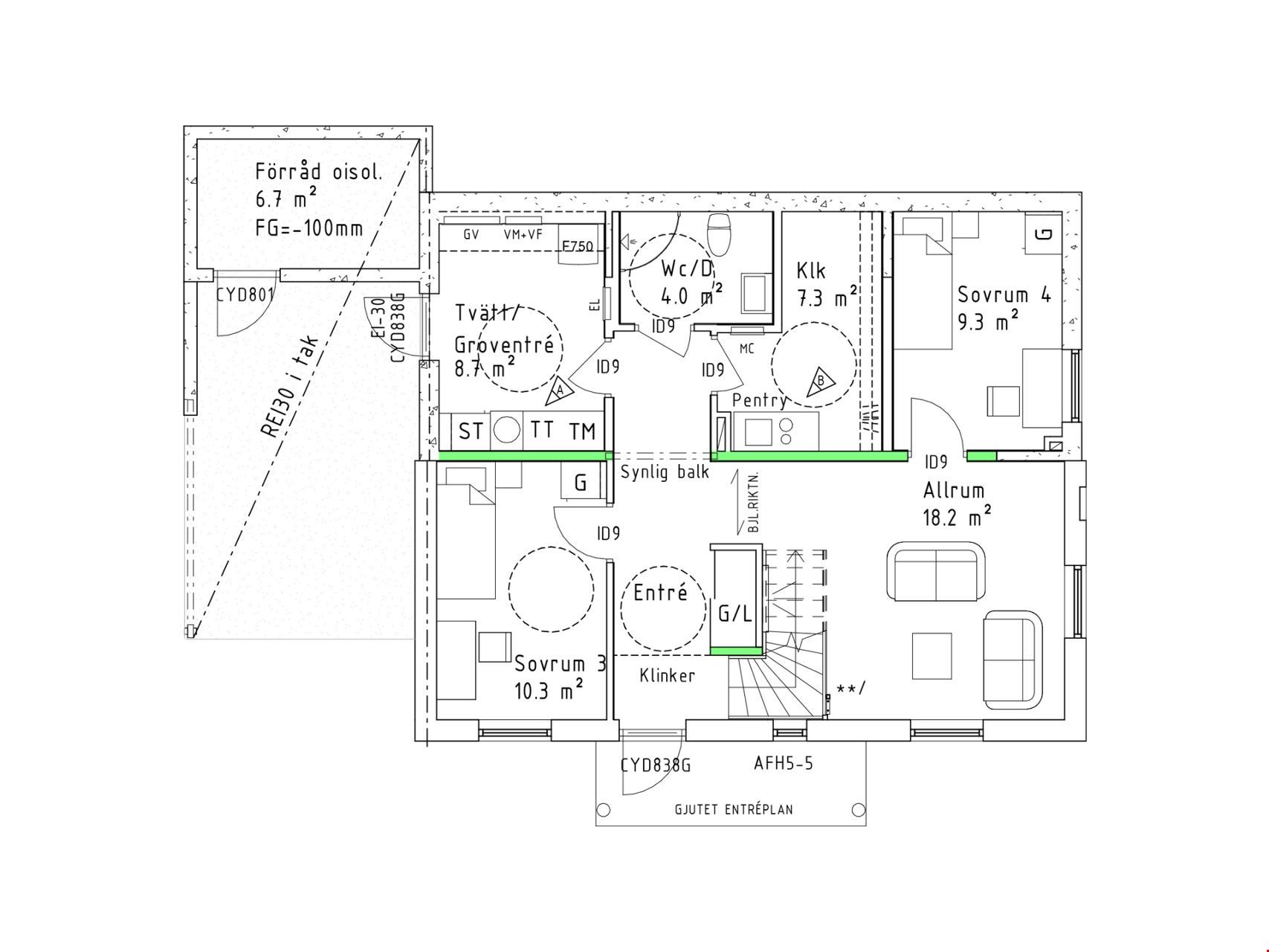 Entrén finns på det nedre våningsplanet. Här hittar du 2 av husets totalt 4 sovrum. Entrévåning är den perfekta ungdomsavdelning då det finns både ett pentry och ett mindre allrum. Här hittar du också en rymlig tvättstuga, klädkammare och ett litet badrum. Badrummet är inrett med kakel och klinker, duschhörn samt skogsgrön kommod.
