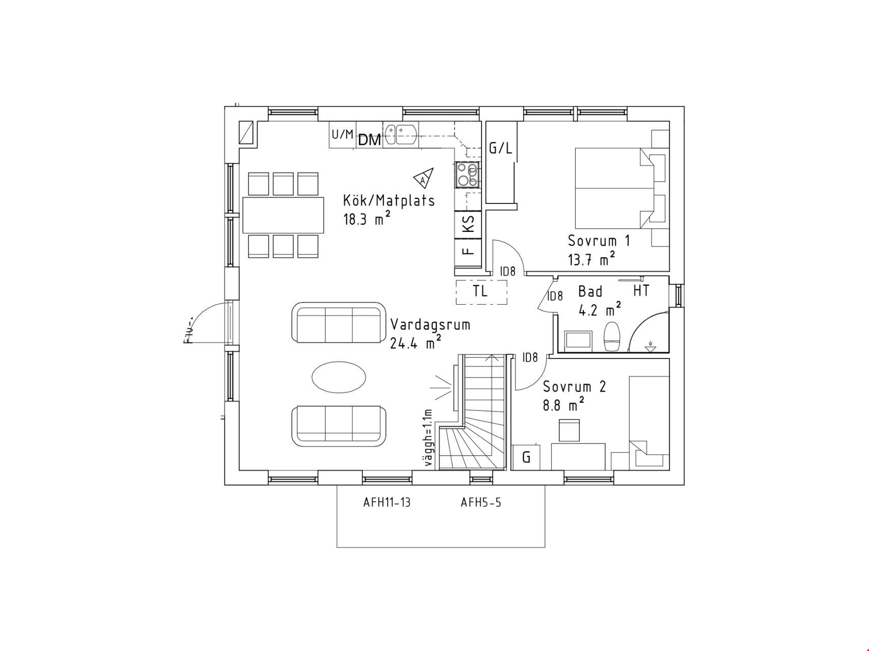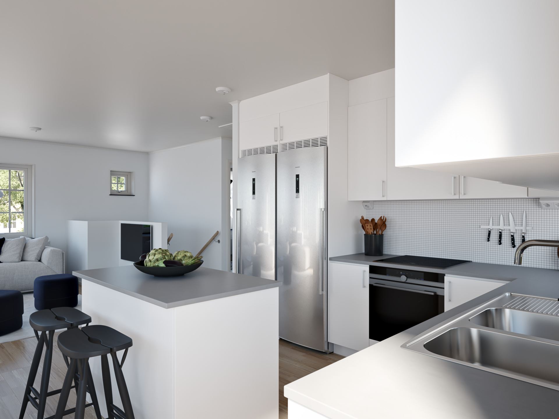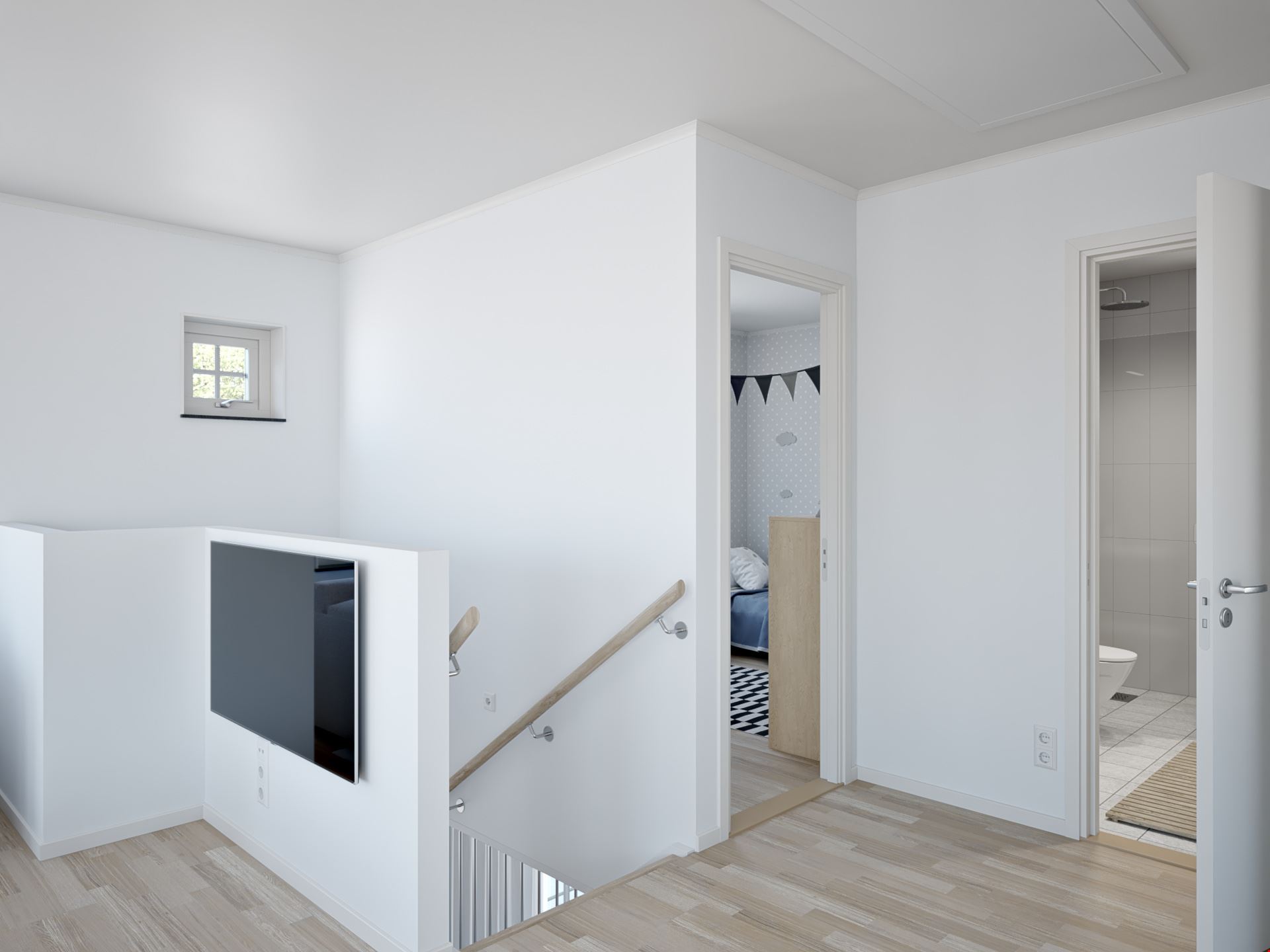 När vi tar trappan upp till det övre våningsplanet så kommer du till husets hjärta. Här är kök och vardagsrum placerade i ett öppet stråk för att ta vara på utsikten. Ljusinsläppet här inne är fantastiskt tack vare fönster i tre olika väderstreck. Från vardagsrummet tar du dig ut på den stora balkongen. Köket kommer från HTH och har en klassisk, tidlös stil med rostfria vitvaror. (Klicka här för att se ritningarna på köket). På det här våningsplanet hittar du också husets master bedroom som bjuder på gott om förvaring, ett mindre sovrum och badrum. Badrummet är inrett med kakel och klinker, duschhörn, takdusch och betonggrå kommod.