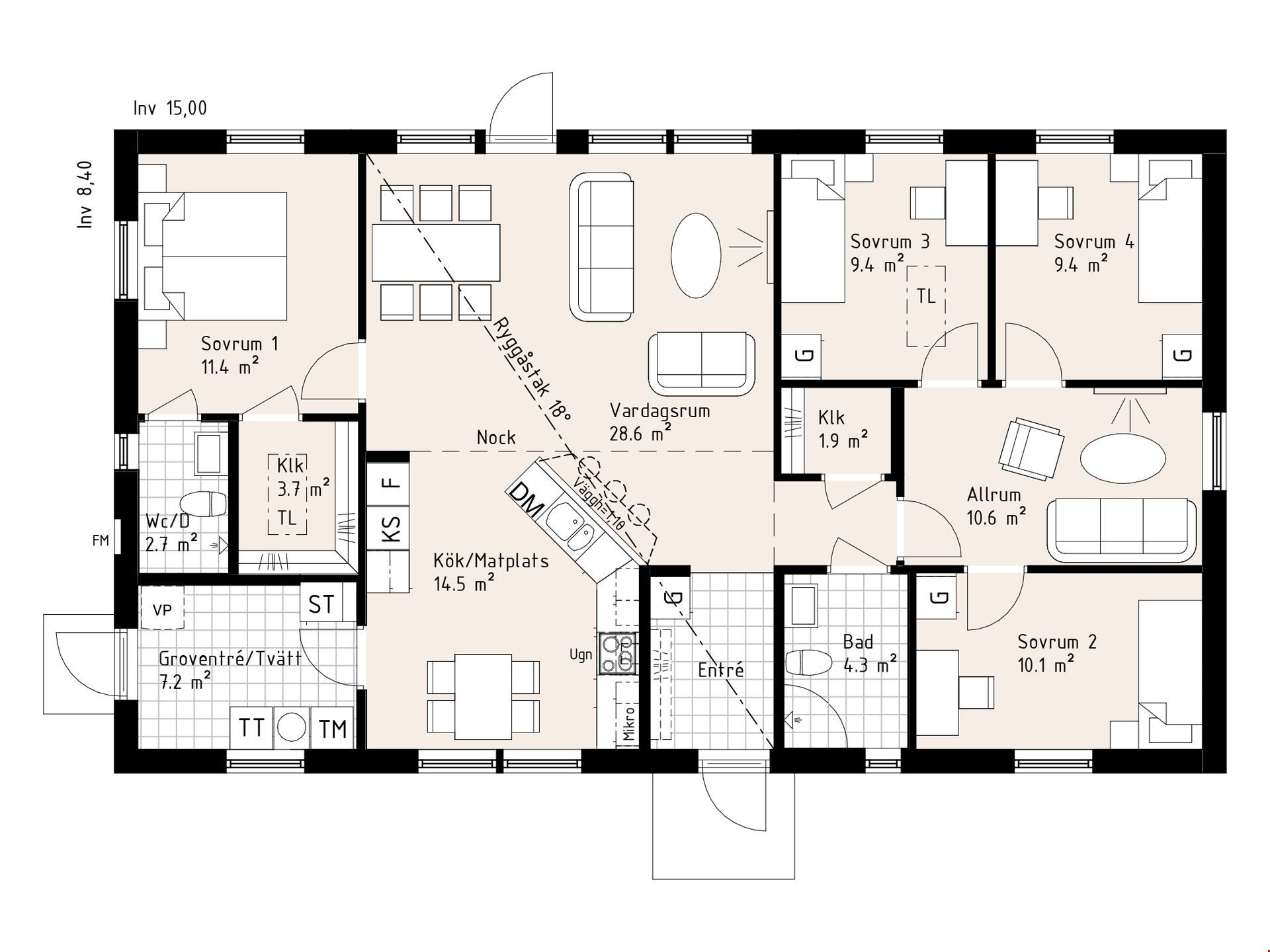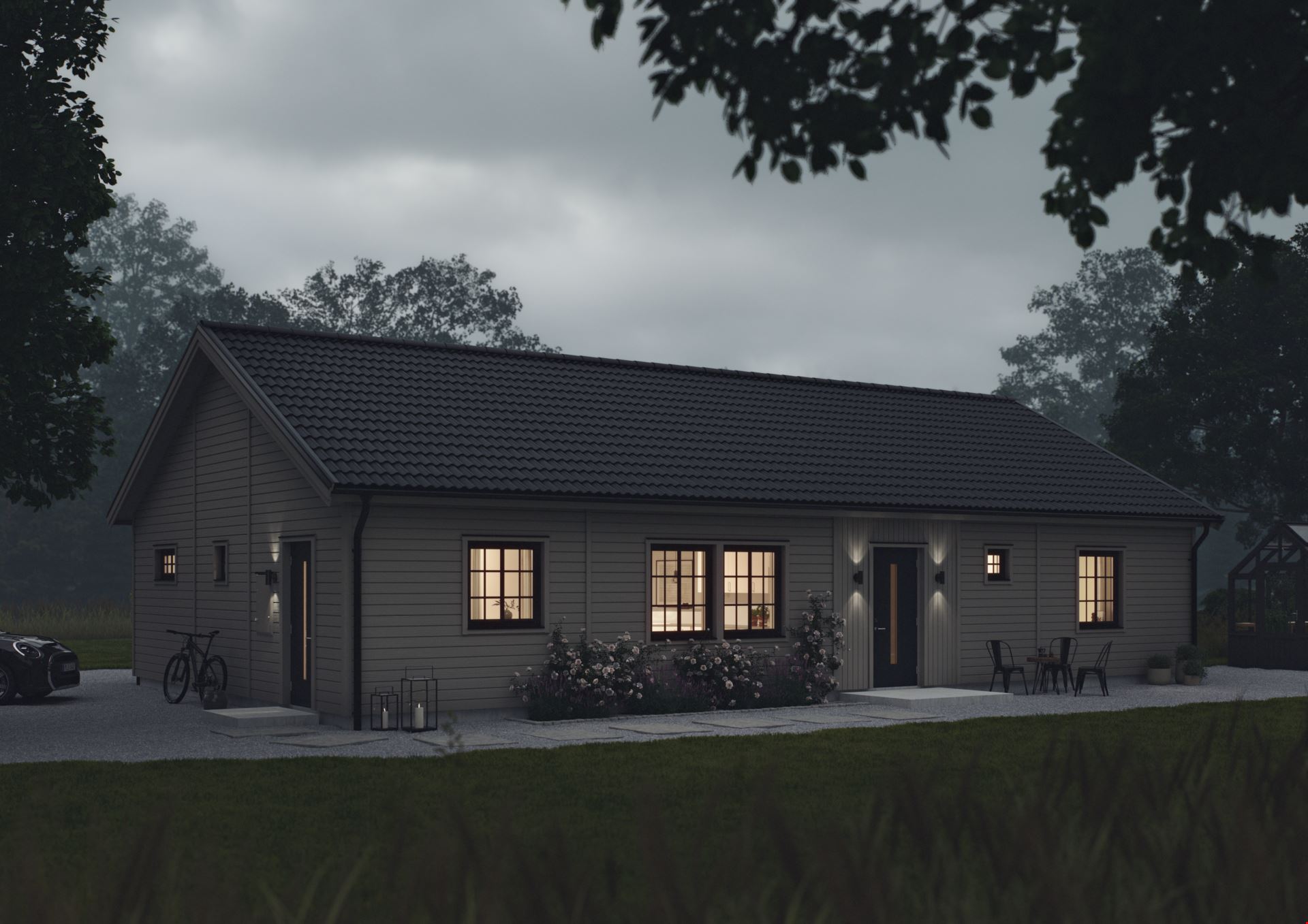På den här tomten rekommenderar vi en av våra mest sålda husmodeller Smart 126. Det här enplanshuset består av 6 rum och kök fördelat på 126 kvadratmeter. Planlösningen präglas av en stor och öppen umgängesdel i husets mitt som ger kontakt med entrésidan och trädgården. Vardagsrummets fönster når nästan golvet och ger ett större ljusinsläpp. Barnens avdelning ligger avskild men ändå nära badrummet och entrén. Föräldrasovrummet ligger i husets andra ända med tillgång till en egen toalett.