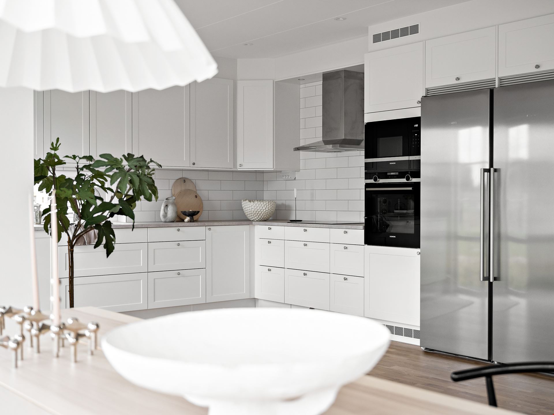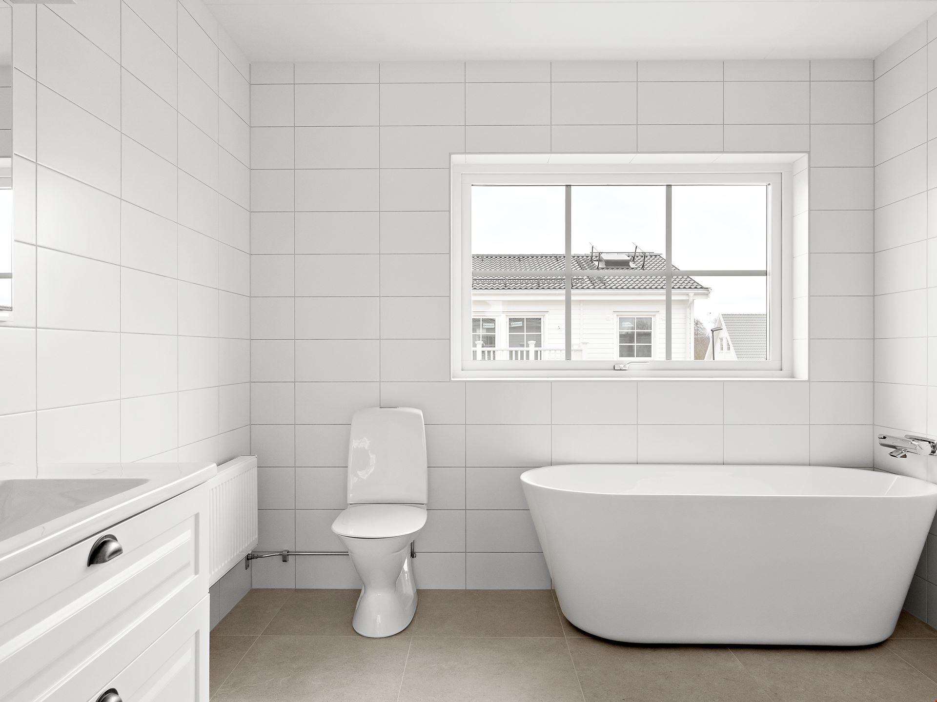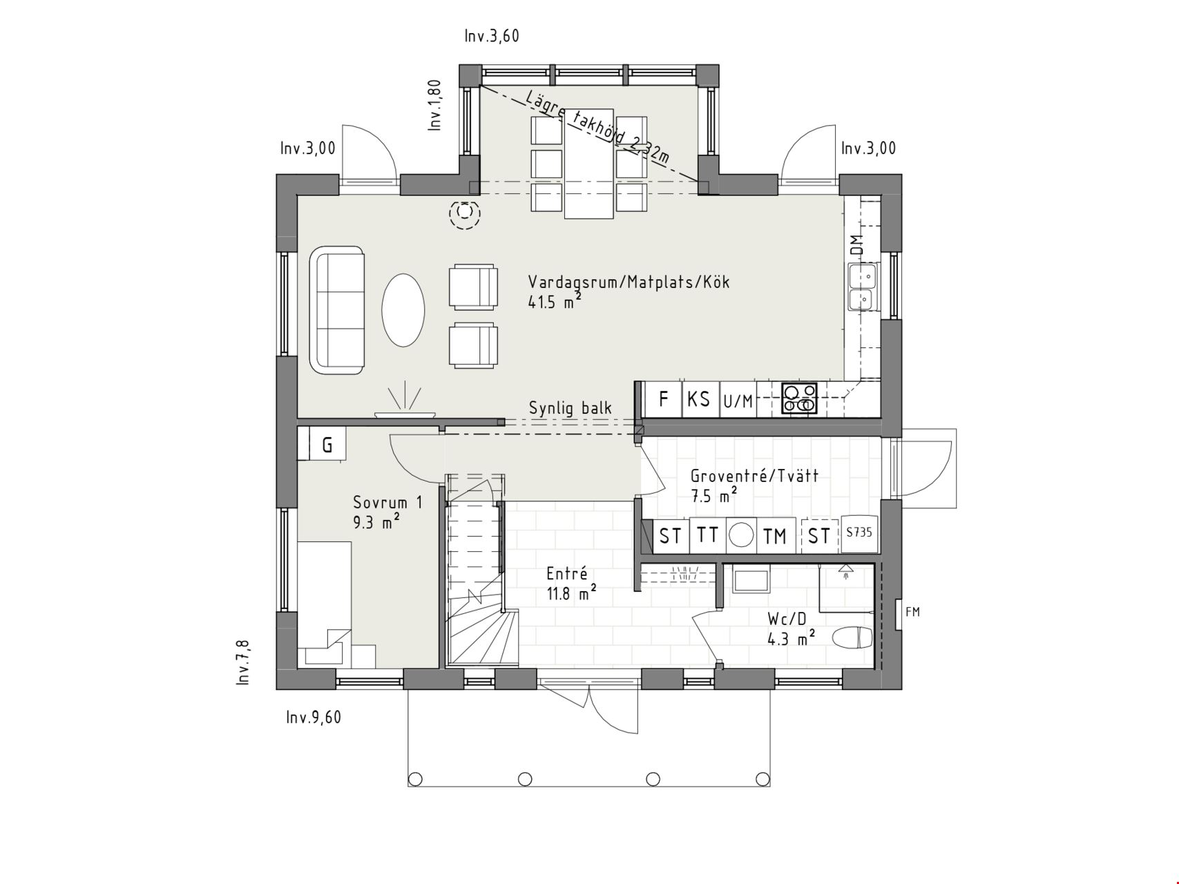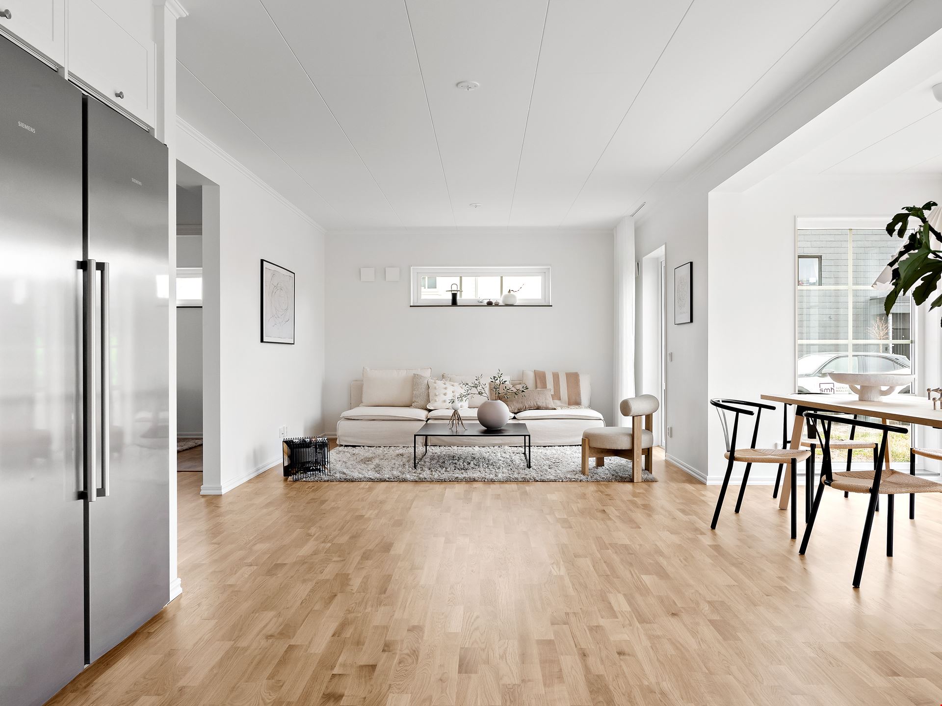 När du kliver in i det här huset möts du av en rymlig entré med tvättstuga och badrum direkt till höger. Badrummet är inrett med duschhörn med takdusch, kommod och spegelskåp. Fortsätter du in i huset kommer du till den stora samvaroytan– med plats för både matplats, soffgrupp och mer därtill. Här kan du samla hela familjen under årets alla högtider och alla får plats.