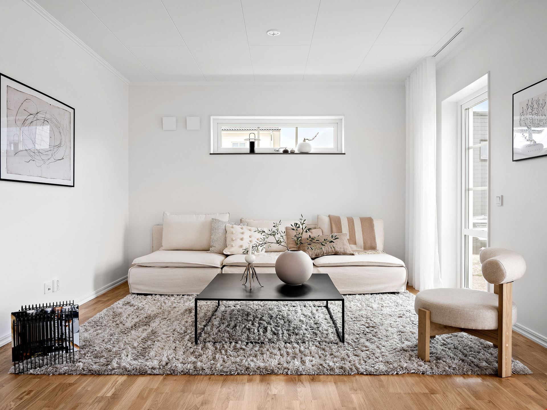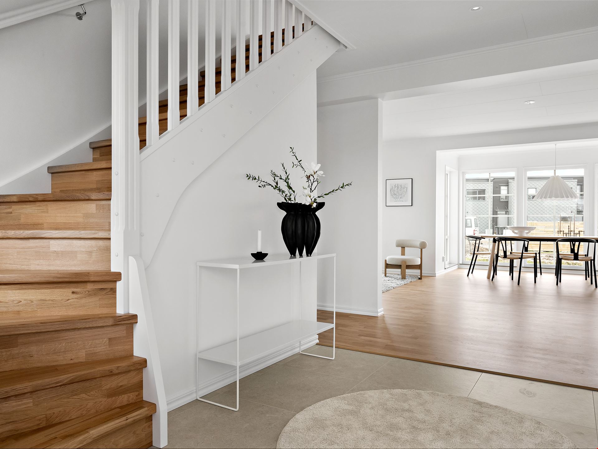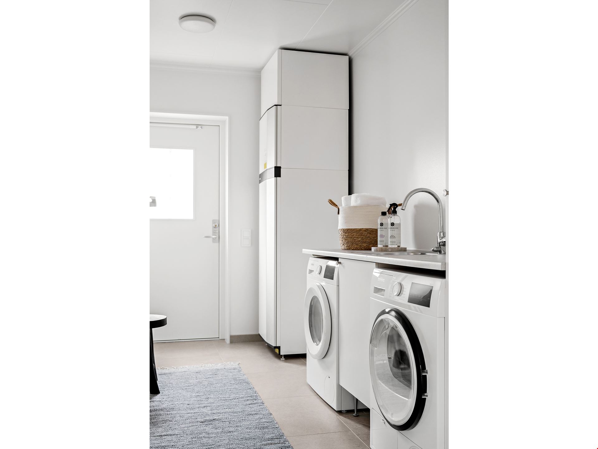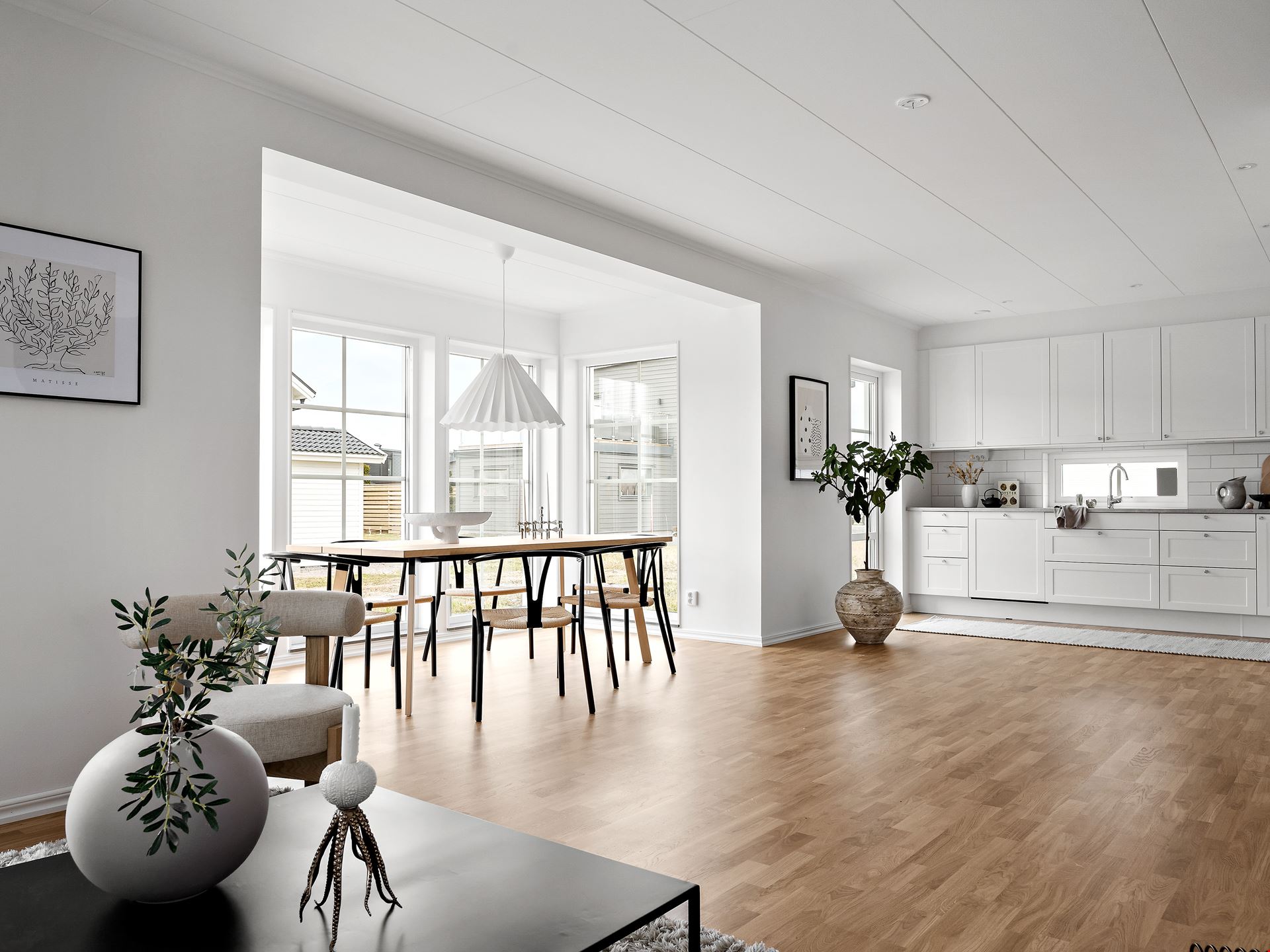 När du kliver in i det här huset möts du av en rymlig entré med tvättstuga och badrum direkt till höger. Badrummet är inrett med duschhörn med takdusch, kommod och spegelskåp. Fortsätter du in i huset kommer du till den stora samvaroytan– med plats för både matplats, soffgrupp och mer därtill. Här kan du samla hela familjen under årets alla högtider och alla får plats.