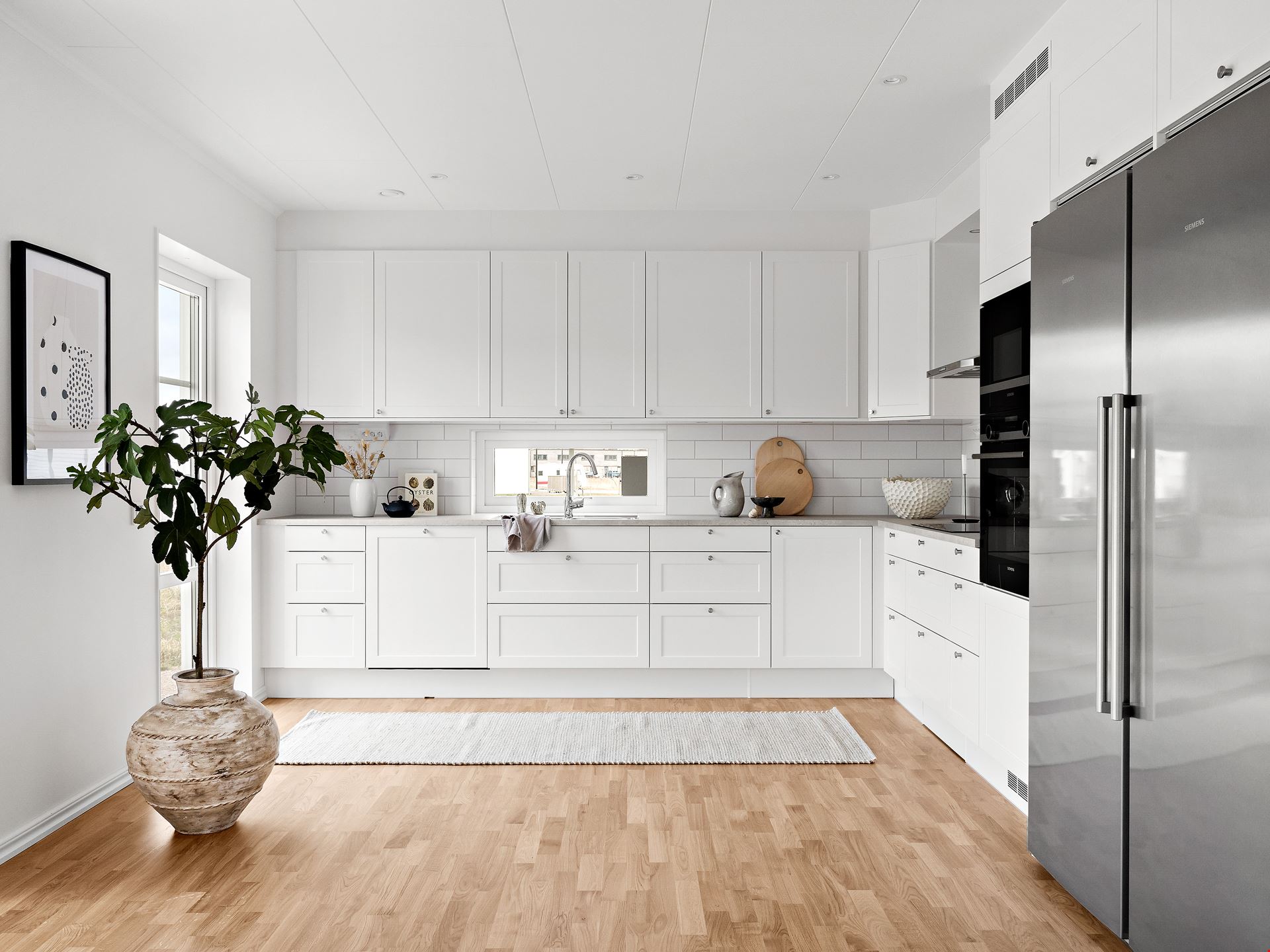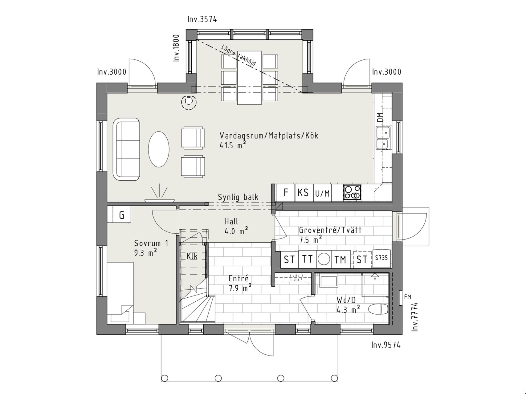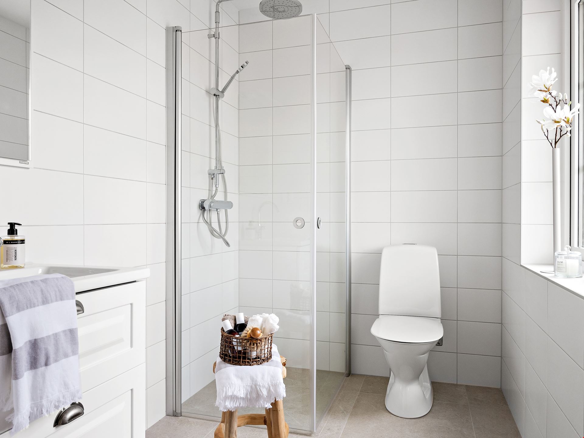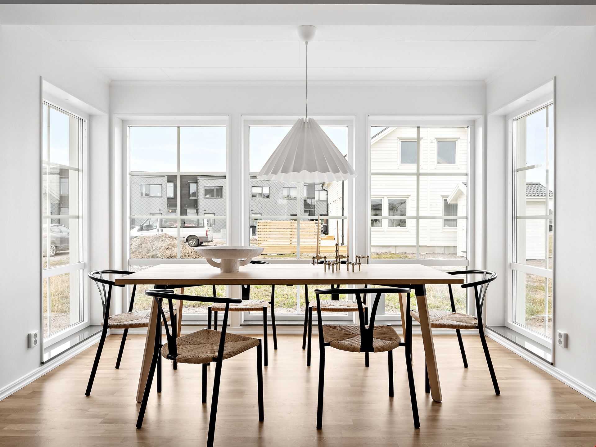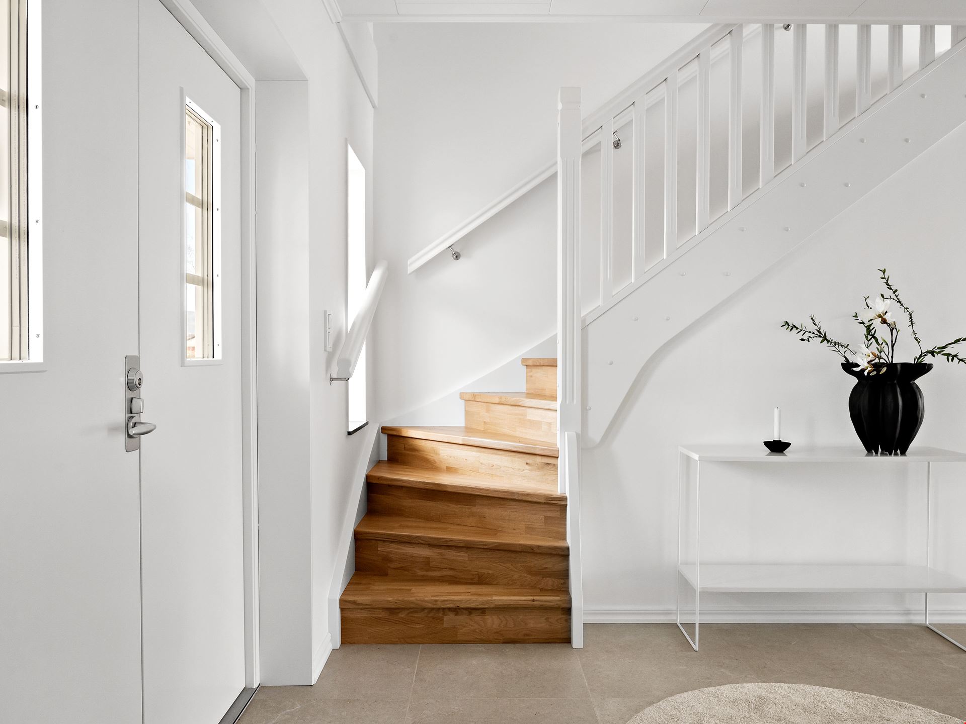När du kliver in i det här huset möts du av en rymlig entré med tvättstuga och badrum direkt till höger. Badrummet är inrett med duschhörn med takdusch, kommod och spegelskåp. Fortsätter du in i huset kommer du till den stora samvaroytan– med plats för både matplats, soffgrupp och mer därtill. Här kan du samla hela familjen under årets alla högtider och alla får plats.