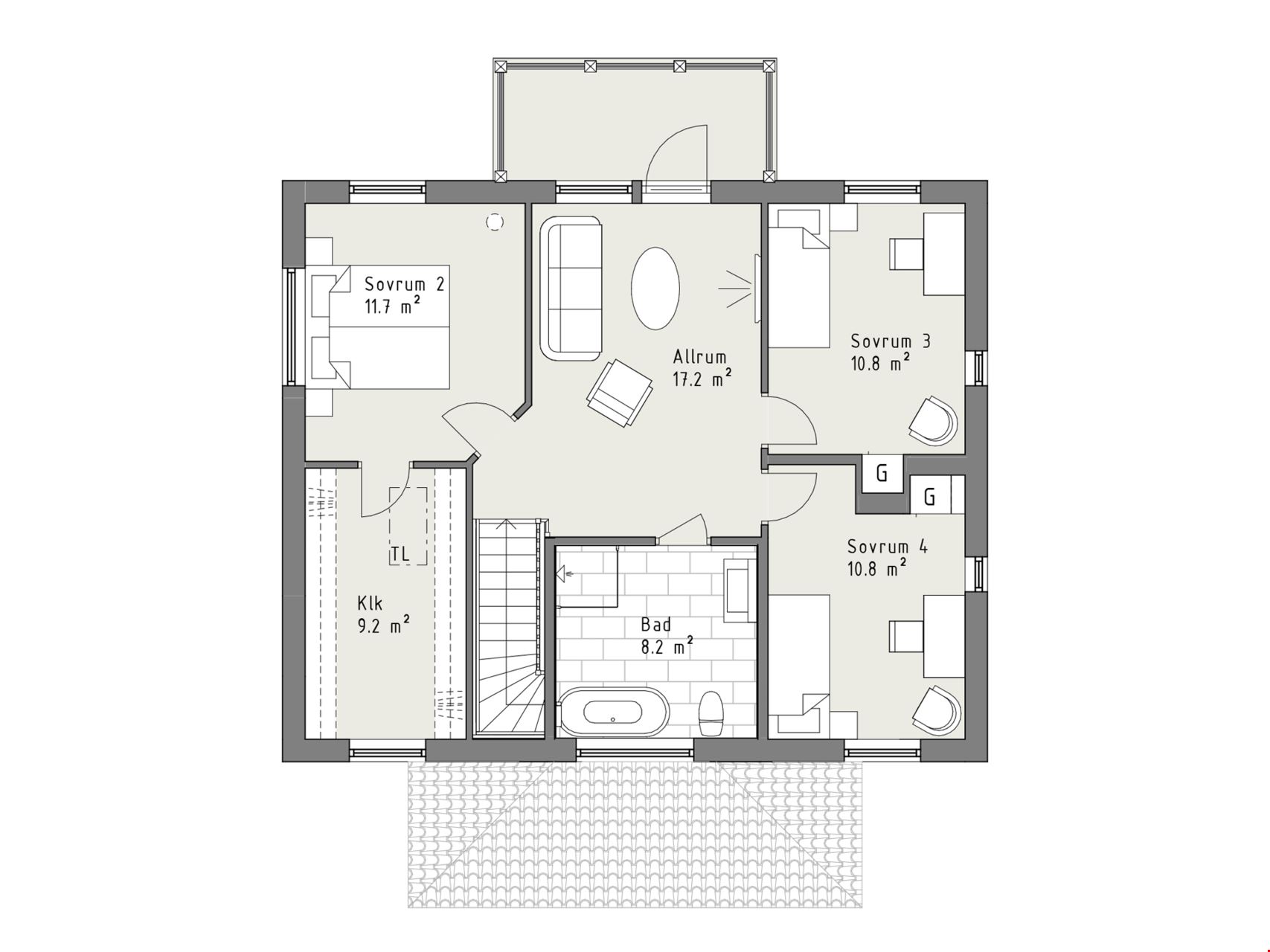 På husets övervåning finner du gott om plats för familjens privata liv i tre trivsamma sovrum. Ett av sovrummen är lite större än de andra och bjuder på gott om förvaring med en stor intilliggande klädkammare. Här finns även ett trevligt allrum och ett större badrum som är inrett med både dusch och badkar.