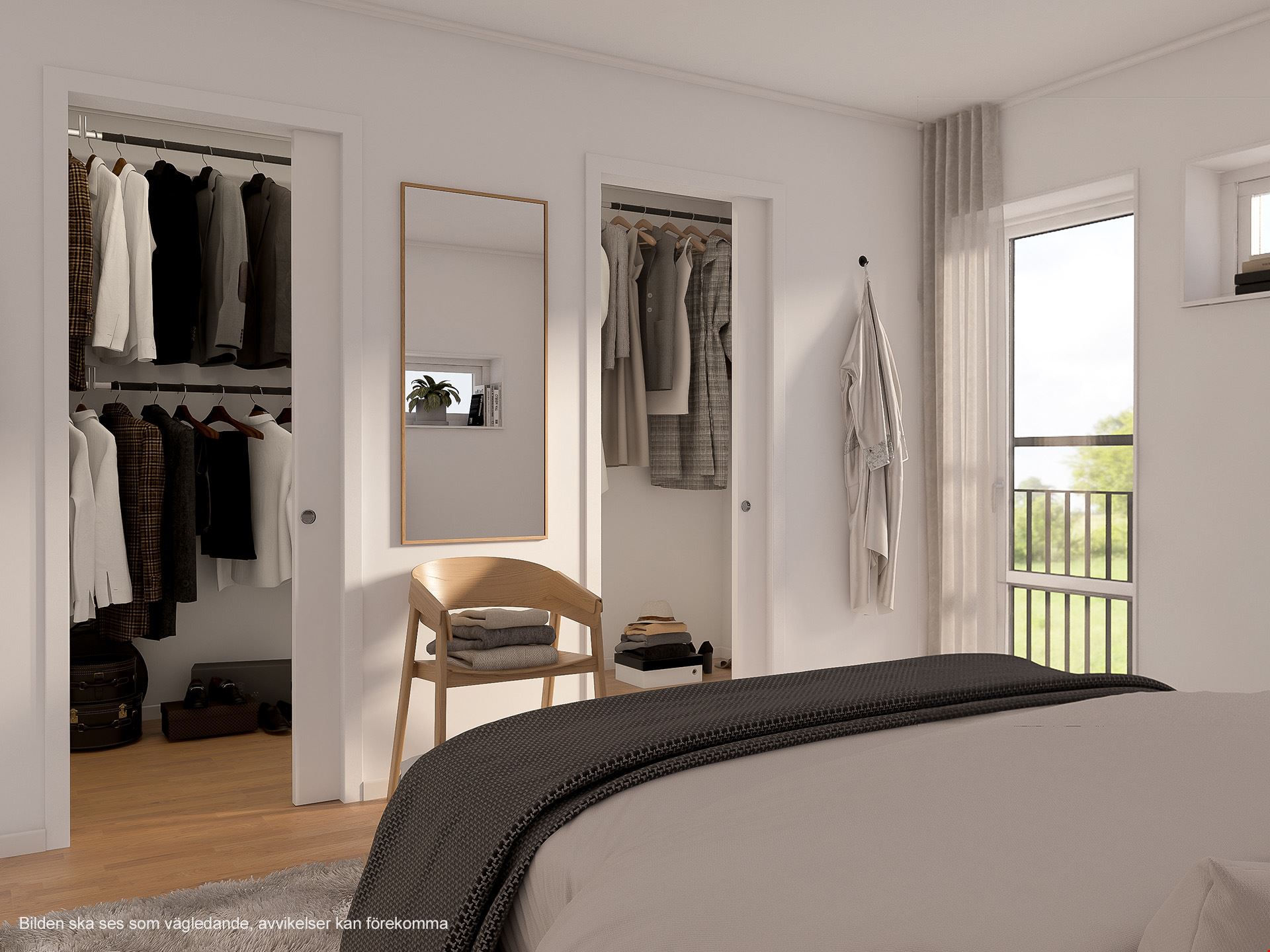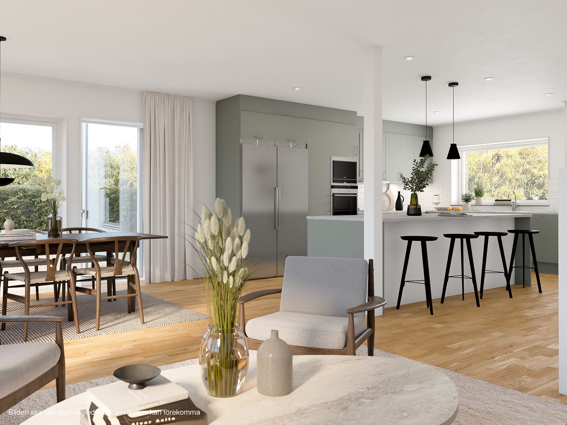 Här kan du flytta in i ett ljust och rymligt hus inspirerat av vår husfavorit Källviken, men anpassat efter just den här platsen. Redan i entrén möts du av en öppen siktlinje mot vardagsrummet, här ligger också husets tvättstuga praktiskt placerad. Hela huset pryds av generösa fönsterpartier som skapar en härlig känsla av ljus och rymd. Kök, matplats och vardagsrum ligger i direkt anslutning till varandra och erbjuder utsikt mot både gatan och trädgården. En trappa upp hittar du husets tre sovrum, badrum och ett generöst allrum.