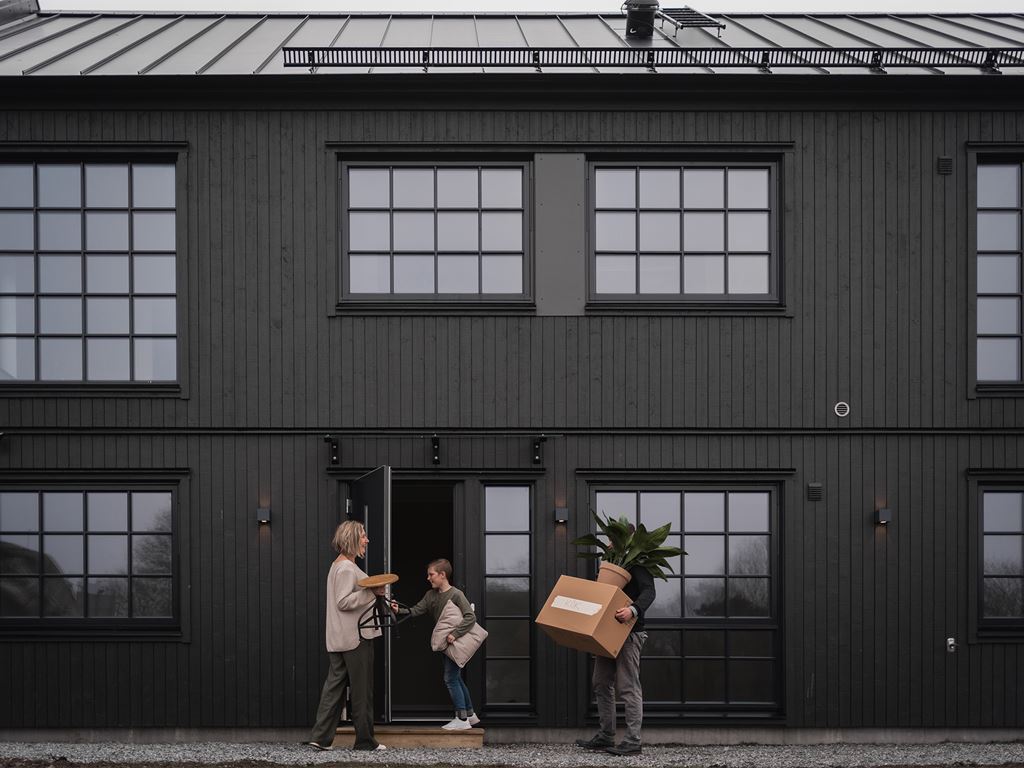 Det här huset har en tydlig industriell karaktär med sina svarta spröjs, stående panel och generösa fönsterpartier som släpper in massor av ljus. Inne möts du av en öppen och inbjudande planlösning där vardagsrum, kök och matplats smälter samman till en naturlig samlingspunkt.