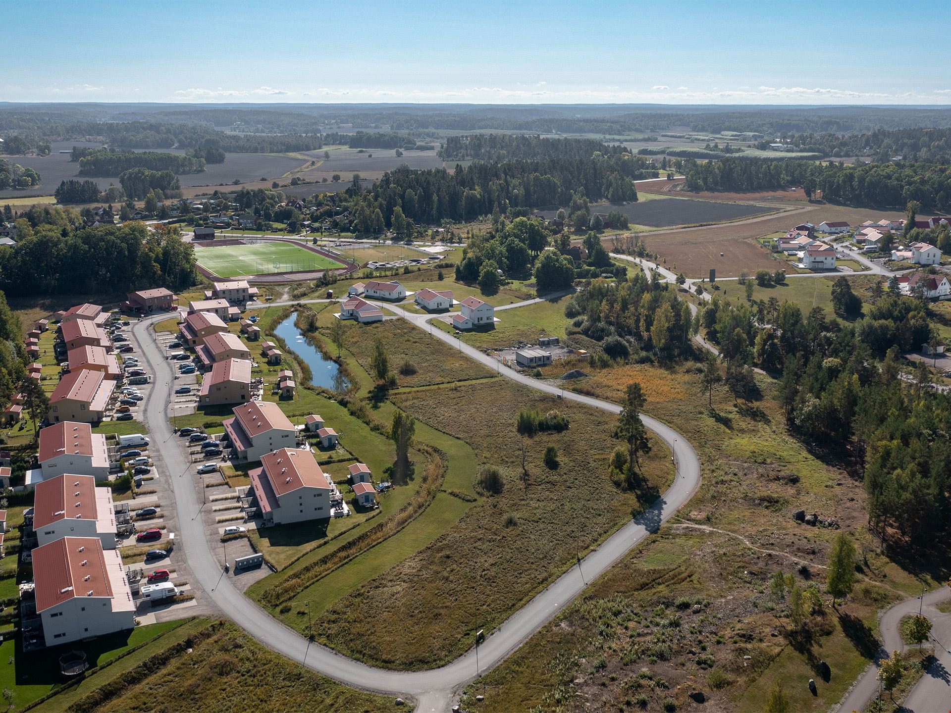 I tomtpriset tillkommer anslutningsavgifter för el, kommunalt VA och fiber samt avgift till samfällighetsförening.