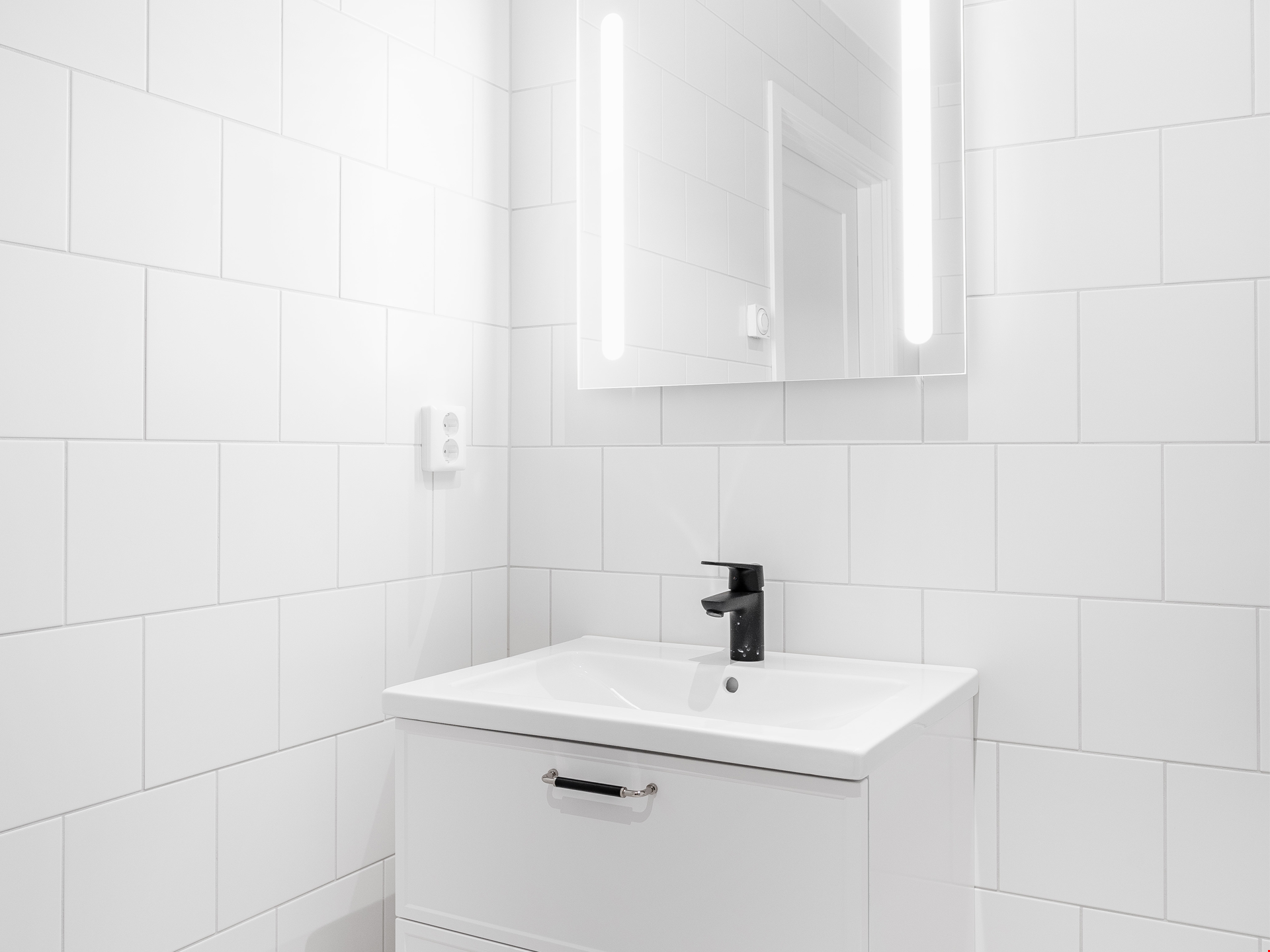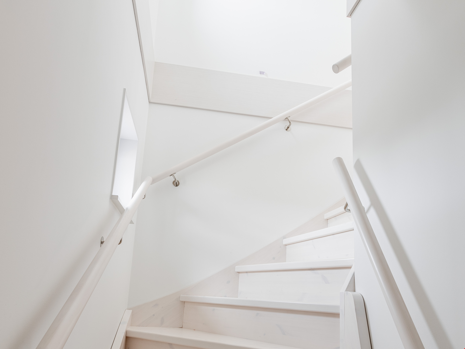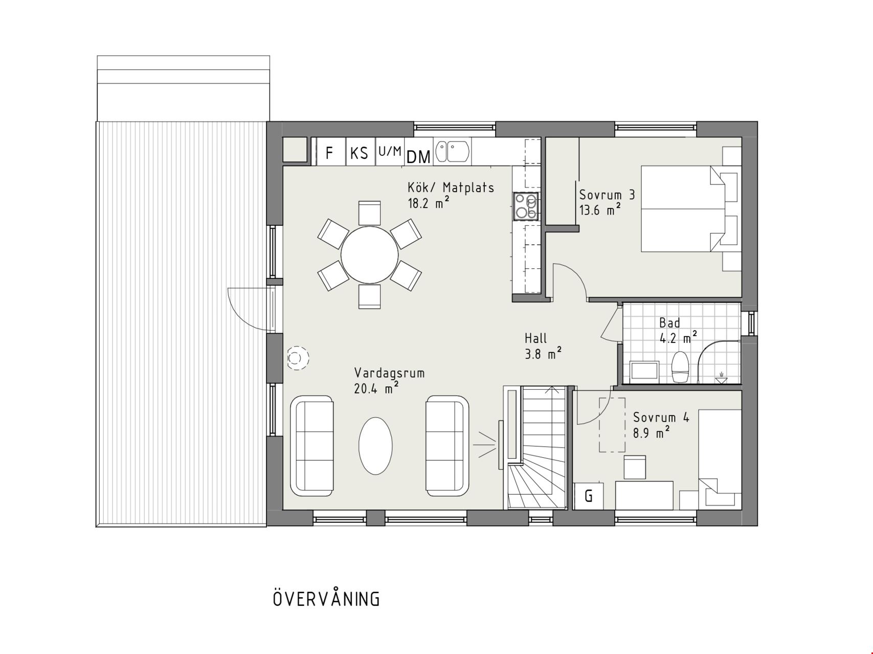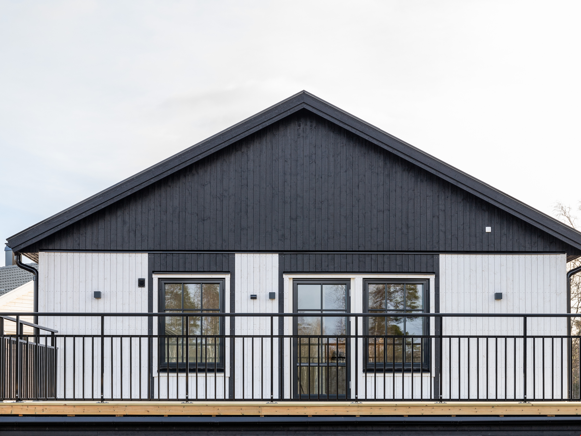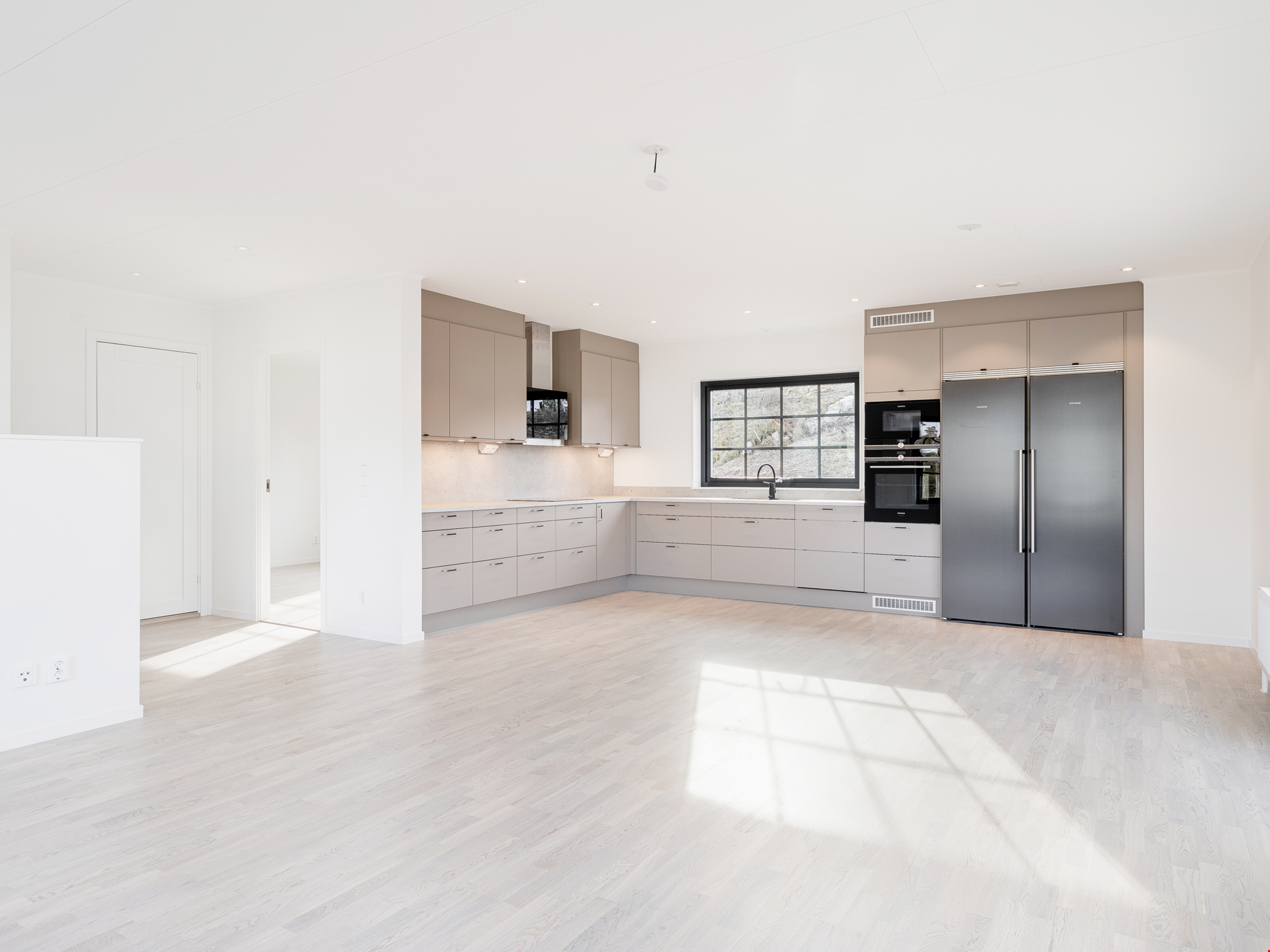 När vi tar trappan upp till det övre våningsplanet så kommer du till husets hjärta. Här är kök och vardagsrum placerade i ett öppet stråk för att ta vara på utsikten. Ljusinsläppet här inne är fantastiskt tack vare fönster i tre olika väderstreck. Från vardagsrummet tar du dig ut på den stora balkongen. Köket kommer från HTH och har en tidlös stil med vitvaror i Black Steel. Köksmodellen Stockholm i mockafärg gör att du får ett mysigt kök som tillför värme och hemtrevnad till din hemredning.