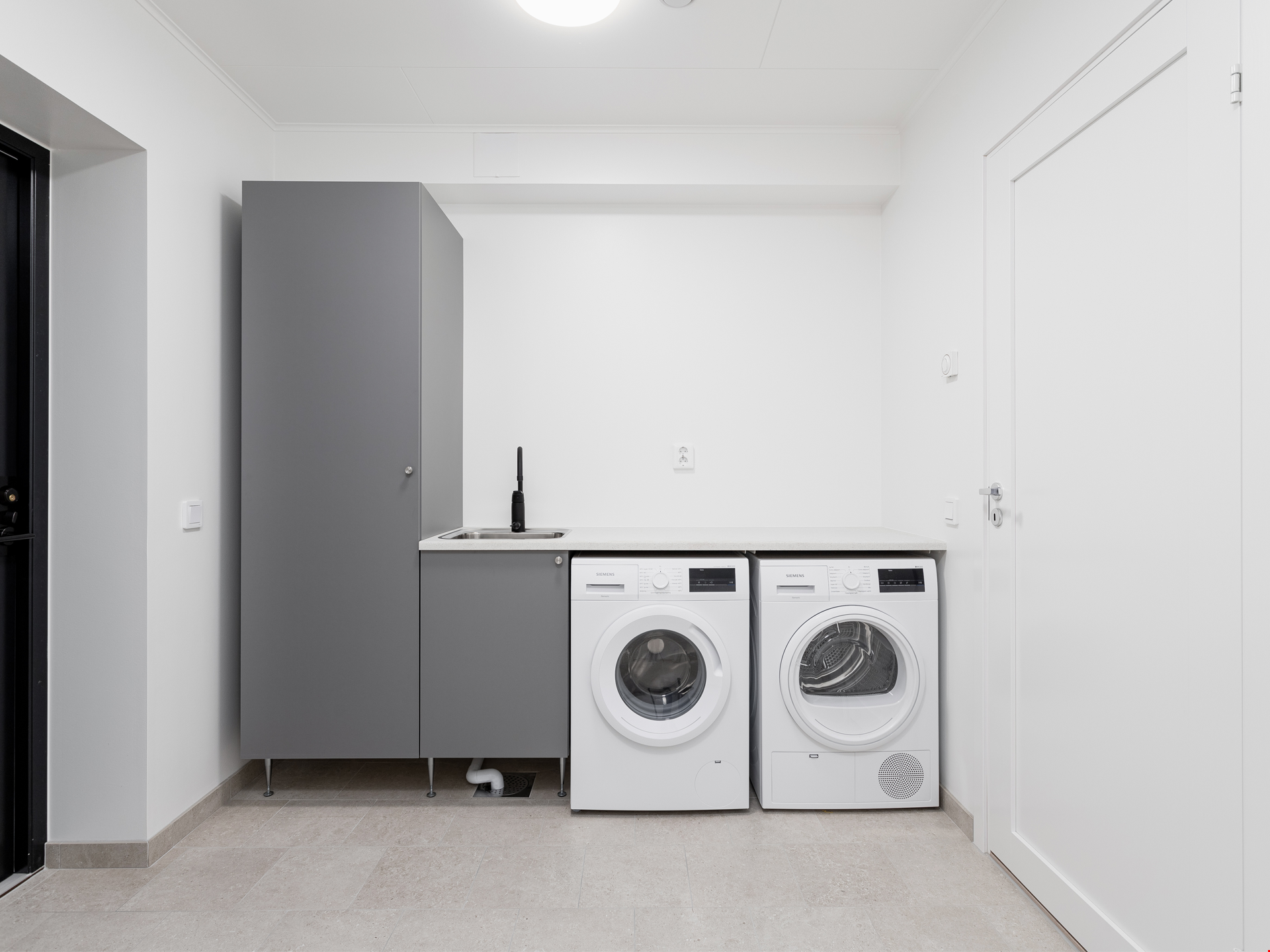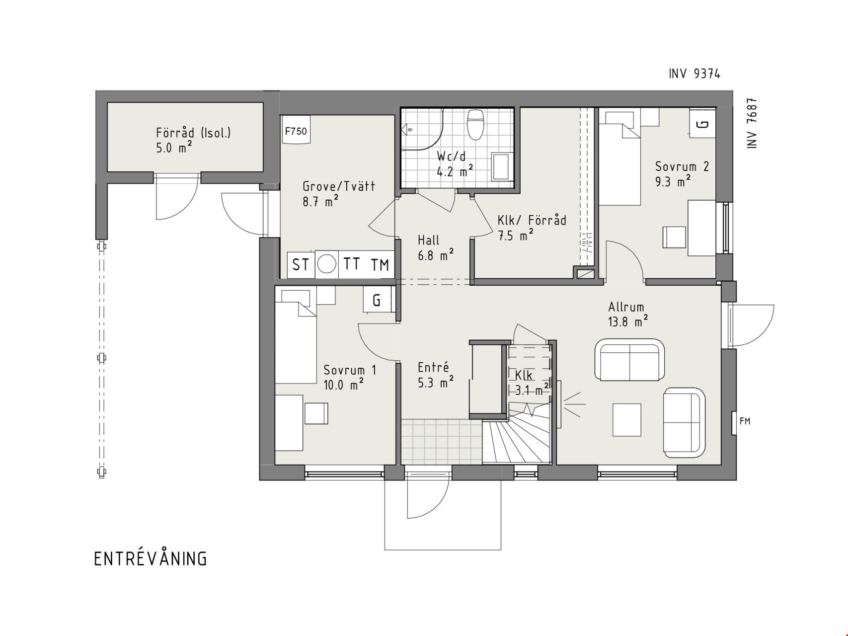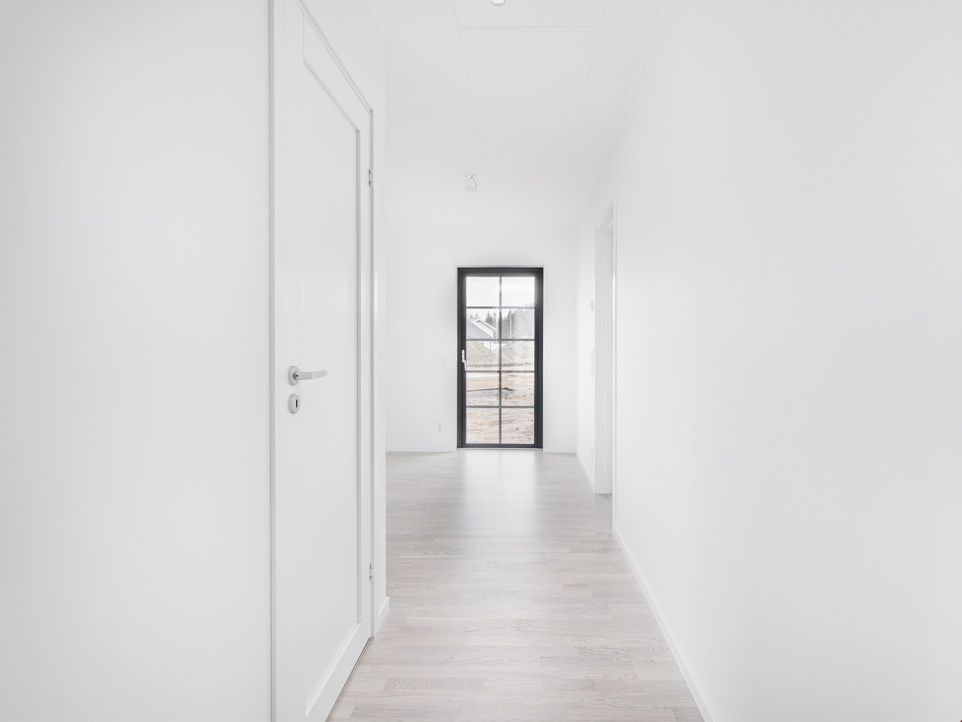 Välkommen in i denna nyproducerade villa om 147 kvm. Entrén finns på det nedre våningsplanet. Här hittar du 2 av husets totalt 4 sovrum. Entrévåning är den perfekta ungdomsavdelningen med ett allrum. Här hittar du också en rymlig tvättstuga, klädkammare/förråd och ett badrum. Badrummet är inrett med kakel och klinker, duschhörn och vit kommod från Vedum