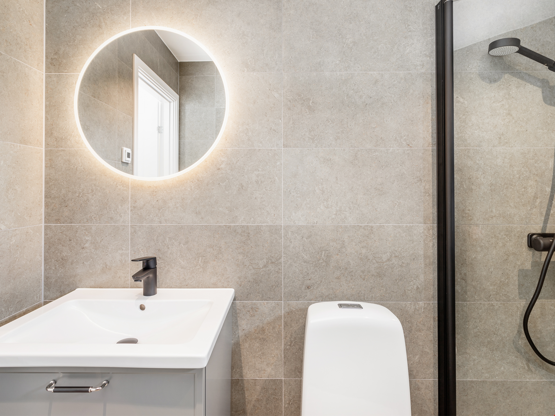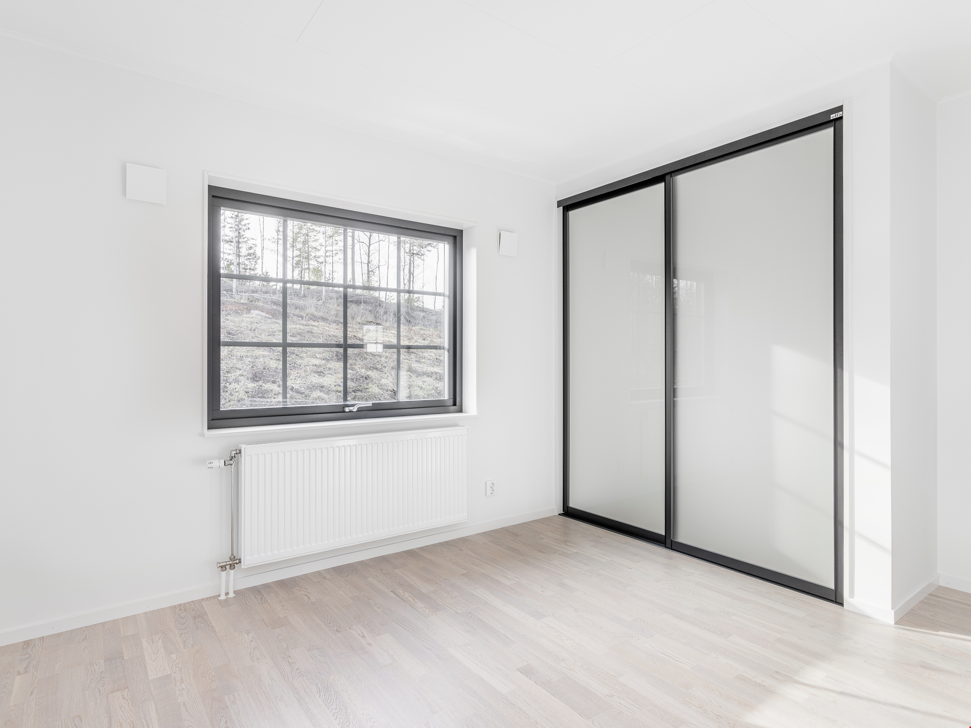 På det här våningsplanet hittar du också husets master bedroom som bjuder på gott om förvaring. I denna del av huset finns även ett mindre sovrum och badrum. Badrummet är inrett med kakel och klinker, duschväggar och en betonggrå kommod från Vedum. Till huset hör även en carport med ett förråd.