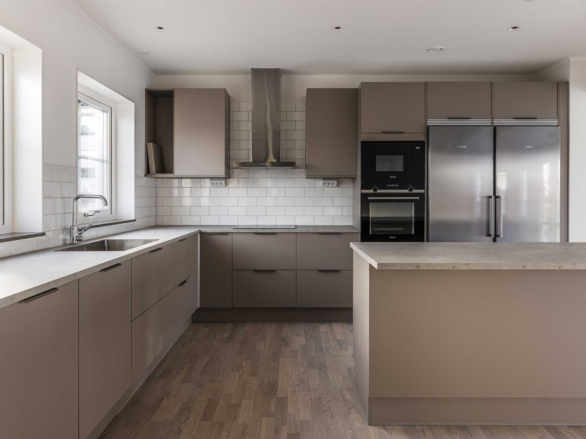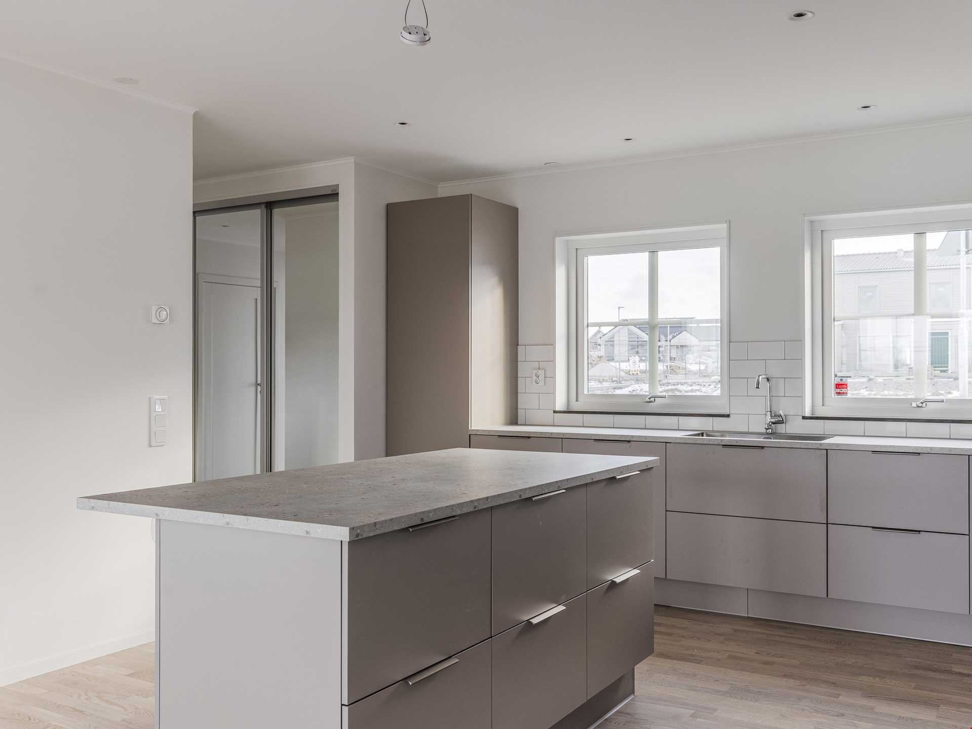 Smart 166 är ett luftigt tvåplanshus med generösa sociala ytor, fyra sovrum och många genomtänkta lösningar. Redan i entrén möts du av ljuset från husets stora fönsterpartier. Här ligger kök och vardagsrum i en öppen planlösning, där köket i vinkel skapar både arbetsro och rumskänsla.