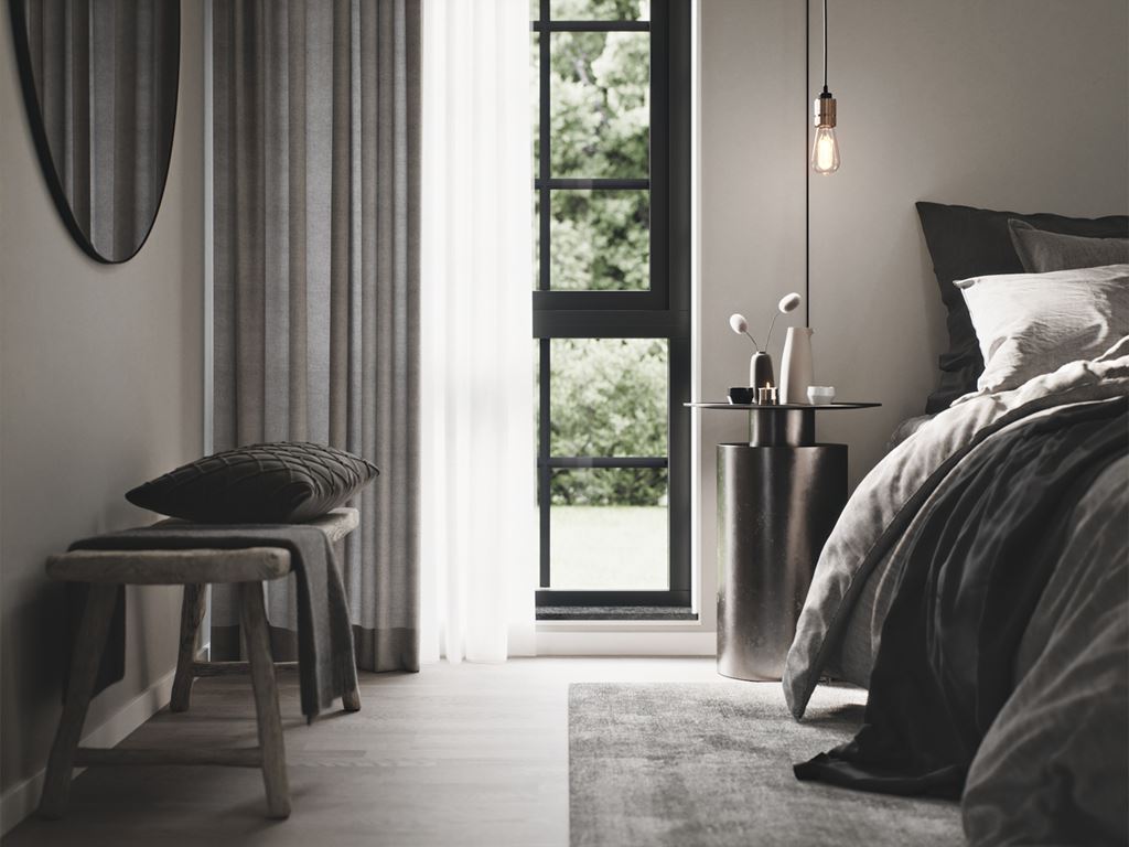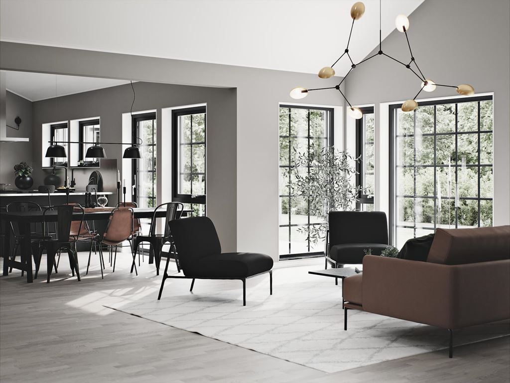 Havsbris i industriell stil bjuder på vackra kontraster. Se bara hur den grå panelen i skiftande riktning möter det stilrena plåttaket och de karaktäristiska svarta industrifönstren. En extra fin detalj är entrésidans fönsterluckor med svartmålade ribbor som skyddar mot både sol och insyn.