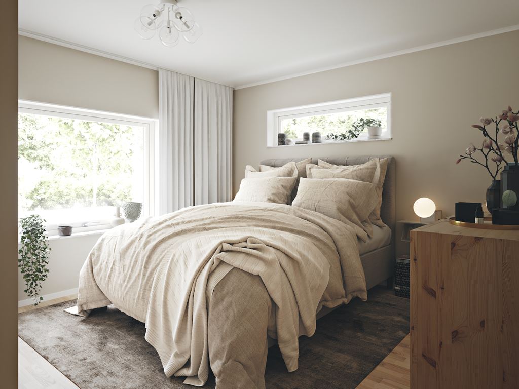 På ena sidan av husets härlighet ligger tre sovrum grupperade runt ett trivsamt allrum samt toalett med dusch. Kanske blir det barnens egen domän? Kanske vill du driva verksamhet hemma? Polstjärna är ett hus med många möjligheter. Master bedroom hittar vi istället på andra sidan av huset, i gott sällskap av badrum och klädkammare. Husets fina tvättstuga hittar vi i anslutning till entrén.