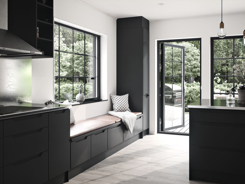 Skiffer i industriell stil bjuder på en modern tolkning av den industriella stilen: ett utmärkt exempel på kontrasternas skönhet. Se bara hur den putsade fasadens råa betongkänsla möter husets svarta detaljer, som de karaktäristiska svarta småspröjsade industrifönstren. Många och stora uppglasade fönsterpartier och ljus från flera väderstreck gör Skiffer till ett hus där varje rum badar i ljus.