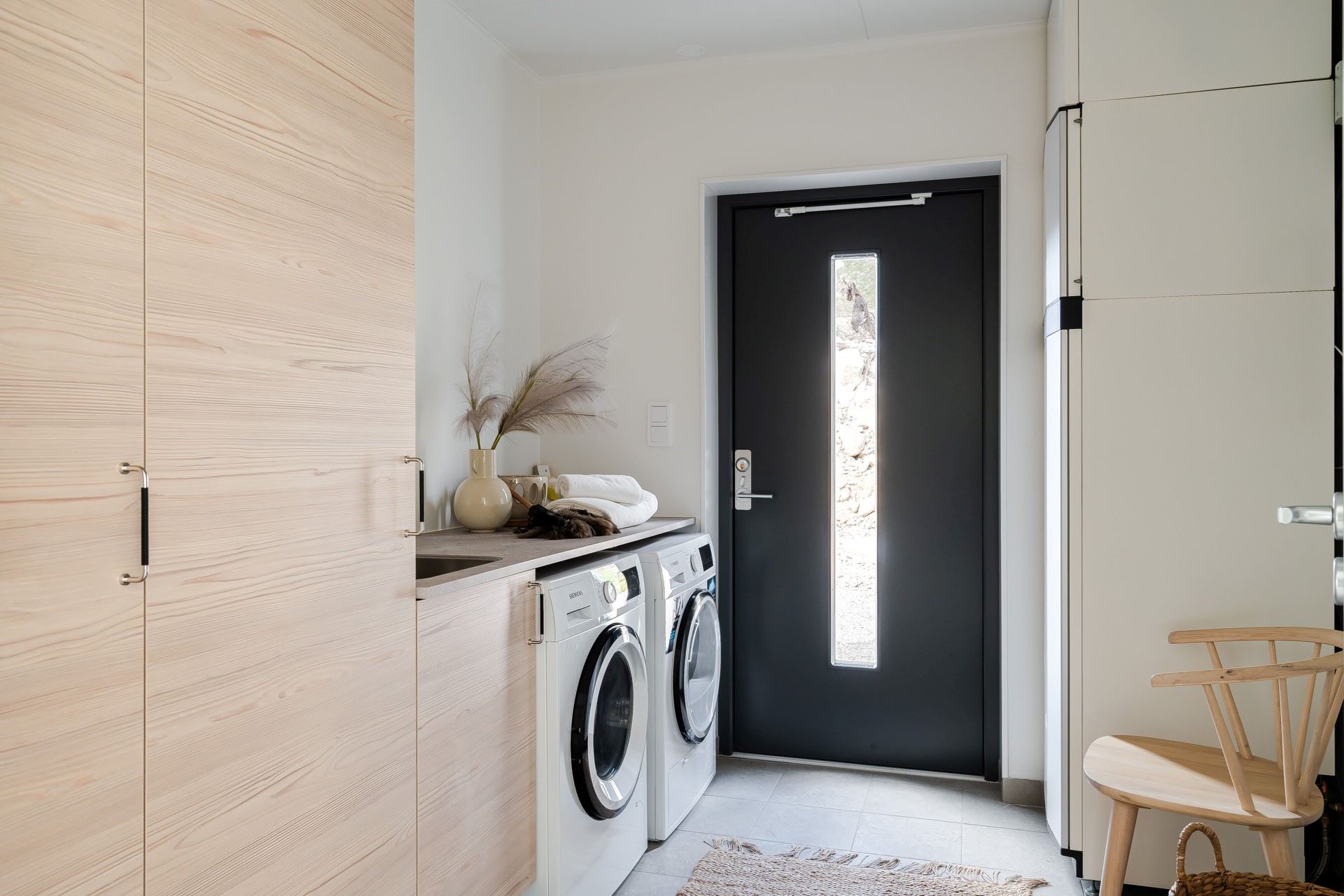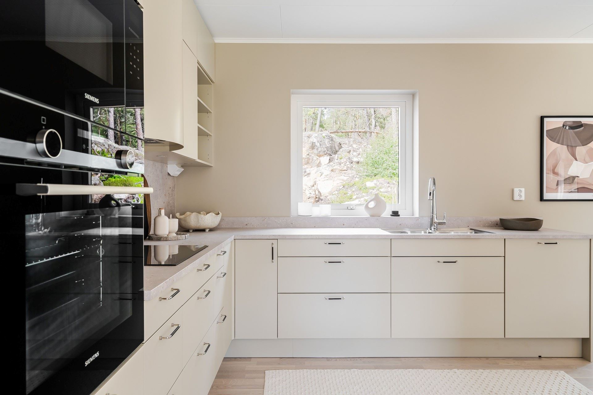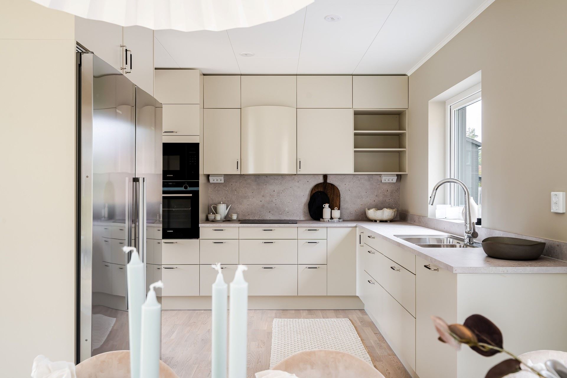 Köket från HTH går i varm beige ton med rostfria vitvaror från Siemens och generösa arbetsytor. Detaljer som fönster ovanför diskbänken och öppna hyllor gör köket både funktionellt och inbjudande.
