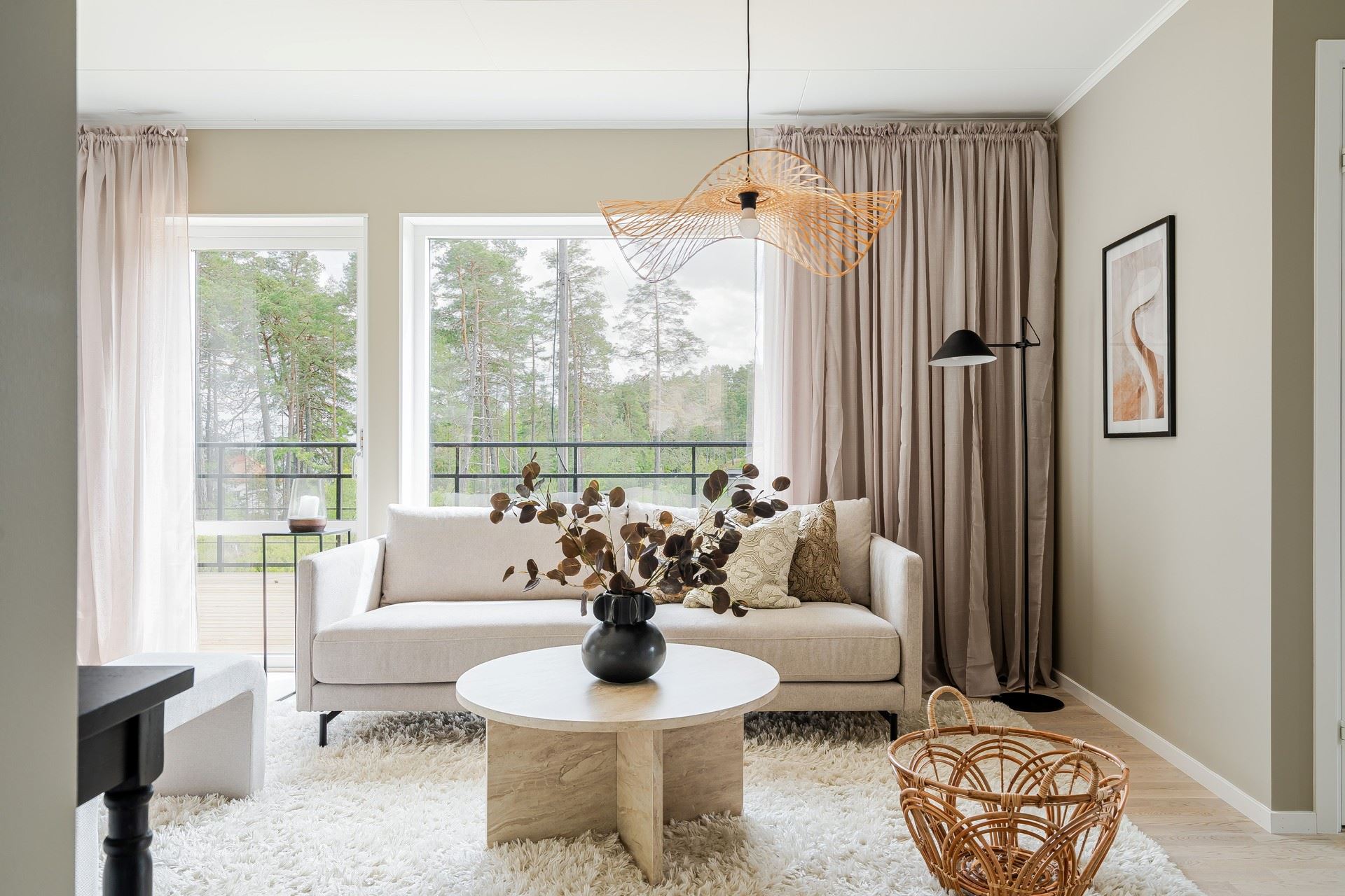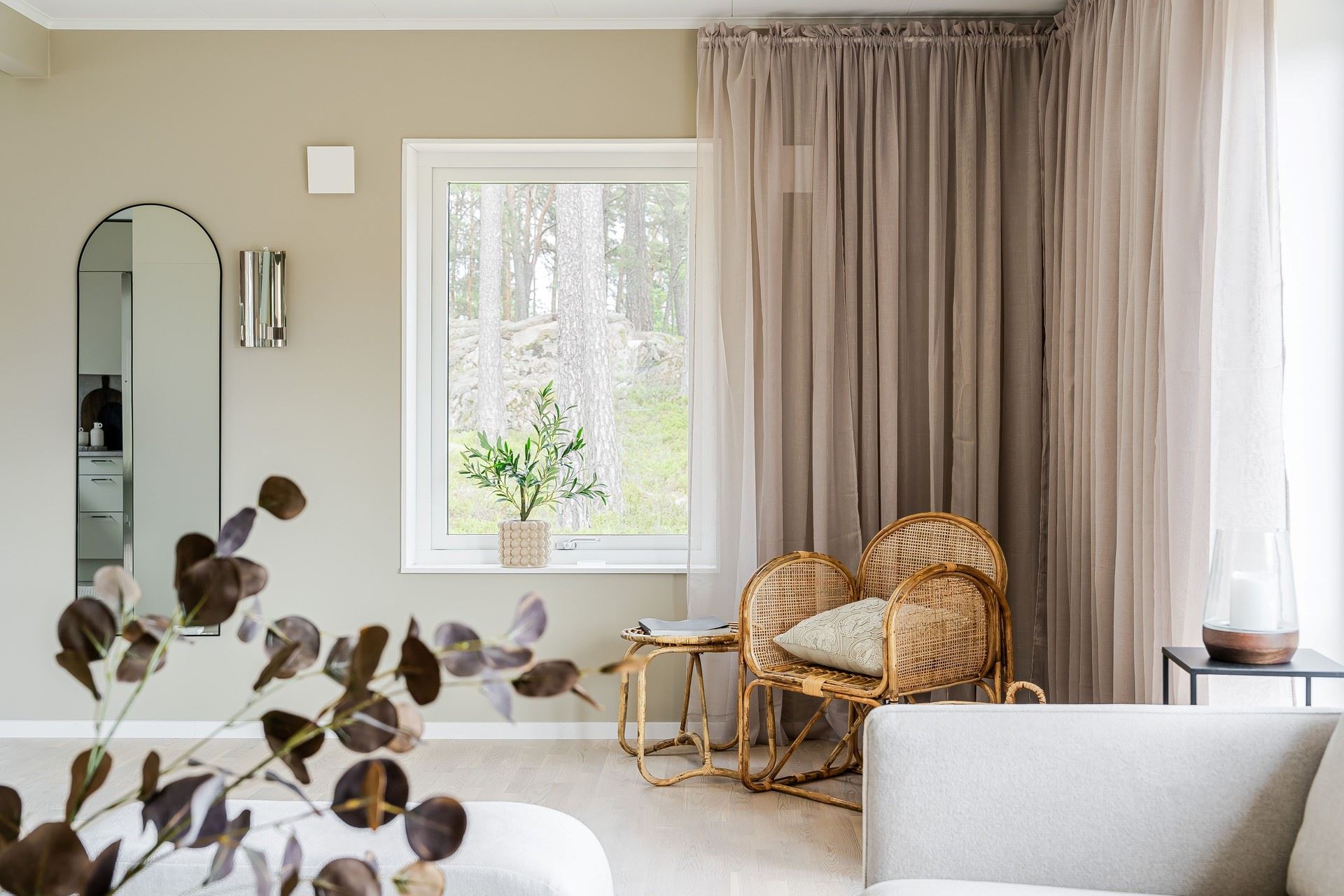 Vardagsrummet har stora fönsterpartier med utsikt över grönska – en plats att verkligen landa i. Badrummen är helkaklade med moderna detaljer från Vedum och komfortvärme på övervåningen för extra vardagslyx.