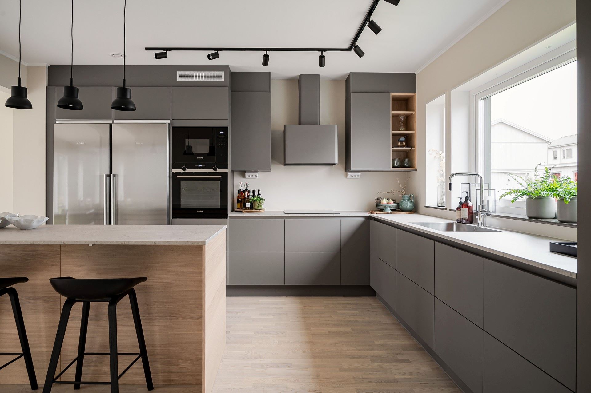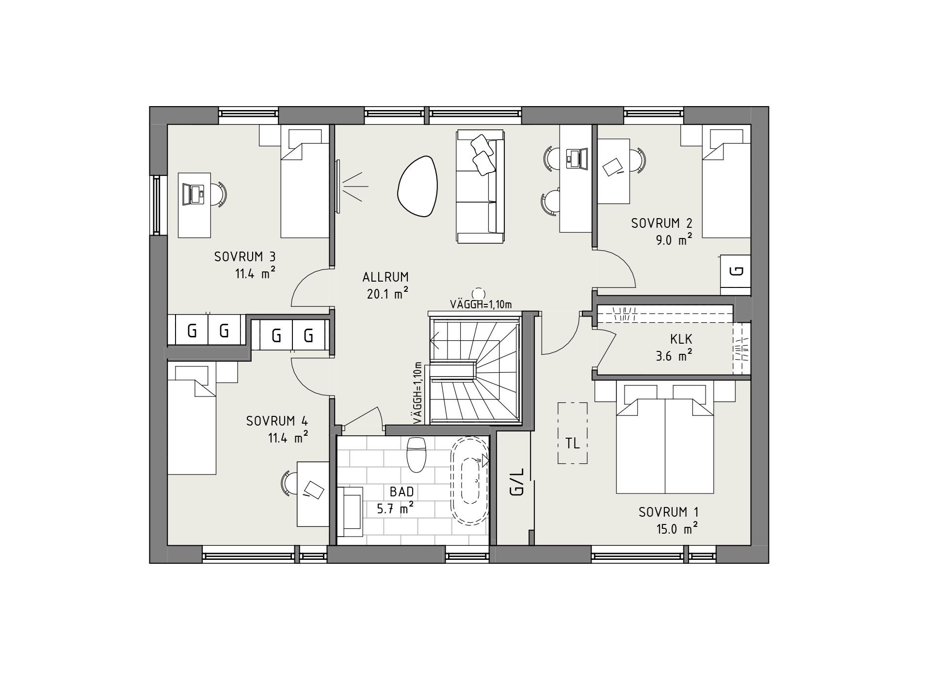Köket från HTH, placerat i vinkel, är fullt utrustat och utformat för både vardag och fest. På entrévåningen finns även en praktisk tvättstuga med groventré, och på övervåningen fyra sovrum, ett badrum och ett mysigt allrum.