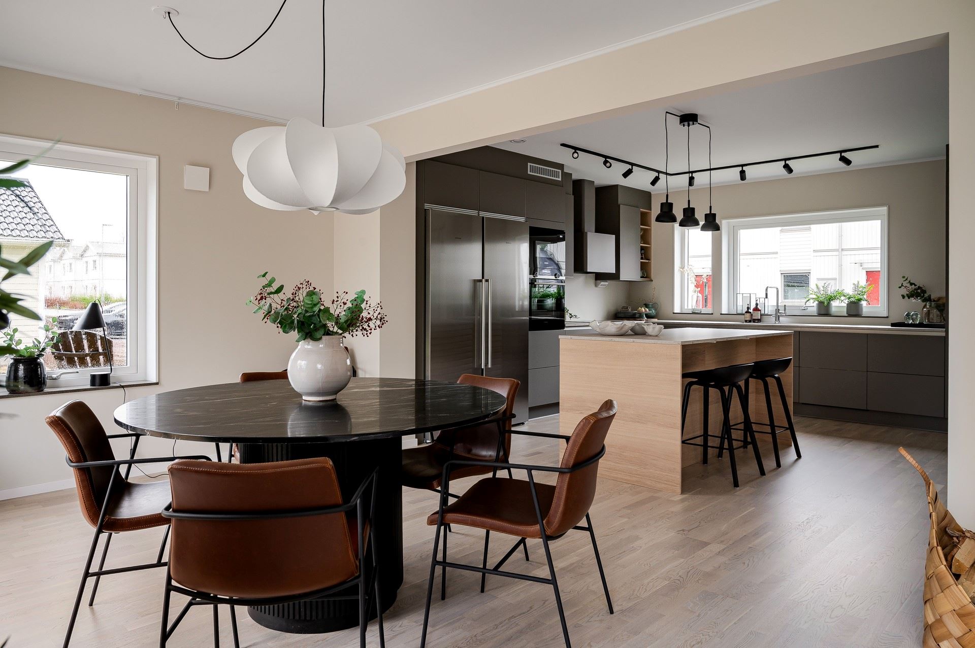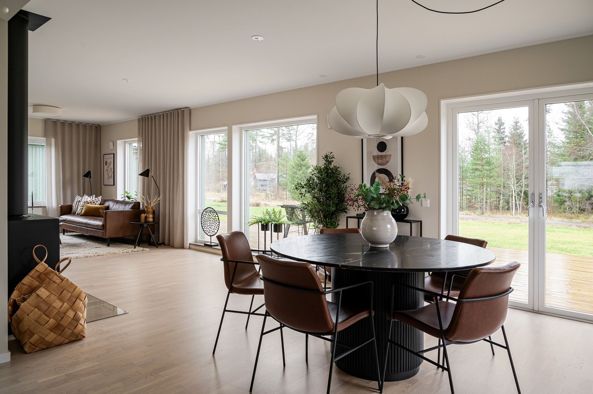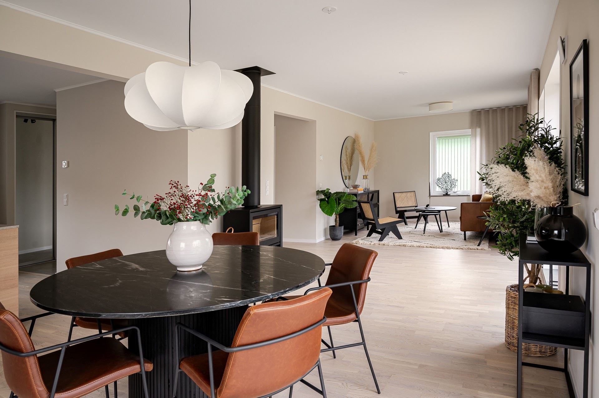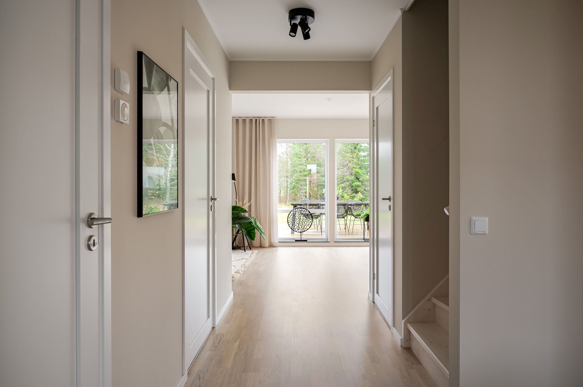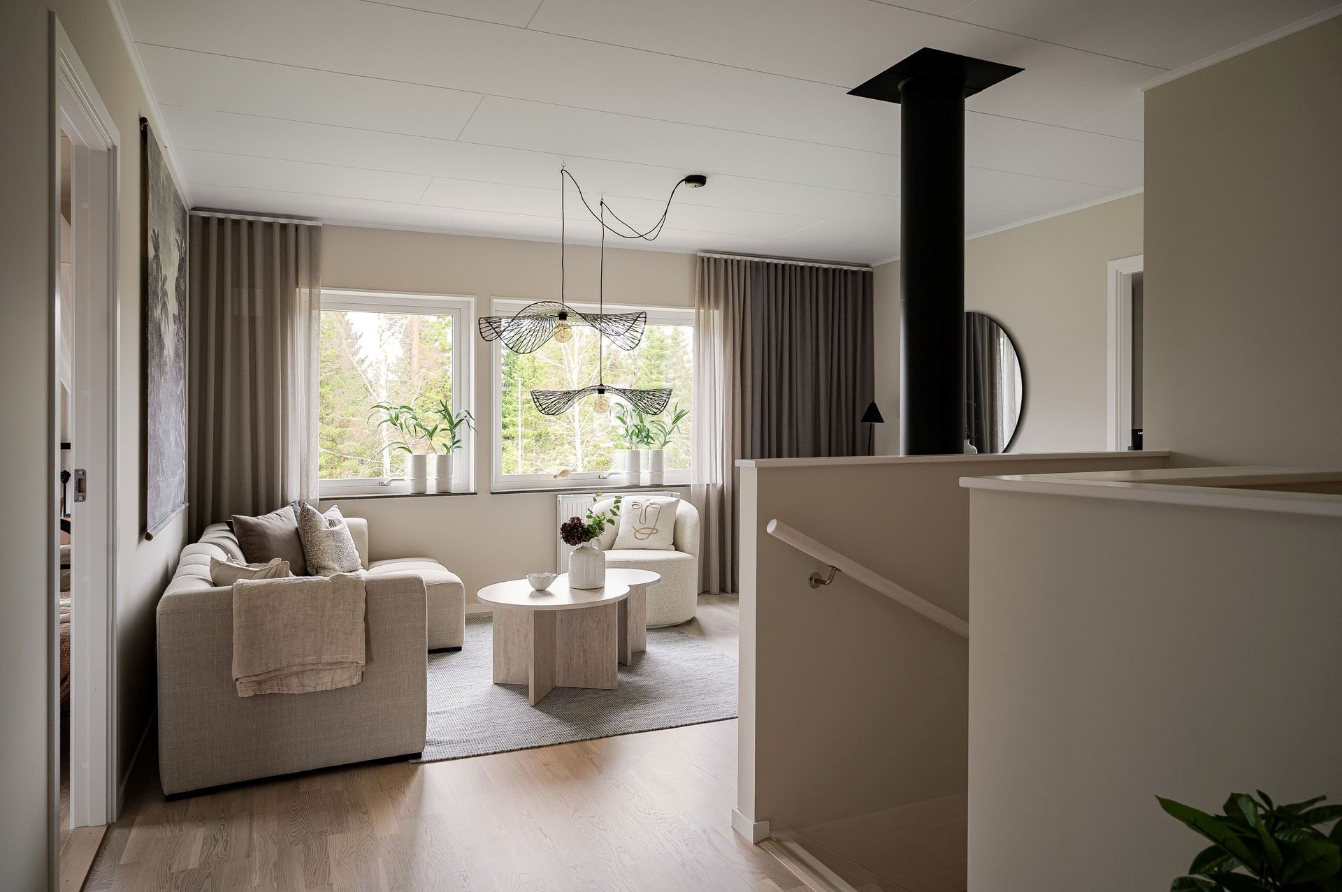 När du kliver in möts du av ett härligt ljus från vardagsrummets stora fönsterpartier. Den öppna planlösningen är social och genomtänkt, med den centrala trappan som skapar ett naturligt flöde mellan husets ytor.